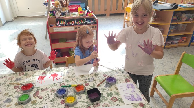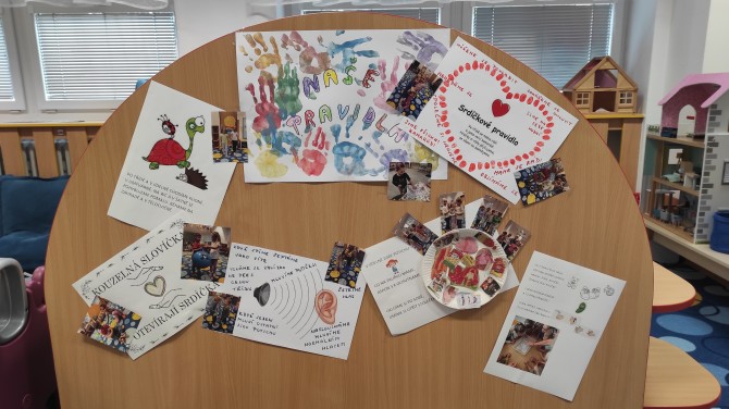Aby nám ve školce bylo fajn a chodili jsme s úsměvem, vytvořili jsme si pravidla, která nám pomohou zvládat náročné situace. Víme, že s kamarádem si pohrajeme, umíme uklízet hračky, chováme se k sobě slušně, používáme slovíčka prosím, děkuji, promiň, mytí rukou je ,,hračka", šetříme vodou, běhání a řádění si schováváme na zahradu, šetříme svoje ouška, nejsme přece paviáni, v jídelně ochutnáme, co na talířku máme. A kdybychom si přece jen nevěděli rady, tak máme pravidla vystavená ve třídě pěkně na očích.