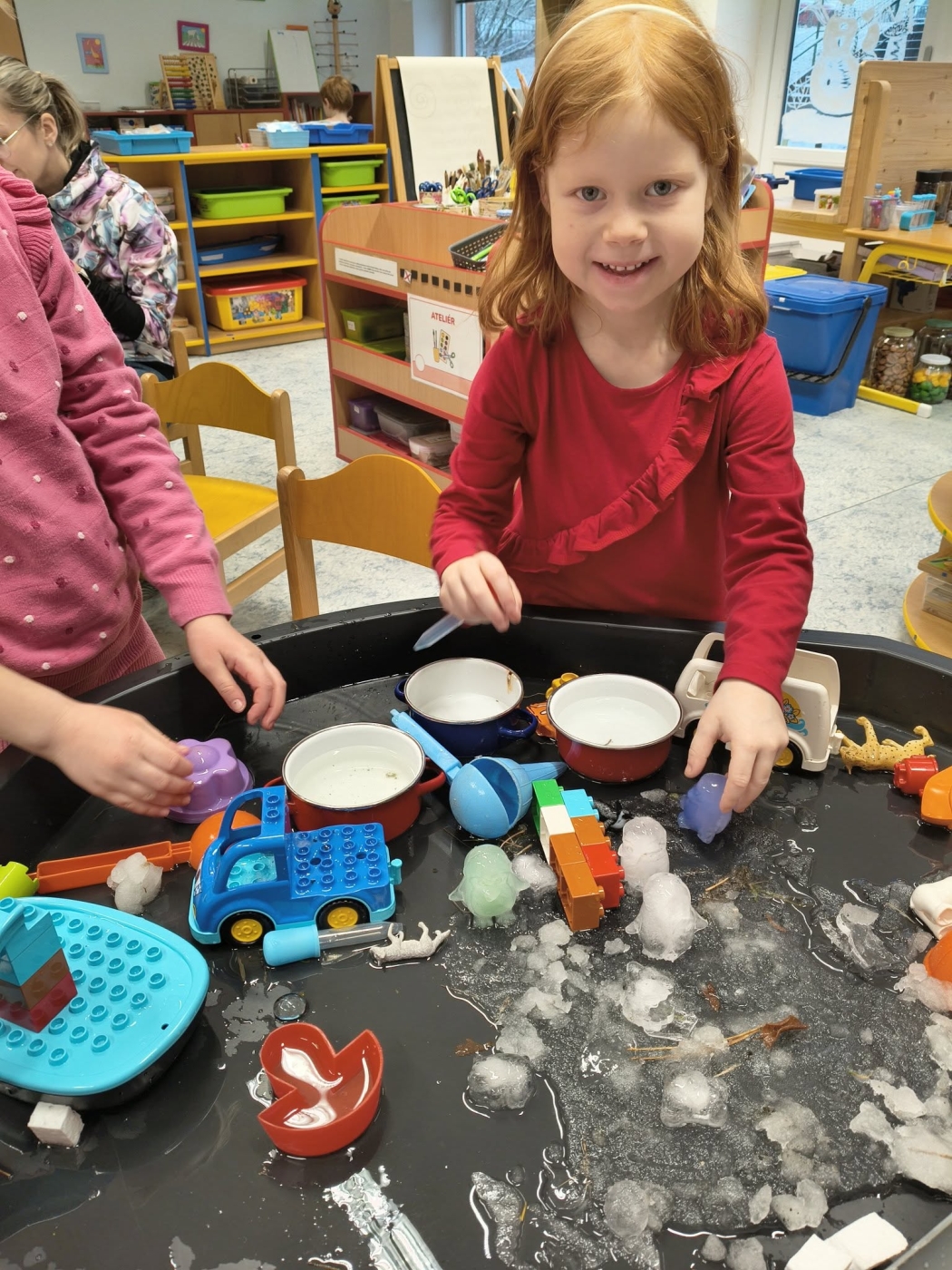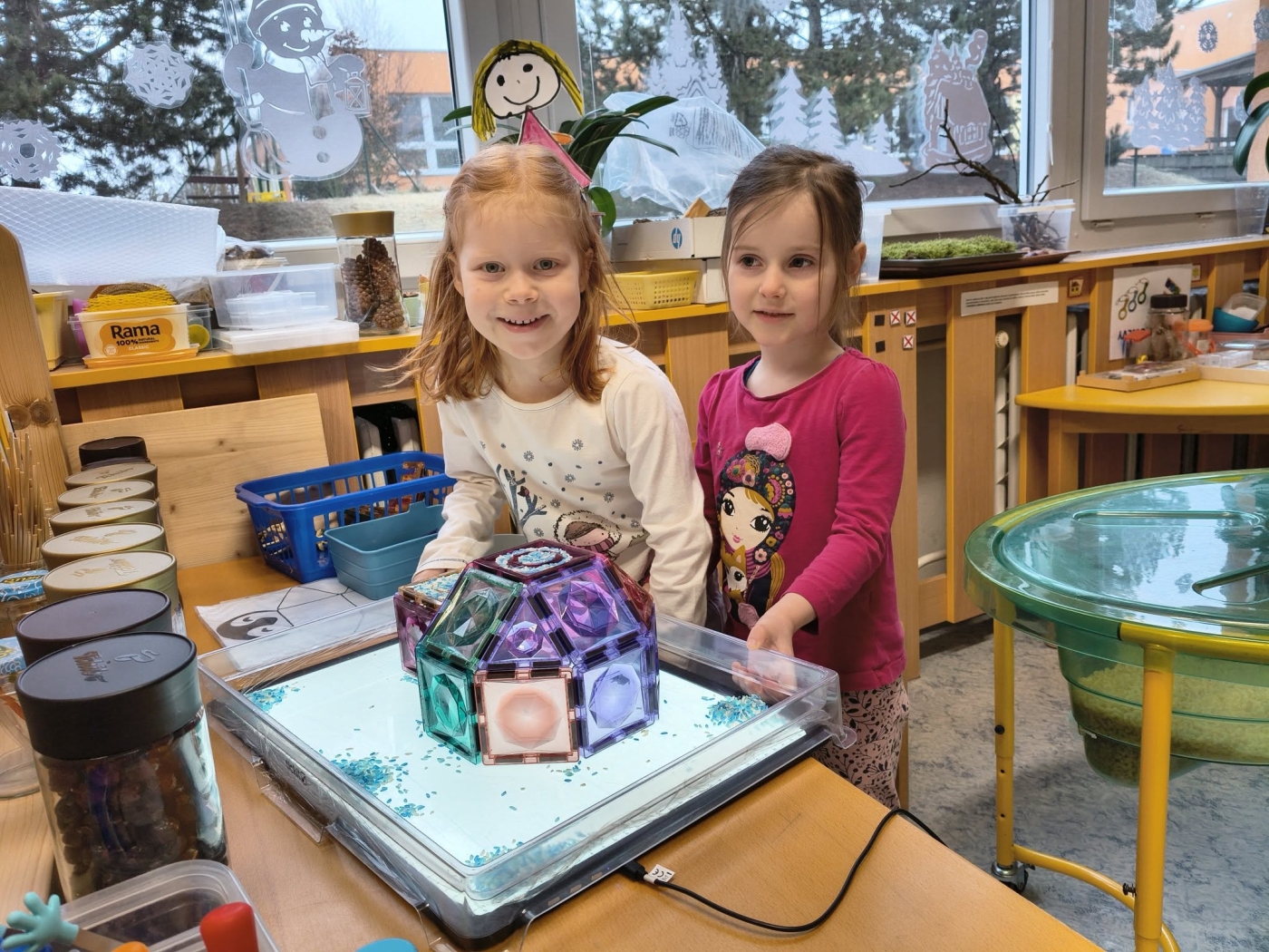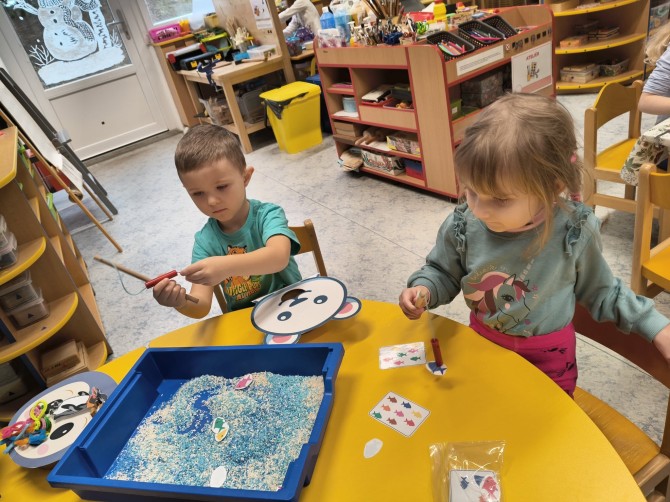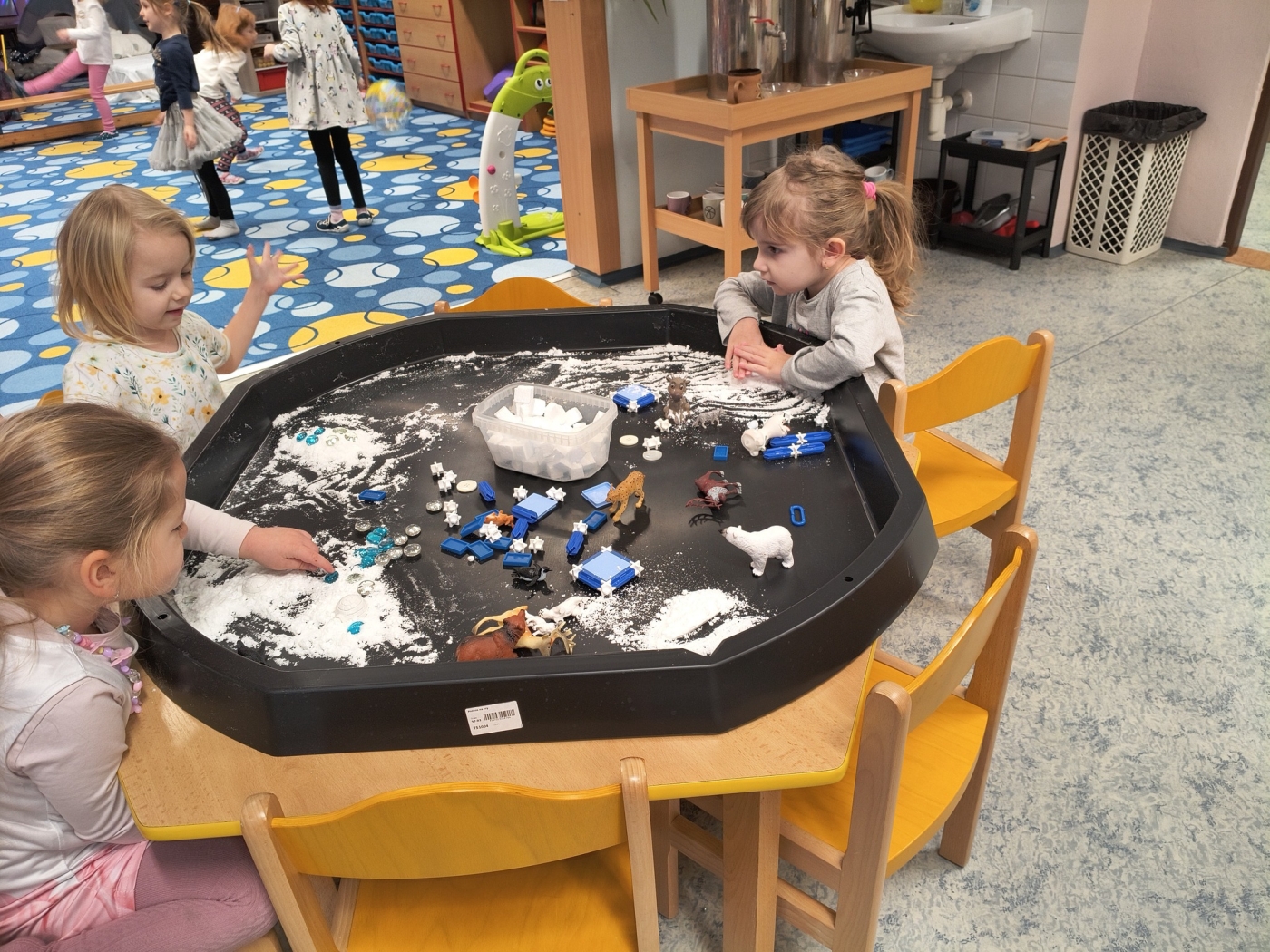 Letošní tuhá zima nás zavedla až k dalekým polárním oblastem. S dětmi jsme prožili krásný a mrazivý týden. Seznámily se se způsobem života lidí za polárním kruhem. Pozorovaly polární záři, lovily ryby, stavěly iglú, hrály si na tučňáky a lední medvědy. U dětí měl velký úspěch nově pořízený tuff tray tác, na kterém se odehrávaly hry s ledem a vyprošťování zamrzlých zvířat. Společně zvládnutá "Grónská písnička" byla pomyslnou třešničkou na dortu.