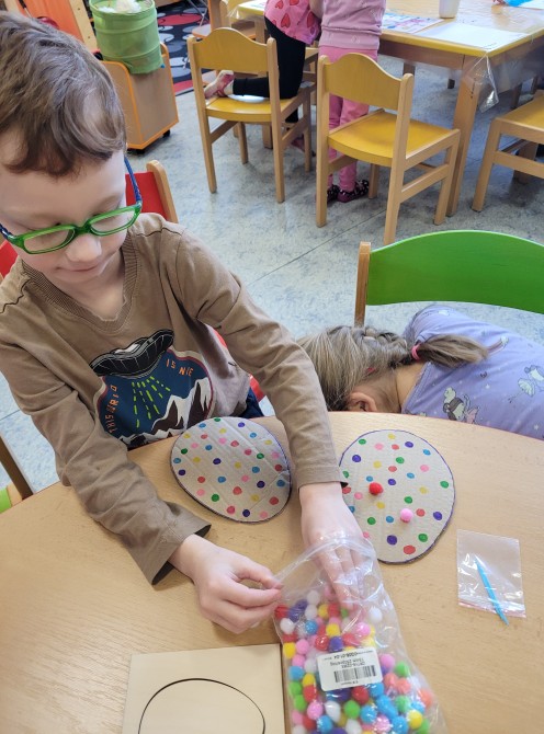 Spolu s dětmi jsme se připravovali na velikonoční svátky. Barvili jsme vajíčka zajímavou technikou, zaseli osení do kelímků a vyrobili velikonoční přáníčko. Procvičili jsme jemnou motoriku a logiku v centrech, kdy jsme pracovali s různými druhy aktivit – provlékaní šňůrky tupou jehlou, vkládání tvarů do vajíček, doplňovaní barev a další.