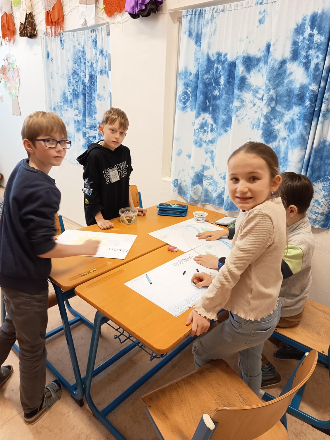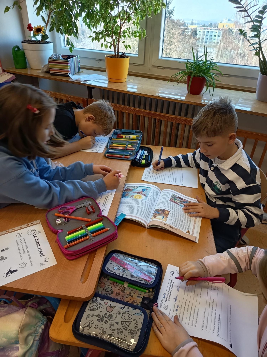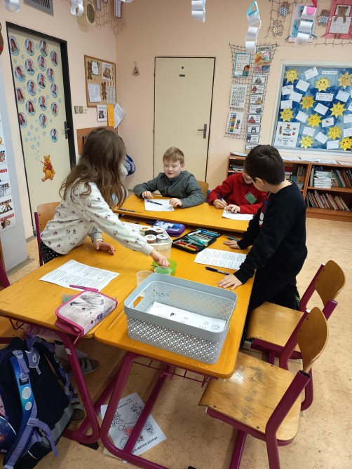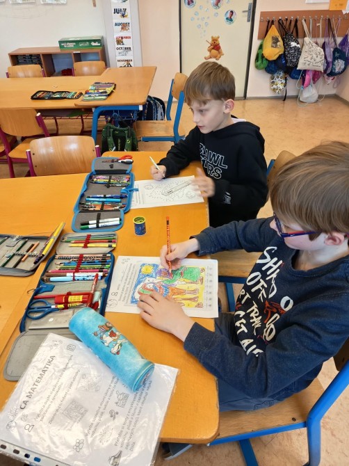 Třeťáci z 3. A si v lednových centrech aktivit vyzkoušeli zpracovat zajímavé téma Podmínky života na Zemi. V matematice trénovali přesnost v rýsování podle pravítka při spojovačce a řešili slovní úlohy o vodě, půdě, vzduchu i Slunci, v ateliéru vytvořili poutavý plakát o koloběhu vody a vlastní obrázky na téma „Voda, jak ji mám nejraději". V centru objevů je čekaly pokusy s vodou i dalšími látkami a pečlivý zápis výsledků bádání. A nechyběla ani fantazie – po čtení veselé pohádky a smutné pověsti o Slunci děti napsaly vlastní text s názvem „Den, kdy přestalo svítit Slunce". Centra nabídla pestrý program, který dětem ukázal svět kolem nás zábavně a na vlastní kůži.