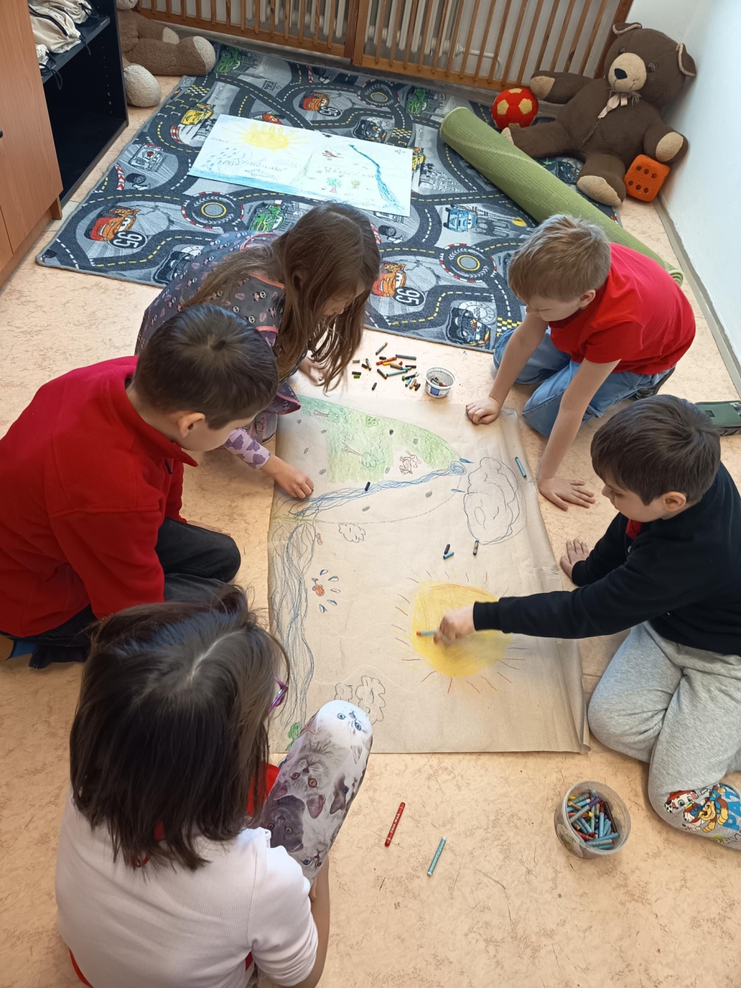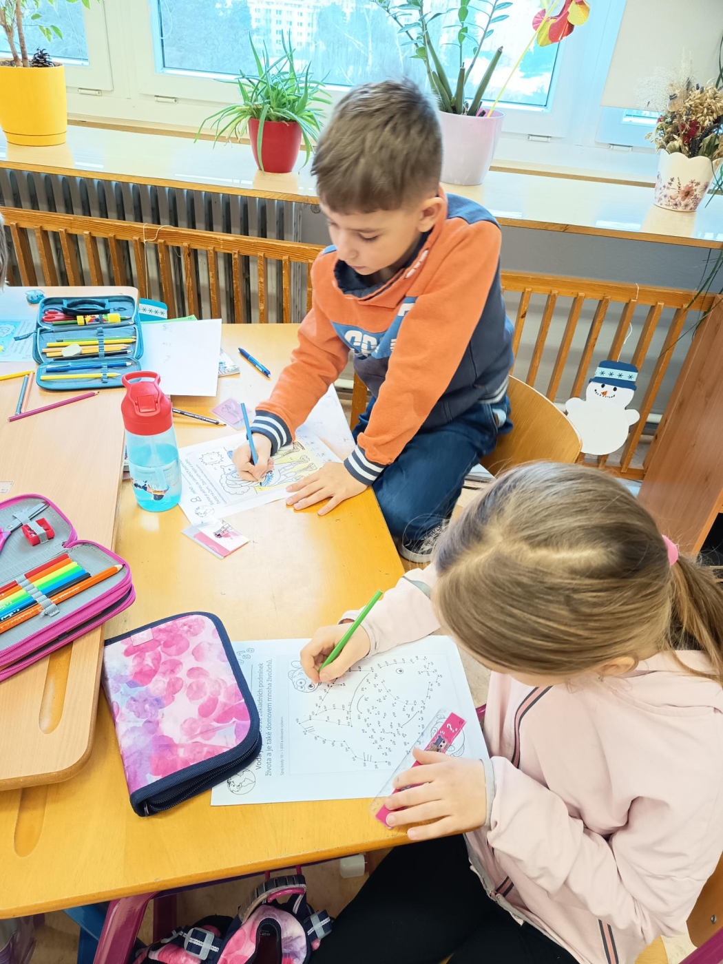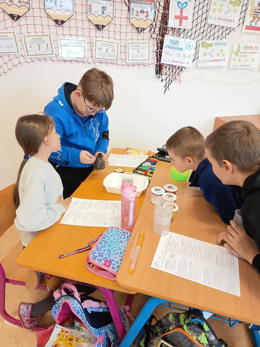 Třeťáci z 3. A si v lednových centrech aktivit vyzkoušeli zpracovat zajímavé téma Podmínky života na Zemi. V matematice trénovali přesnost v rýsování podle pravítka při spojovačce a řešili slovní úlohy o vodě, půdě, vzduchu i Slunci, v ateliéru vytvořili poutavý plakát o koloběhu vody a vlastní obrázky na téma „Voda, jak ji mám nejraději". V centru objevů je čekaly pokusy s vodou i dalšími látkami a pečlivý zápis výsledků bádání. A nechyběla ani fantazie – po čtení veselé pohádky a smutné pověsti o Slunci děti napsaly vlastní text s názvem „Den, kdy přestalo svítit Slunce". Centra nabídla pestrý program, který dětem ukázal svět kolem nás zábavně a na vlastní kůži.