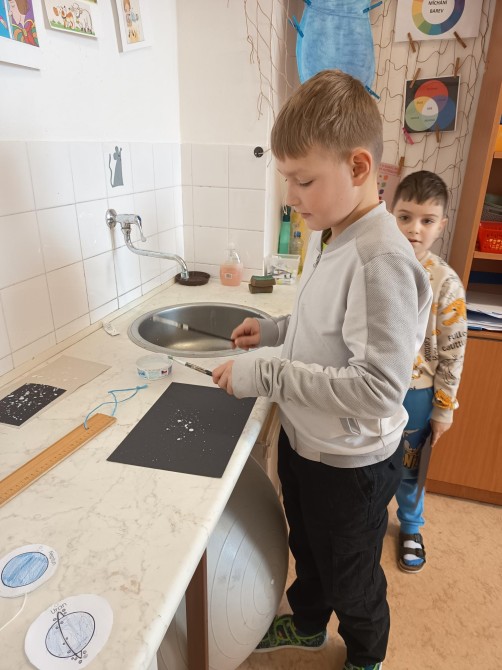 Třída 3. A se v tomto týdnu vydala na dobrodružnou cestu vesmírem a v centrech aktivit poznávala Sluneční soustavu, Měsíc i svět fantazijních planet. V matematickém centru žáci luštili násobilkovou tajenku a rýsovali útvary podle osové souměrnosti, v ateliéru tvořili obrázky astronautů a vlastní modely Sluneční soustavy. V centru objevů zhlédli video o Měsíci a přemýšleli o rozdílech v gravitaci na Zemi a na Měsíci, zatímco v centru čtení a psaní se seznámili s Malým princem a vymýšleli novou planetu, kterou by mohl navštívit. Celý týden se nesl v duchu zvídavosti, tvořivosti a radosti z objevování a děti získaly mnoho nových poznatků napříč předměty.