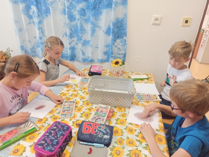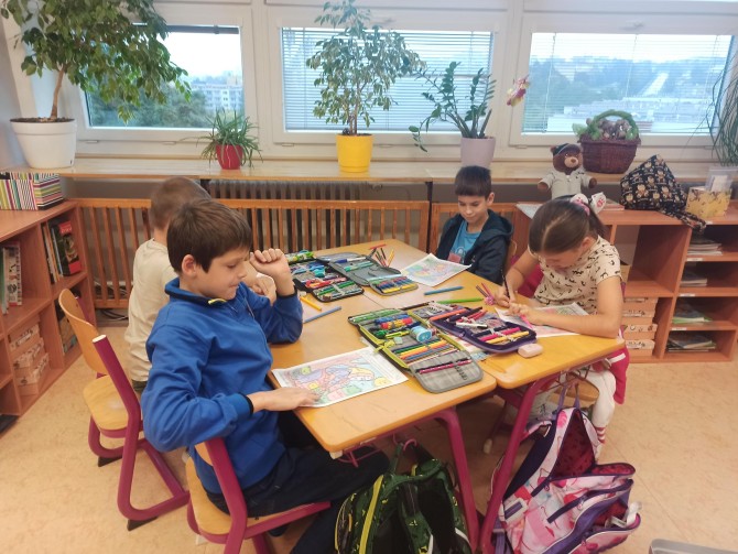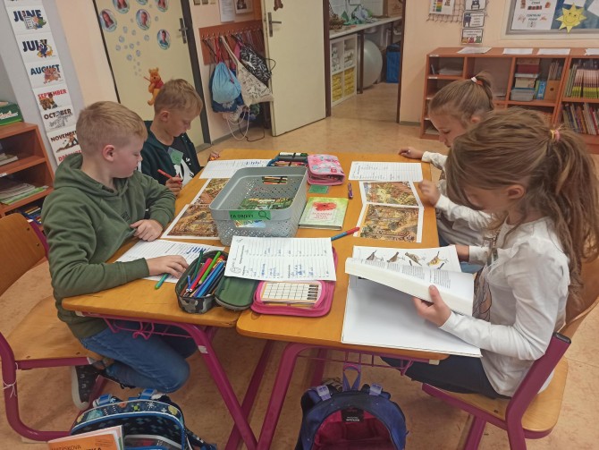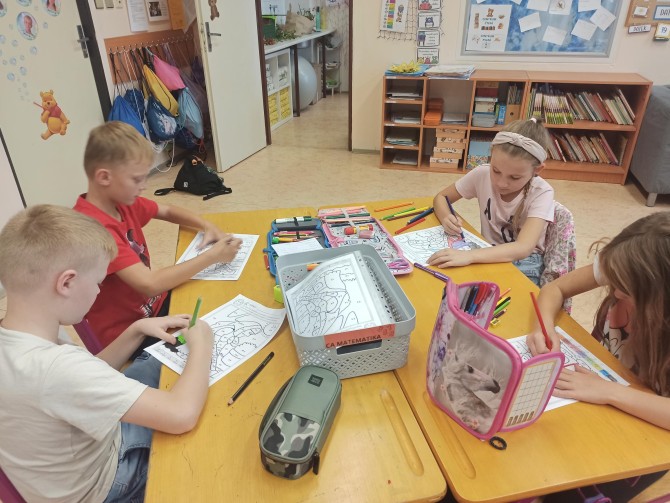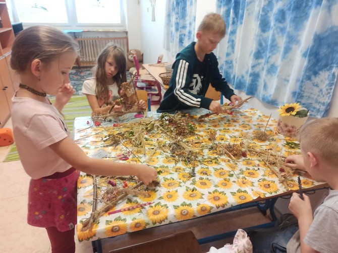 V tomto týdnu se třída 3.A rozloučila s létem prostřednictvím tematických center aktivit. Děti se ponořily do podzimní atmosféry a učily se napříč předměty hravou formou. V centru čtení a psaní si přečetly pohádku o víle Amálce, jak léčila ježkovi tlapku. Vyplnily k pohádce pracovní list a napsaly vlastní příběh o ježkovi, každý s originálním nápadem. V matematice řešily podzimně laděné slovní úlohy, pracovaly s počítacími pyramidami a užily si barevné počítání, které rozvíjelo nejen matematické dovednosti, ale i pozorovací schopnosti. V centru objevy poznávaly zvířata a rostliny z podzimního lesa a zahrady, učily se je pojmenovávat a diskutovaly o změnách, které podzim přináší. V centru ateliér společně malovaly suchými pastely slunečnice do jedné velké vázy a vyráběly závěsnou dekoraci z přírodnin.