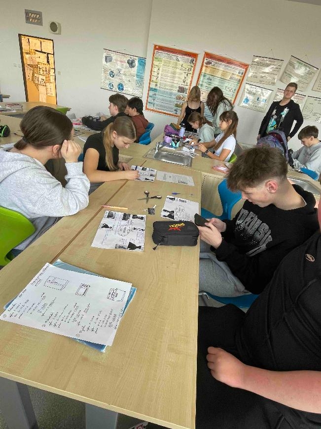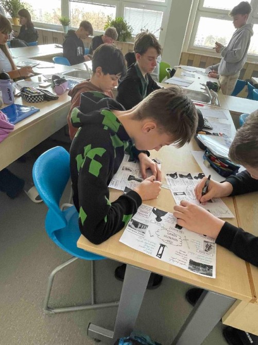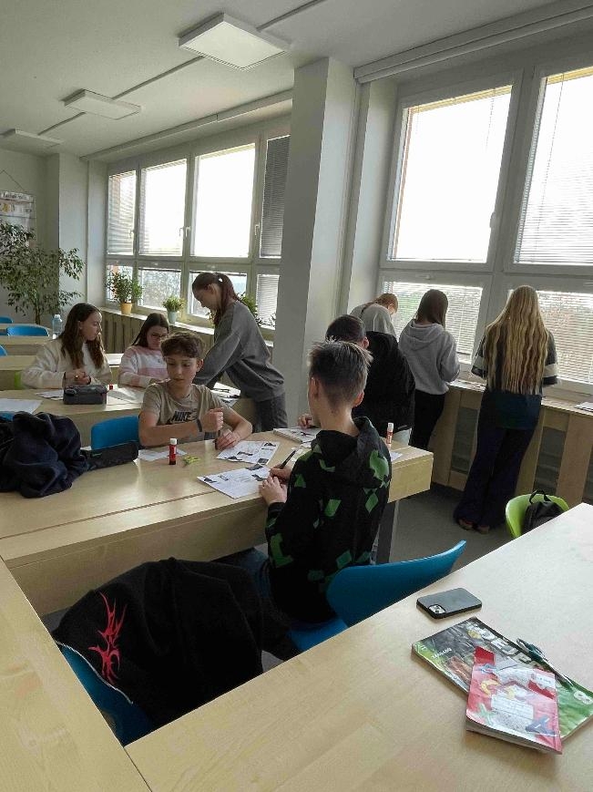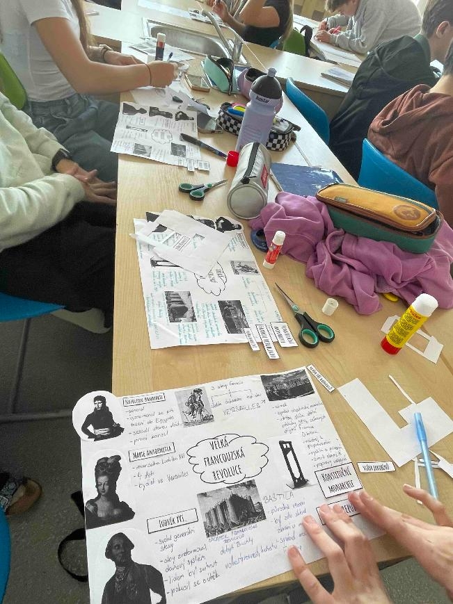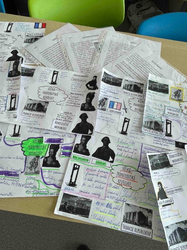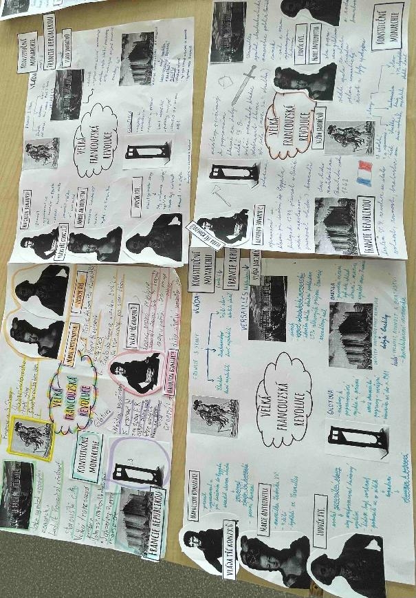 Na začátku hodiny dějepisu jsme se rozdělili do 6 skupin, dostali jsme obrázky, které jsme si vystřihli a nalepili na papír. Ve třídě bylo připraveno 6 stanovišť s textem. Našim úkolem bylo všechna stanoviště obejít a vypsat si k obrázkům nejdůležitější informace z textu. Ve skupině jsme museli spolupracovat, rozdělit si úkoly, abychom všechno stihli. Museli jsme být rychlí. Na každém stanovišti jsme byli 6 minut. Hodinou, kdy jsme byli v pohybu, jsme si připomněli: Marii Antoinettu s Ludvíkem XVI. Tři stavy ve Francii, Versailles, průběh francouzské revoluce, využívání gilotiny a počátek vlády Napoleona Bonaparte. Hodina se nám líbila a práce se nám podařila.