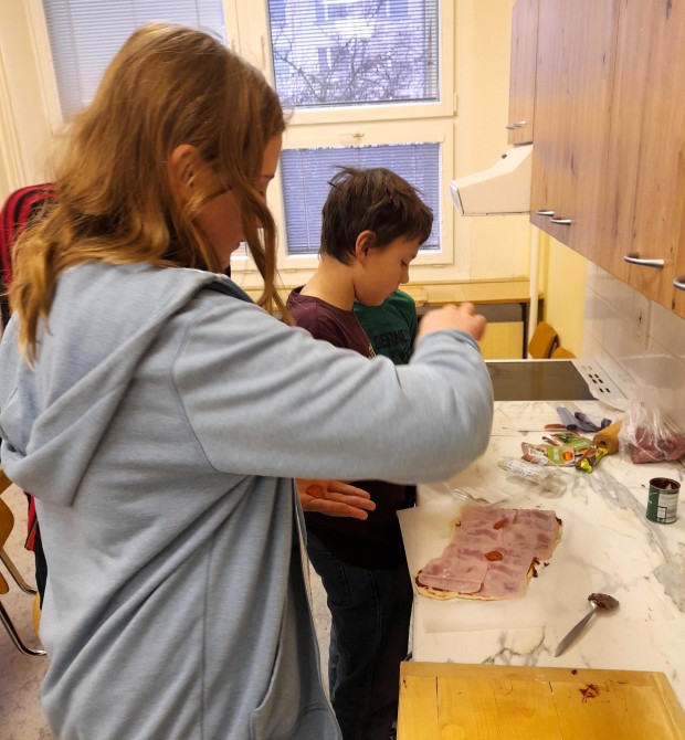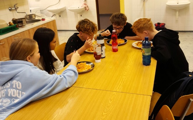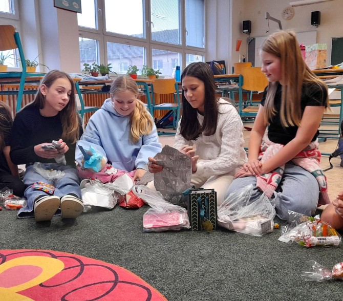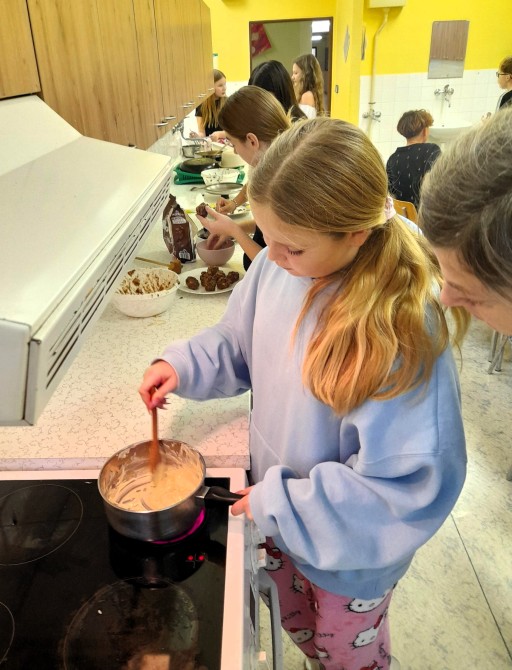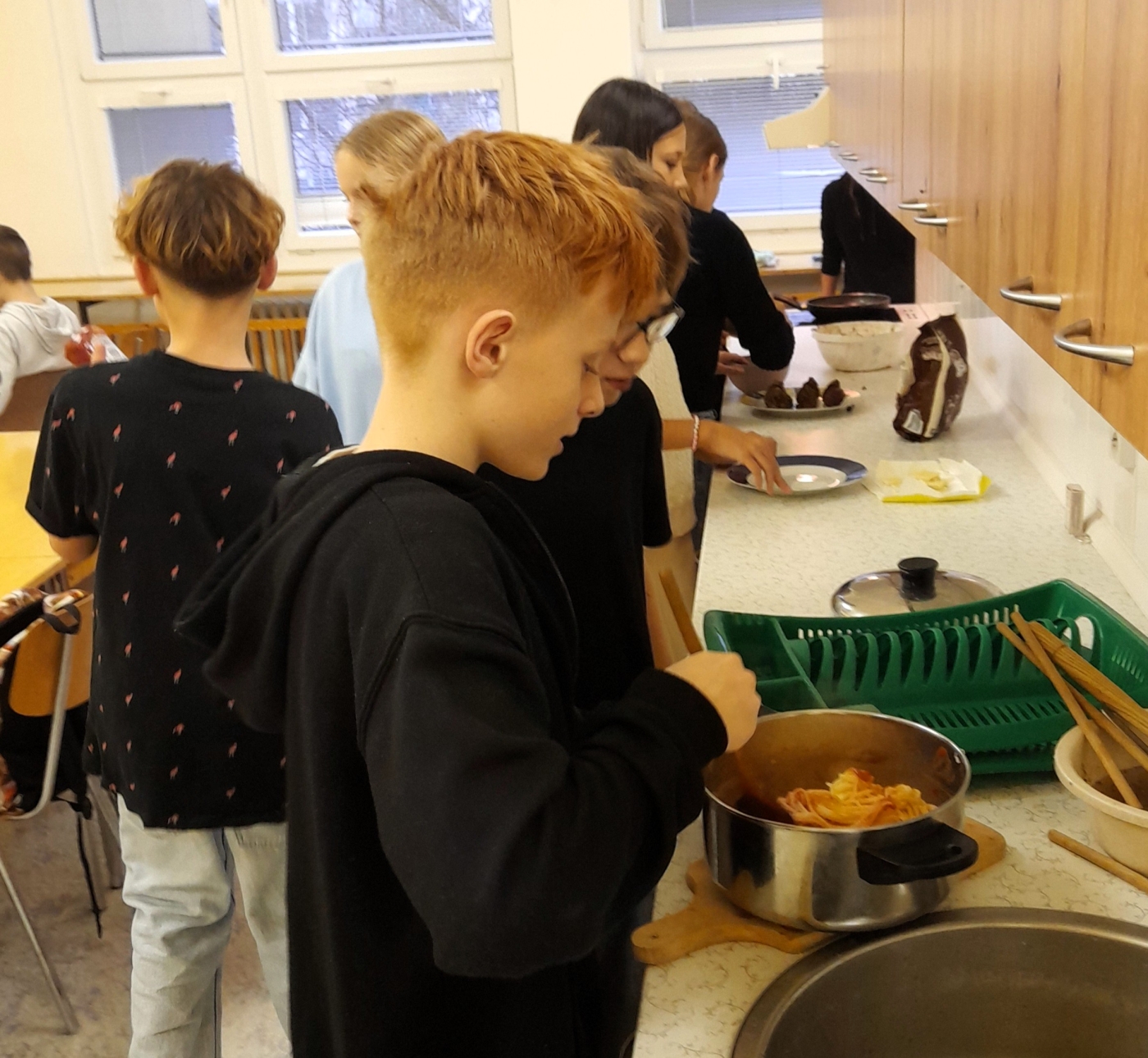 Sice s batohy, ale tentokrát se surovinami na vaření a pečení, ale také s dárečky. Tak přicházeli žáci a žákyně 6. A poslední školní den v roce 2025. Nejprve jsme se sešli v kuchyňce, abychom si připravili drobné občerstvení. Někdo si upekl domácí pizzu, někdo se pustil do nepečeného cukroví, ale došlo i na špagety. Pizza se hodila jako občerstvení k filmu Sám doma 2, ale objevil se i popcorn, zkrátka jako v kině. A pak už hurá rozdávat dárky a povídat si o Vánocích ve světě a doma. Ještě závěrečná fotografie, vynikající svíčková k obědu a Vánoce mohou začít. Přejeme krásné prožití vánočních svátků a hlavně...aby nikdo o Vánocích nezůstal sám.