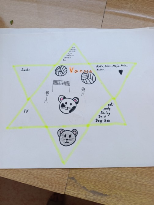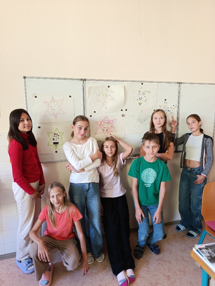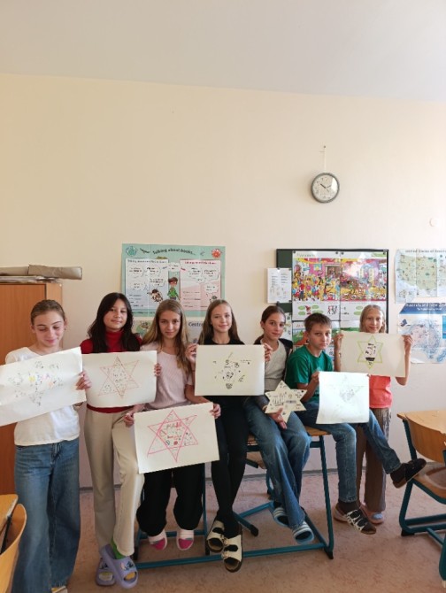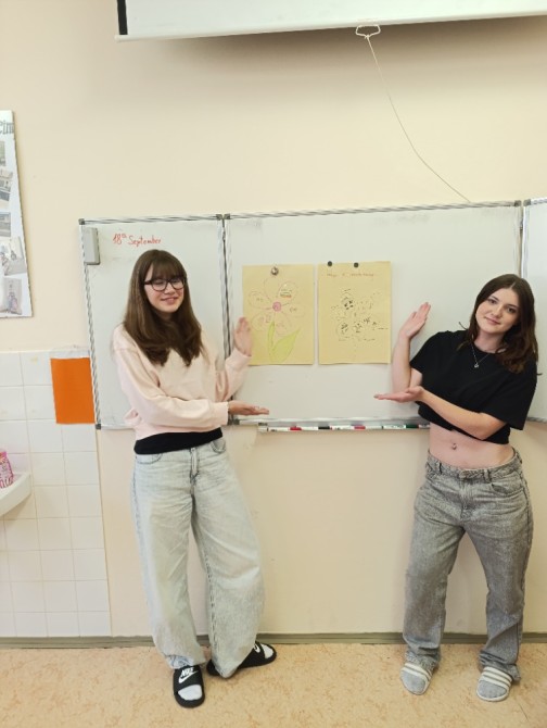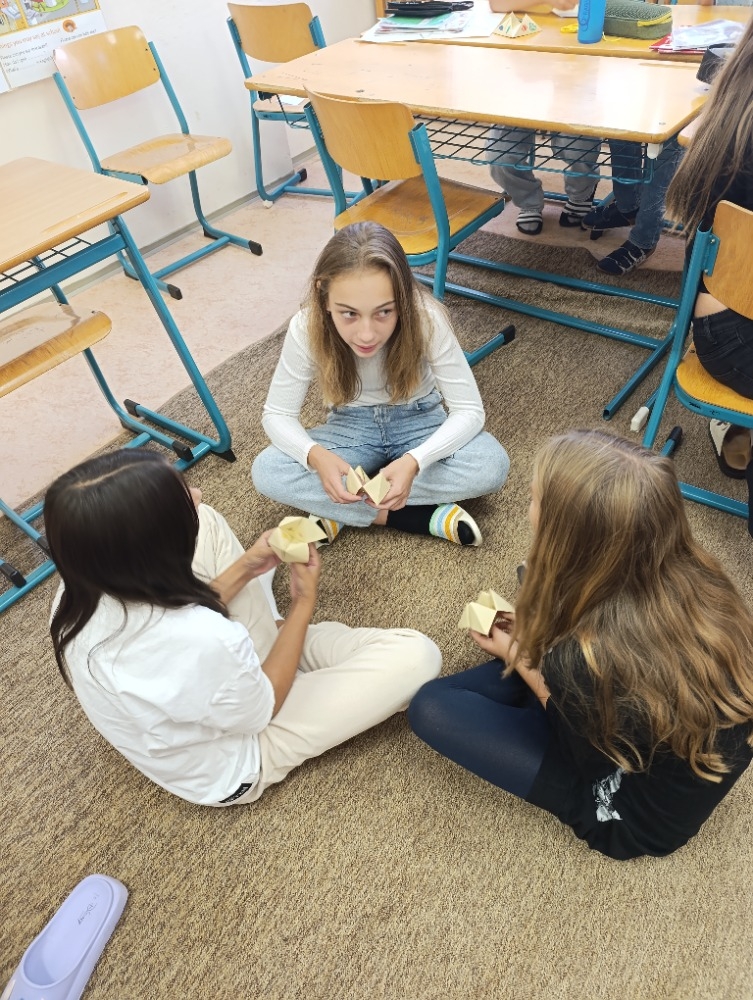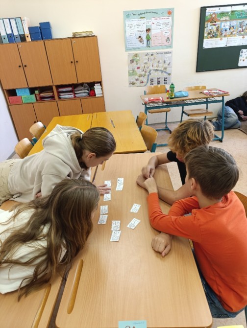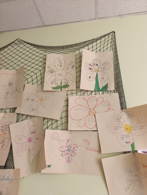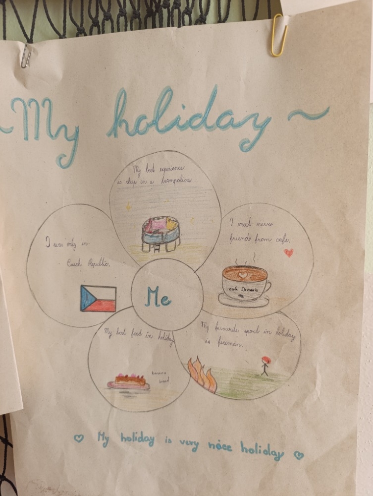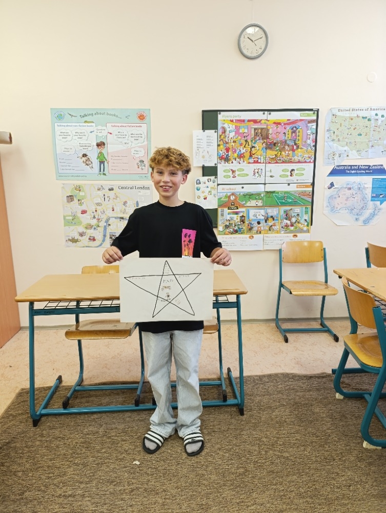 Pátá třída trénuje slovesa, šestá třída prezentuje About me a vyrábí skládačky k rozmluvení ve dvojicích. Sedmáci běhají Laufdiktát a vyrábějí kalendáře na zapamatování si dnů v týdnu. Osmáci vzpomínají na zážitky z prázdnin a vyrobili květinovou louku a devátá trénuje gramatiku a prezentuje též jak německy tak anglicky.