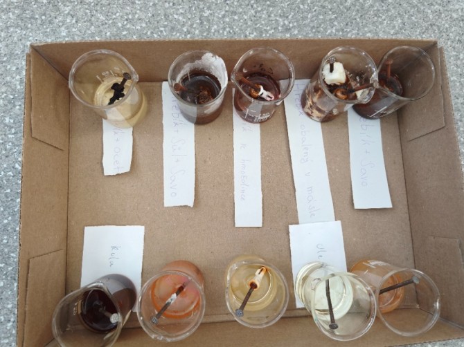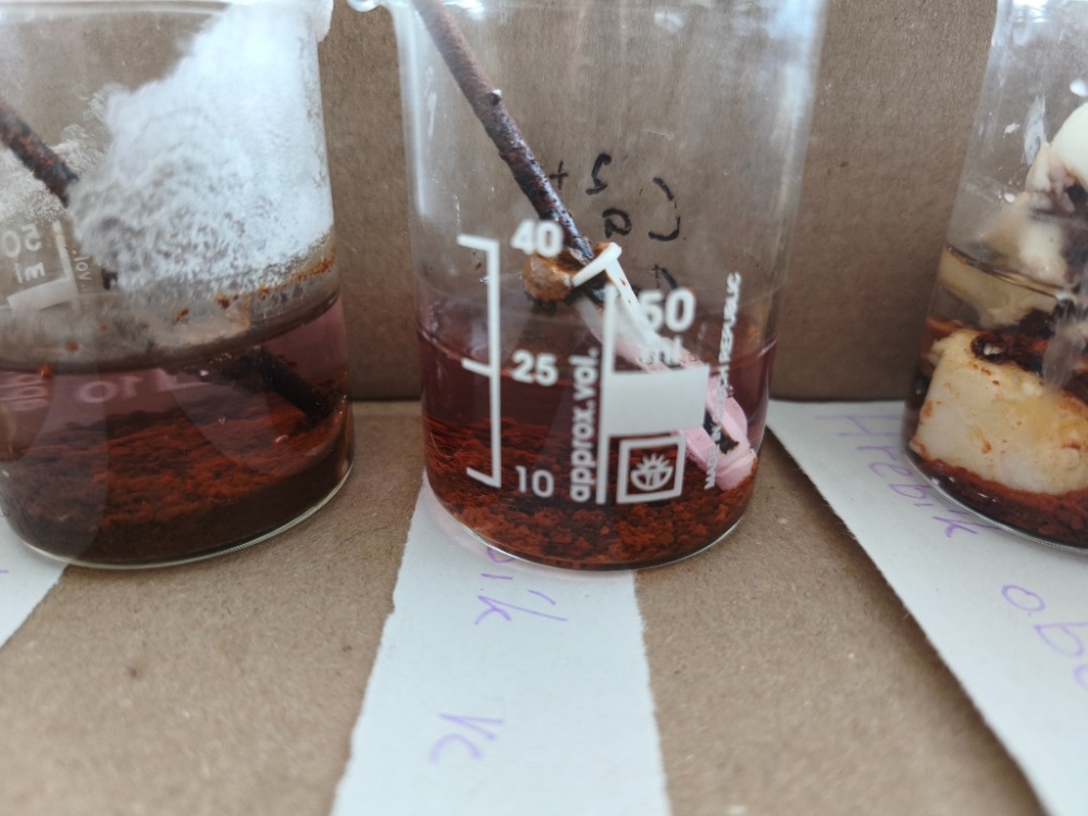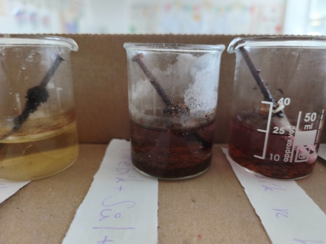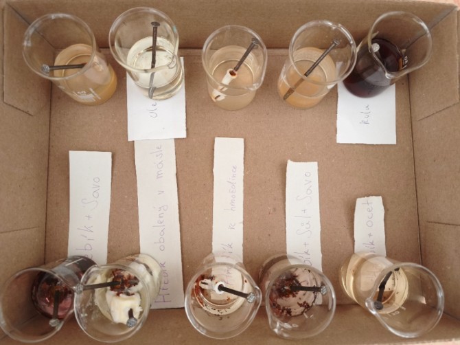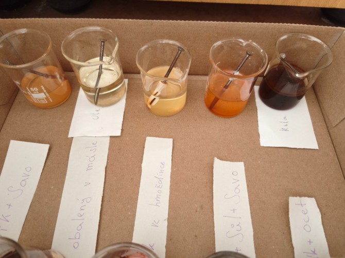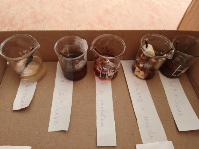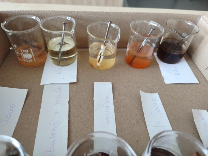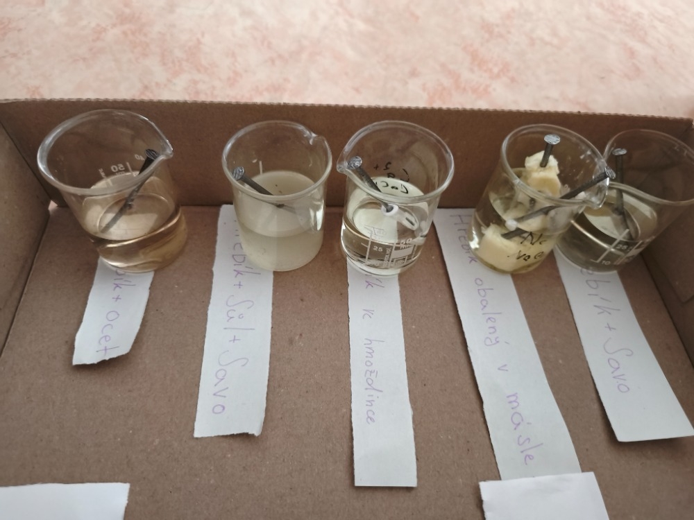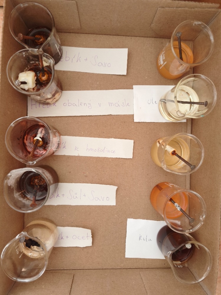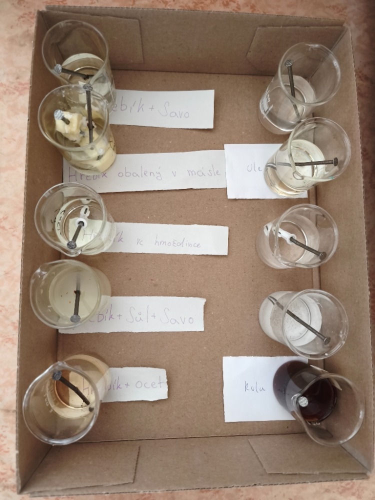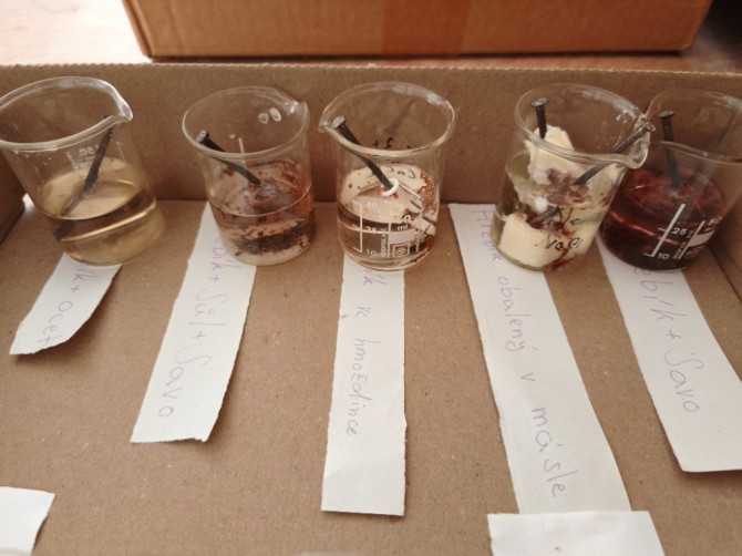 V hodinách chemie se žáci 9. ročníku věnovali badatelsky orientované laboratorní práci na téma koroze. Společně připravili pokusy, při nichž byly železné hřebíky vystaveny různým podmínkám (voda, slaná voda, ocet, Coca-Cola, olej, Savo...), případně byly chráněny (např. obalením máslem či omezením přístupu vzduchu).