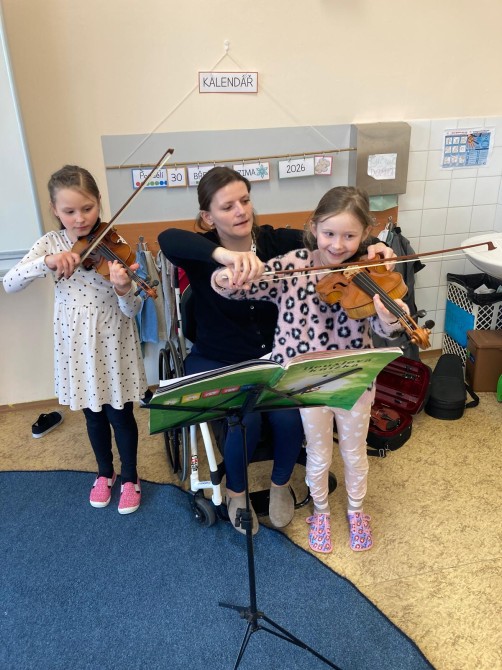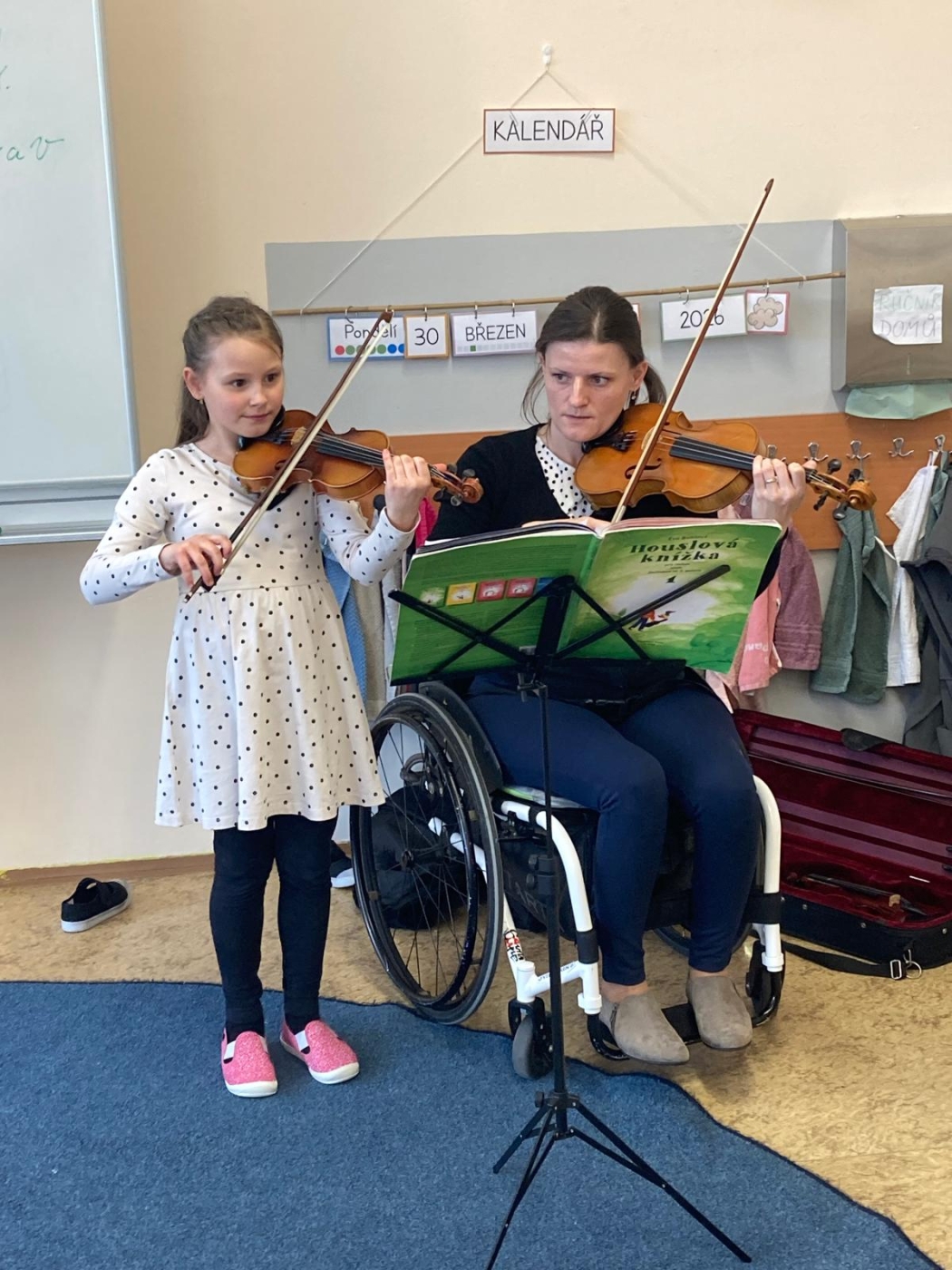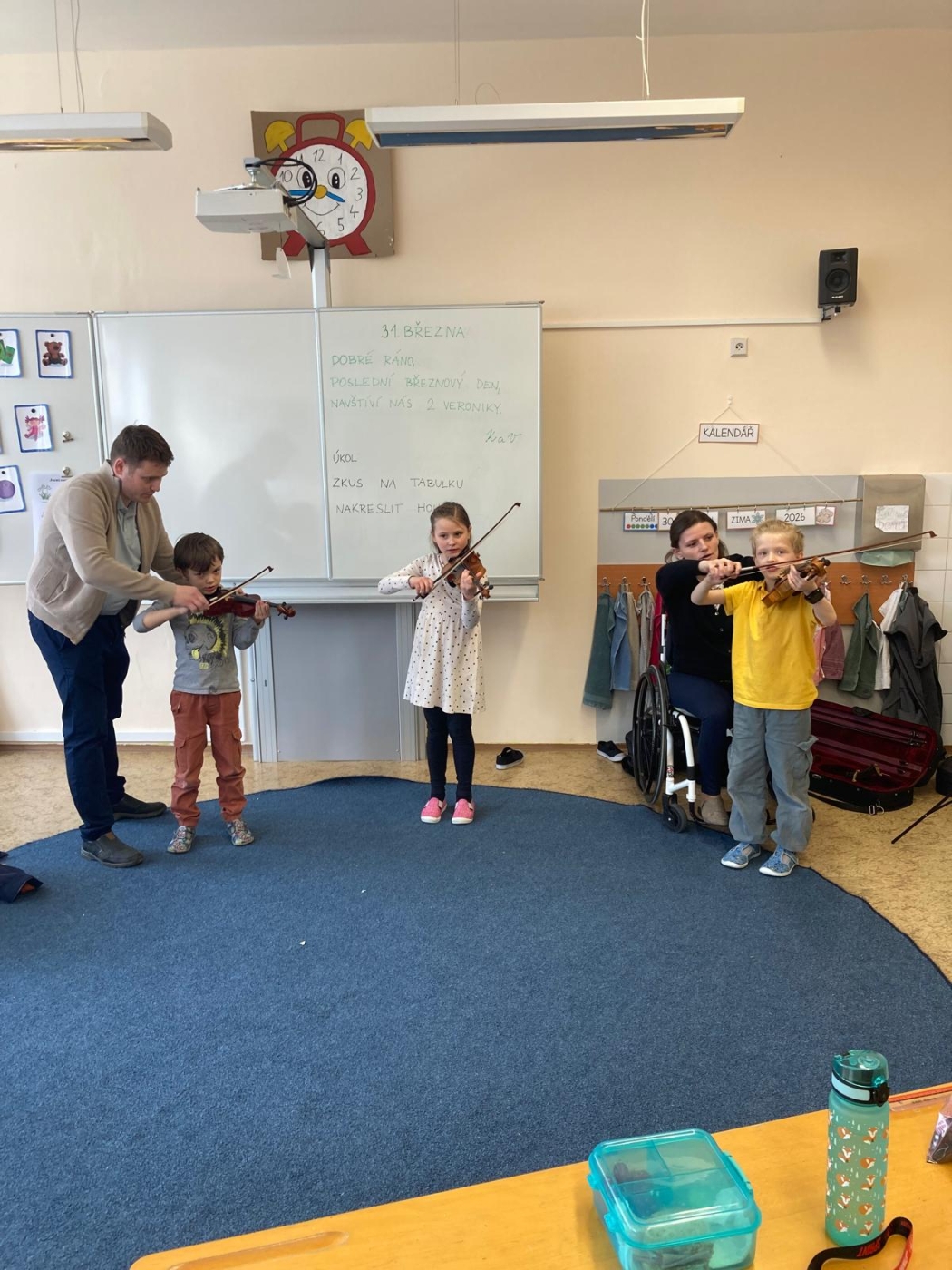 Poslední březnový den,nesedíme v lavicích jen.Máme návštěvu milou,zvuk houslí se nese třídou.Zkoušíme si také zahrát,no, nebyl to skvělý nápad?