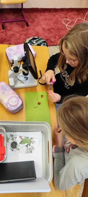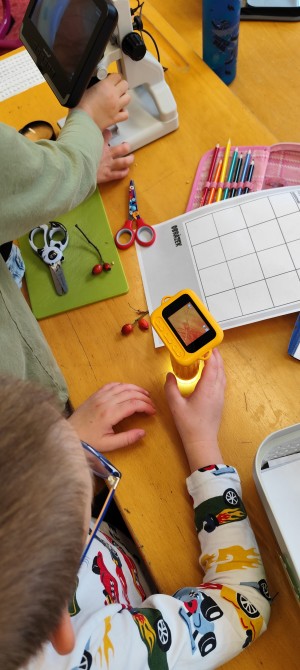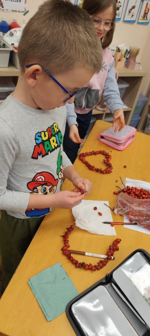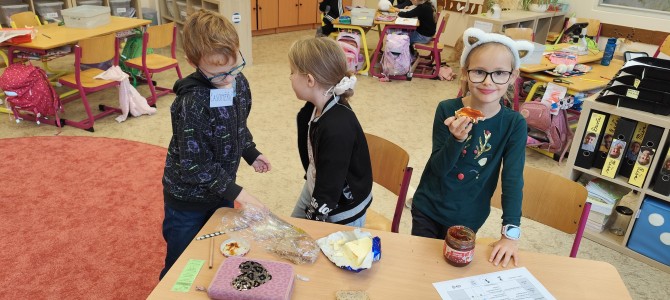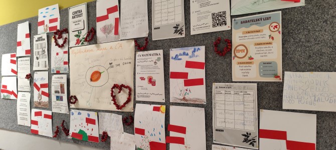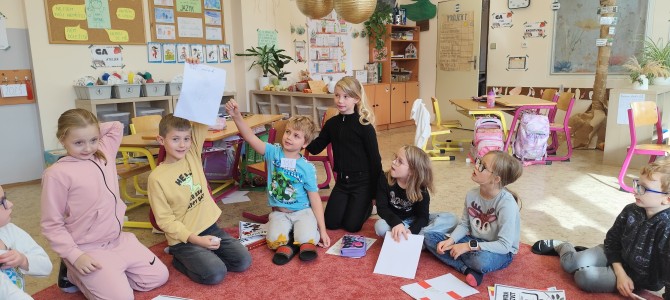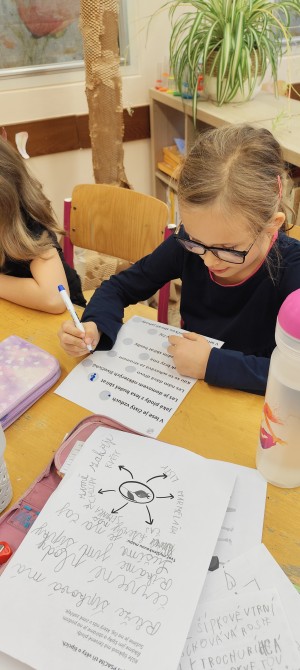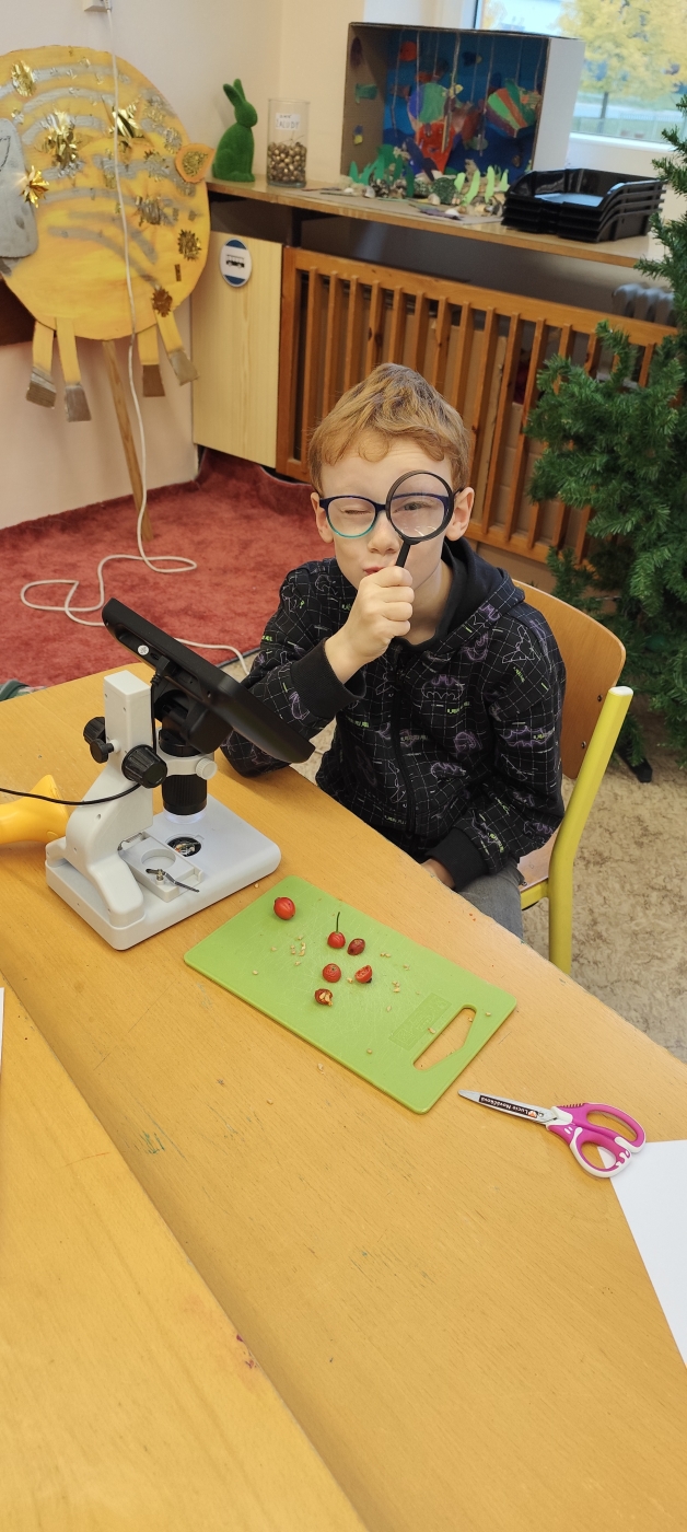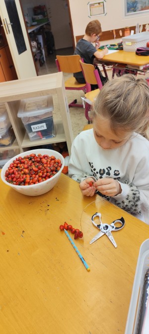 Další měsíc za námi a s ním i ukončená centra s názvem "Podzim šípky maluje". Zkoumání pod lupou či mikroskopy, pitvání šípku, studování encyklopedie, ochutnávka a vaření šípkového čaje a marmelády, tvorba žilnatiny listu keře růže šípkové, měření délky drátku a navlékání šípků, a mnoho dalších aktivit. A za tím vším nenápadné procvičování čtení s porozuměním, druhy vět, práce s odborným textem, vyhledávání informací, jednotky délky a objemu,... Zvládli jsme to!