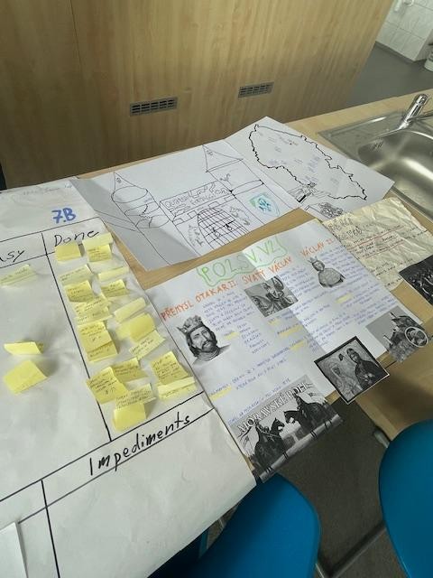 Sedmáci si tentokrát dějepis vyzkoušeli trochu jinak, než jsou zvyklí. Pracovali v týmech podle principů Eduscrumu. Mají s ním zkušenosti již ze 6. třídy. Zpracovávali téma Přemyslovci. Každý tým měl jasný cíl, rozdělené role. Přesně zadané úkoly. Aby práci stihli, museli se spolu bavit, diskutovat a domluvit se na jednom společném řešení což samozřejmě ne vždy je jednoduché. Všichni měli zodpovědnost za společný výsledek.