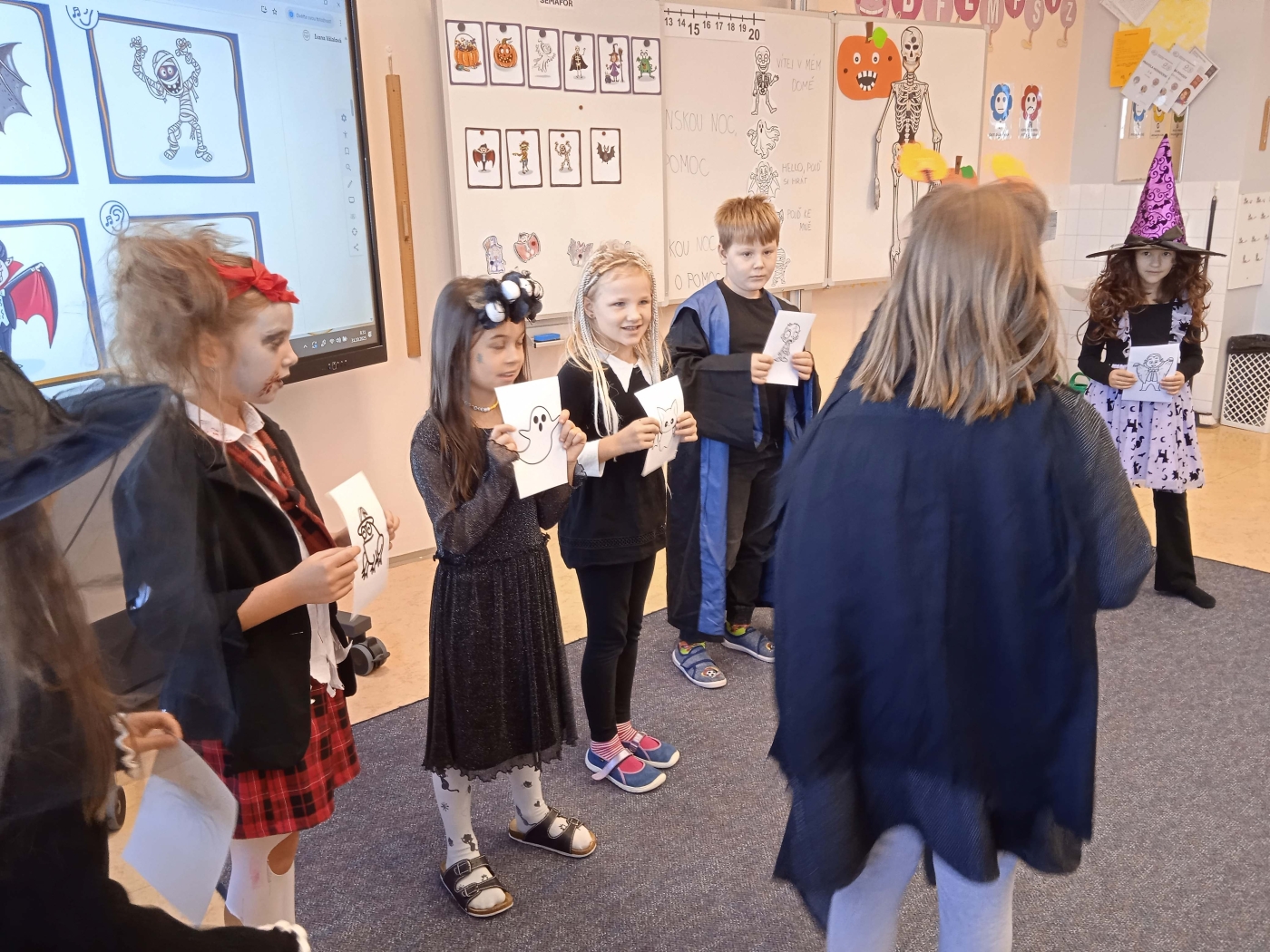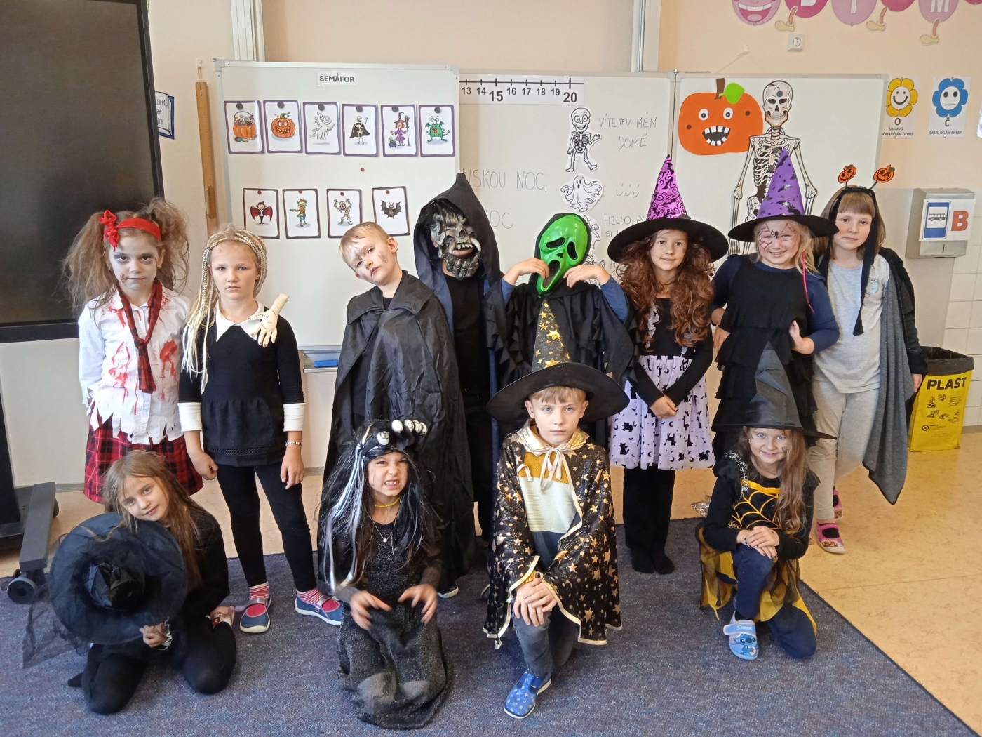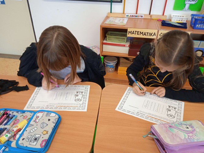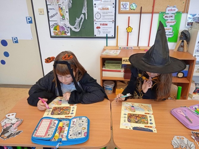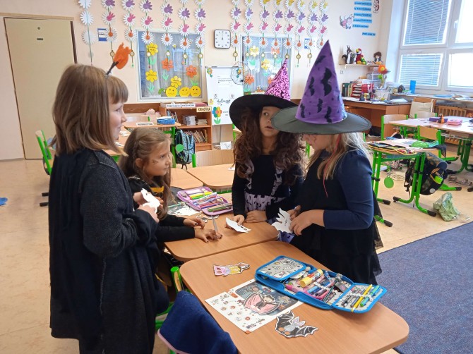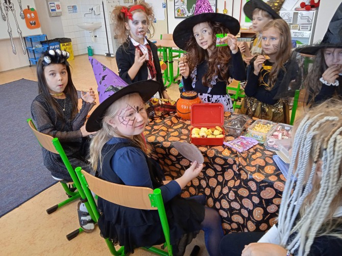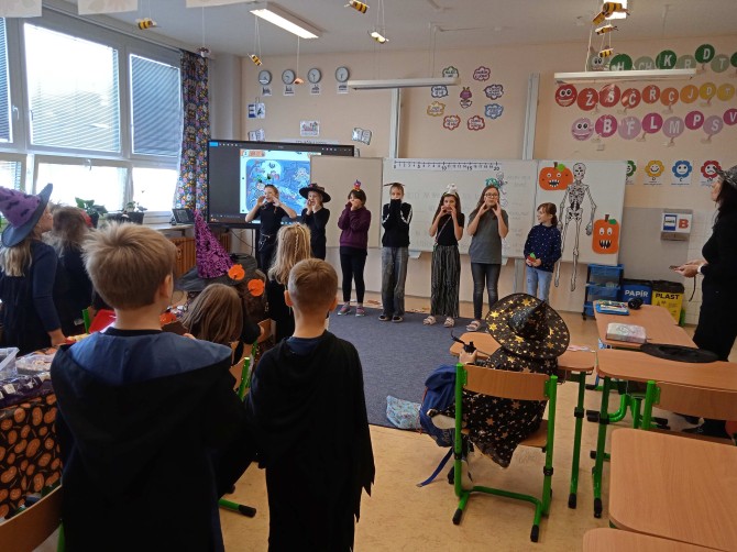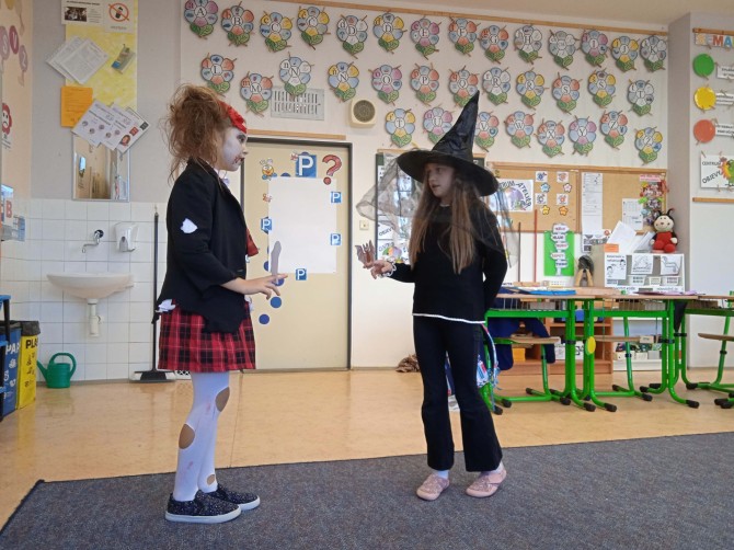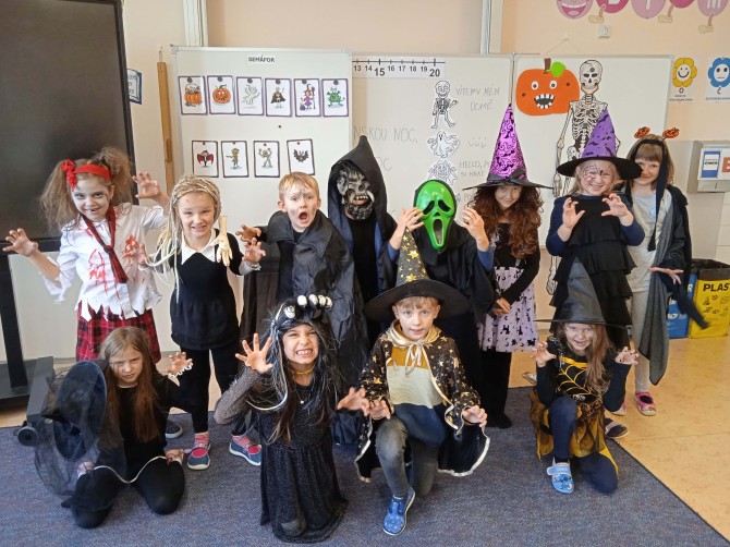 Ve třídě 2. A se Halloween proměnil v nezapomenutelný den plný tvořivosti, pohybu a spolupráce. Děti se s nadšením pustily do anglických halloweenských slovíček, skládaly věty a sehrály rozhovor mezi strašidelnými postavičkami. V češtině si vymýšlely vlastní halloweenský příběh, který si pak společně zahrály, a druhy vět si zopakovaly formou zábavné běhačky. Nechyběl ani pohyb – děti si užily halloweenský „moving" se žonglovacími šátky, který roztančil celou třídu. Vrcholem dne byla písnička „Jdeme ulicí", kterou zazpívaly s takovým nadšením, že se k nim spontánně přidaly i ostatní třídy v okolí. O milé překvapení se postaraly žákyně z páté třídy, které přišly s vlastním vystoupením a potěšily všechny přítomné. Den zakončila halloweenská hostina plná dobrot – velké poděkování patří všem maminkám za jejich skvělou přípravu. Děti si odnesly nejen nové znalosti, ale především spoustu zážitků, úsměvů a radosti ze společně prožitého dne.
