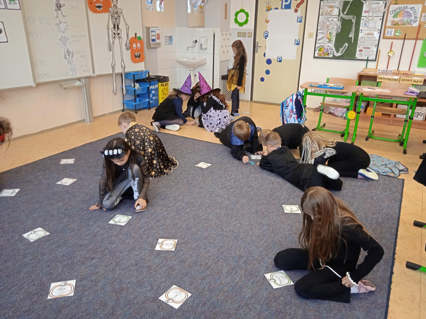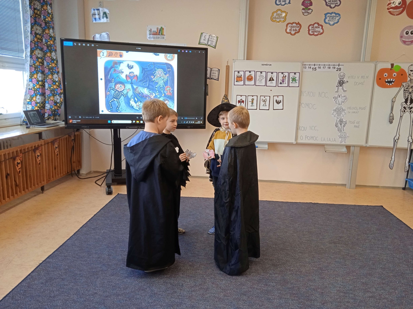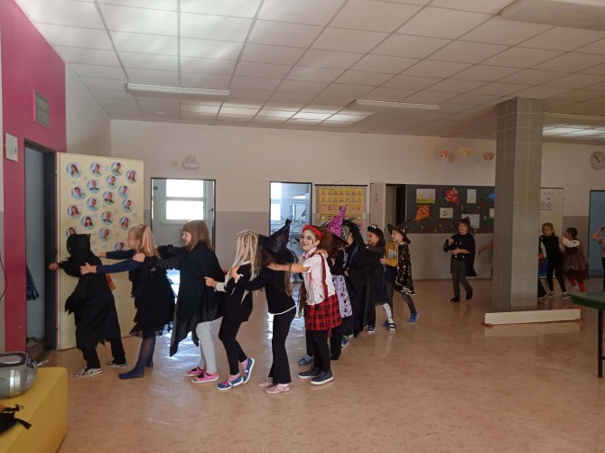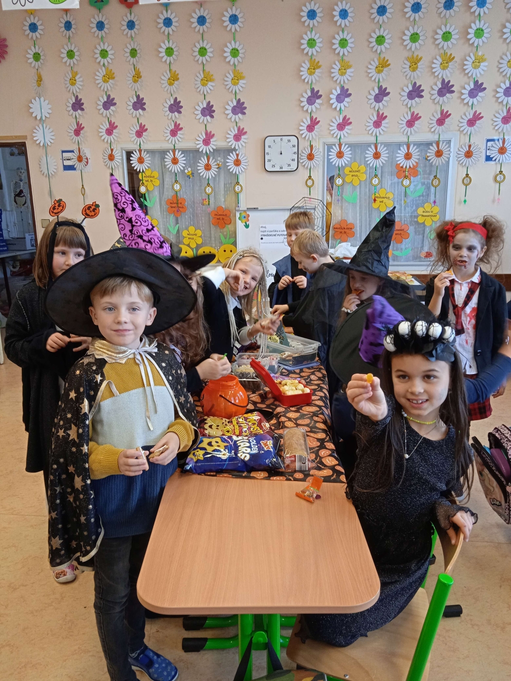 Ve třídě 2. A se Halloween proměnil v nezapomenutelný den plný tvořivosti, pohybu a spolupráce. Děti se s nadšením pustily do anglických halloweenských slovíček, skládaly věty a sehrály rozhovor mezi strašidelnými postavičkami. V češtině si vymýšlely vlastní halloweenský příběh, který si pak společně zahrály, a druhy vět si zopakovaly formou zábavné běhačky. Nechyběl ani pohyb – děti si užily halloweenský „moving" se žonglovacími šátky, který roztančil celou třídu. Vrcholem dne byla písnička „Jdeme ulicí", kterou zazpívaly s takovým nadšením, že se k nim spontánně přidaly i ostatní třídy v okolí. O milé překvapení se postaraly žákyně z páté třídy, které přišly s vlastním vystoupením a potěšily všechny přítomné. Den zakončila halloweenská hostina plná dobrot – velké poděkování patří všem maminkám za jejich skvělou přípravu. Děti si odnesly nejen nové znalosti, ale především spoustu zážitků, úsměvů a radosti ze společně prožitého dne.