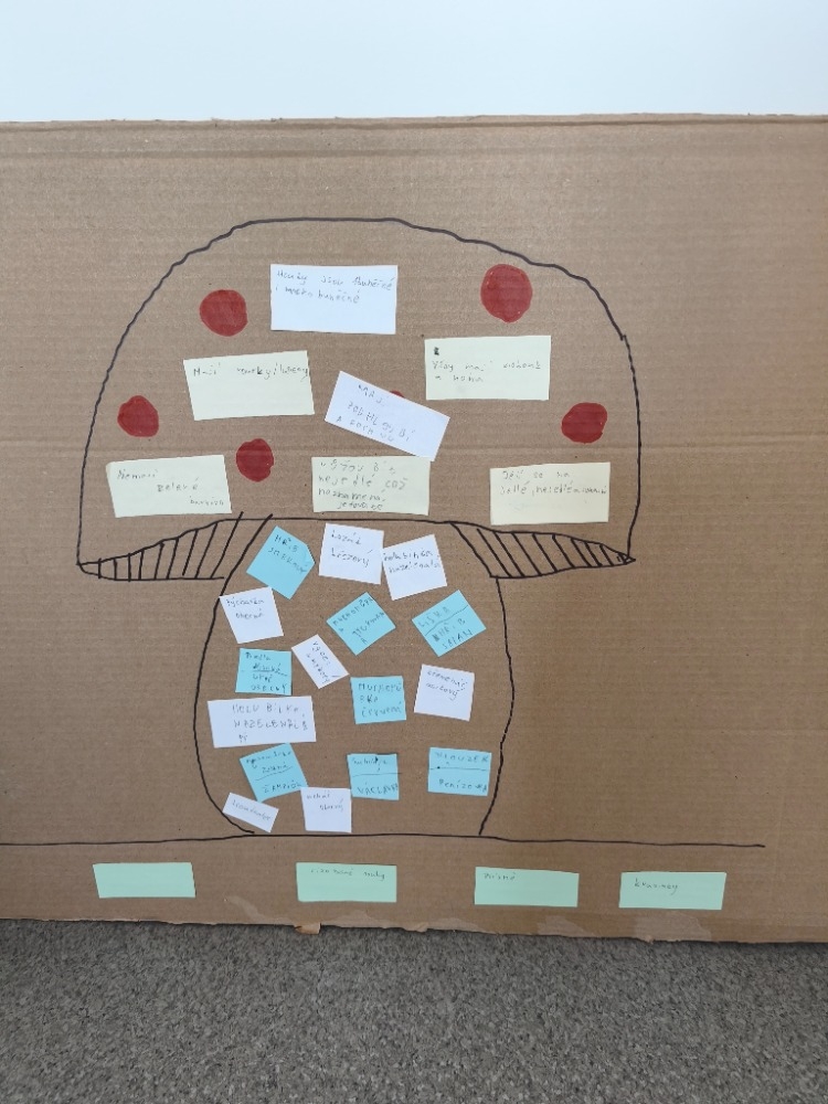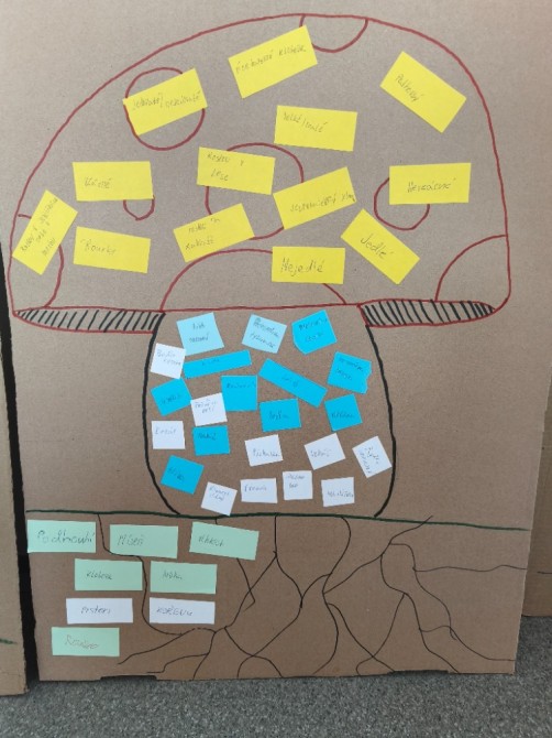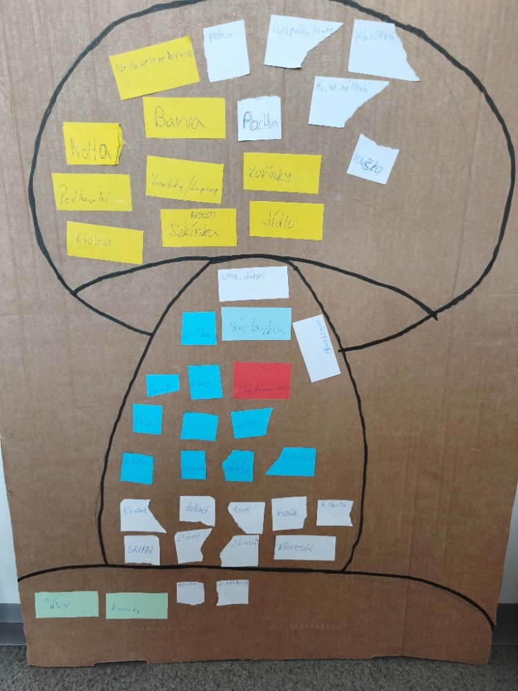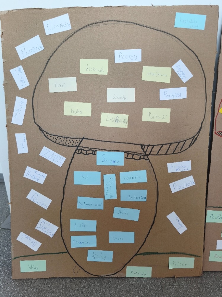 V další hodině na tuto aktivitu navázal ranní úkol a následná skupinová práce. Žáci byli rozděleni do menších skupin, ve kterých měli vytvořit vlastní „model houby". Na karton nejprve namalovali obrys houby a poté pomocí barevných papírků doplňovali informace –hlavní znaky hub, konkrétní zástupce či další pojmy spojené s tímto tématem.