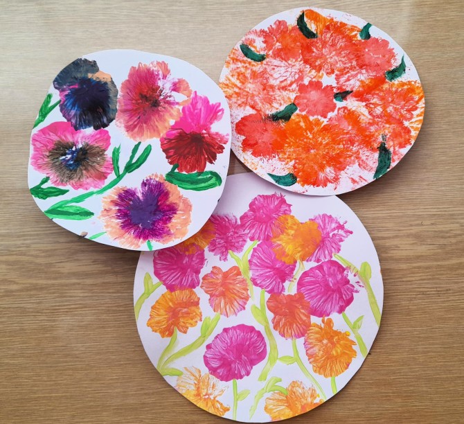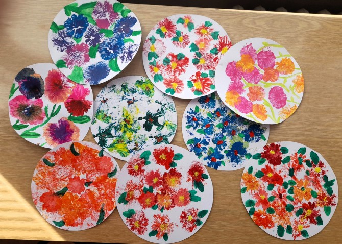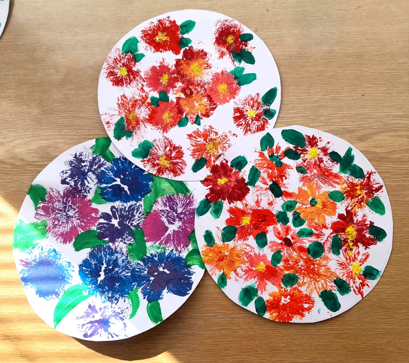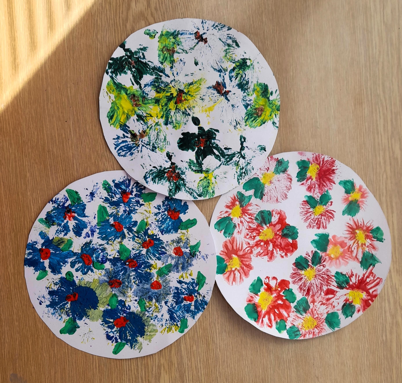 Výtvarně tvořit se dá jakkoliv. Někdy stačí igelitový sáček od svačiny, jeden uzel a nafouknutí sáčku do tvaru bubliny. Pak už stačí jen natřít a obtisknout na papír. Domalovali jsme lístečky a květiny byly na světě, vlastně na papíru. Pomocí vatových tyčinek jsme dotvořili vnitřek květiny. V 6. A tak ve výtvarné výchově zkoušíme i netradiční techniky.