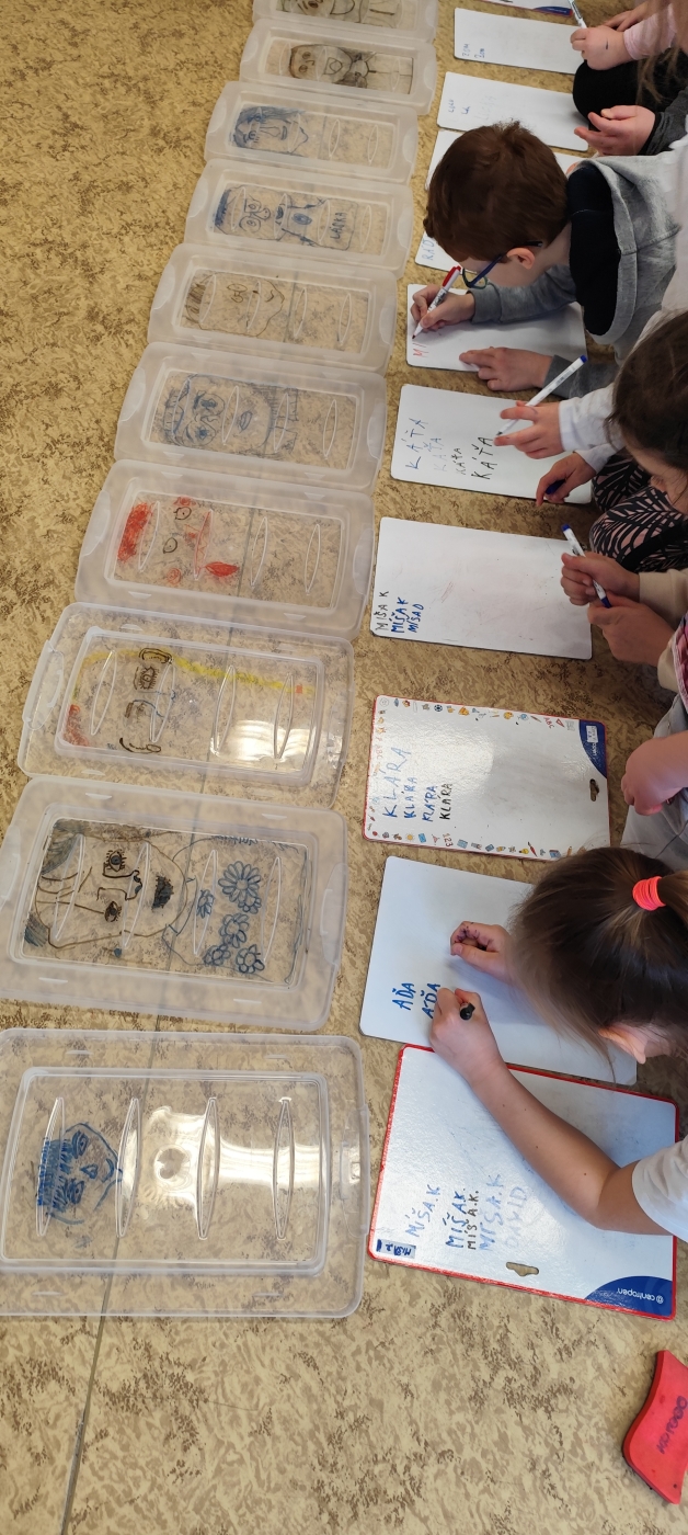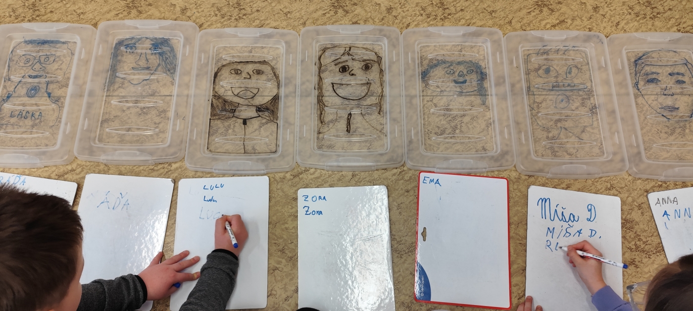 Ve výtvarce jsme se přesunuli do galerie. Vznikaly portréty, které jsme poté hodnotili a hádali, kdo na nich je. Jako pomůcku jsme využili netradičně víčko od krabice a fix na mazací tabulku.