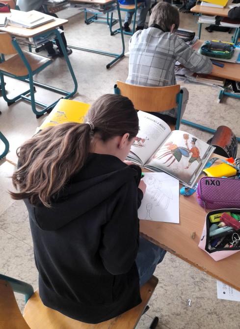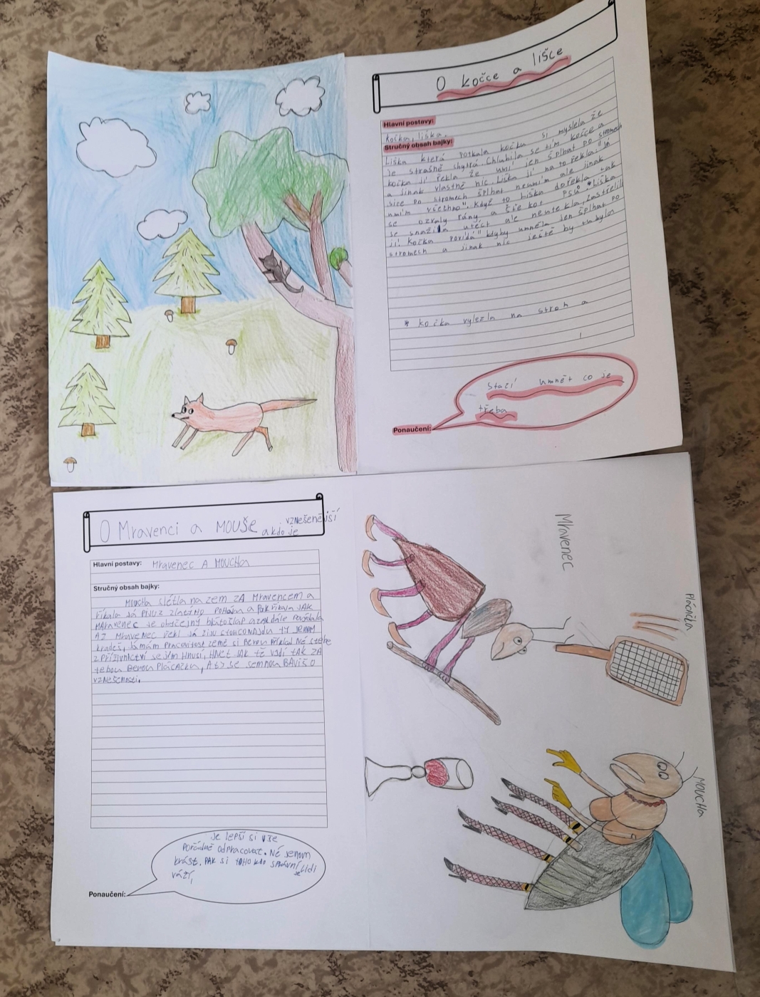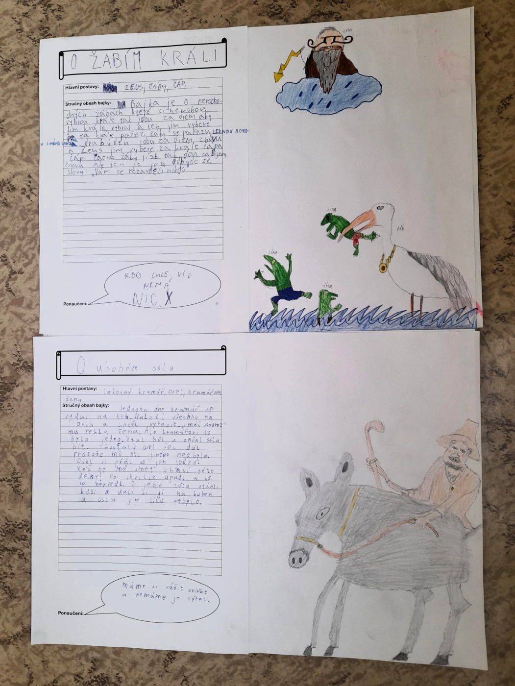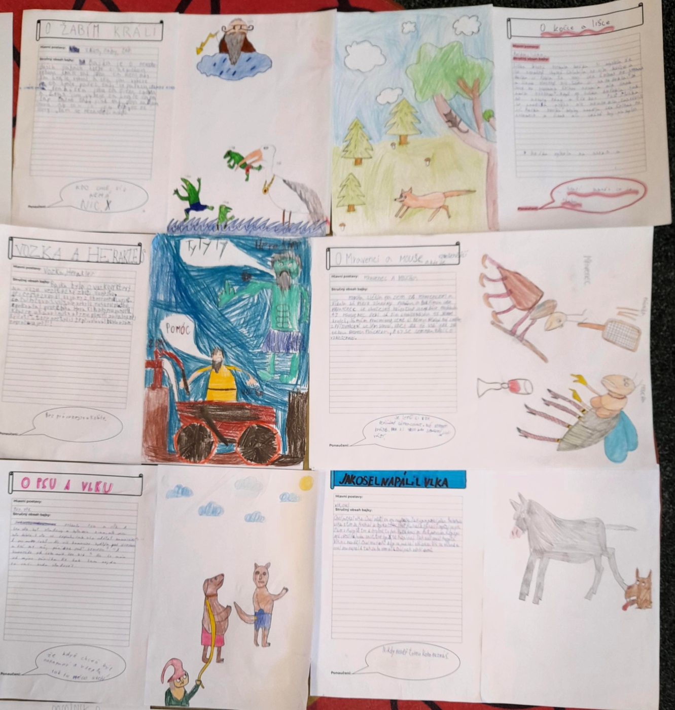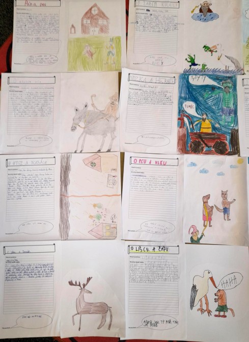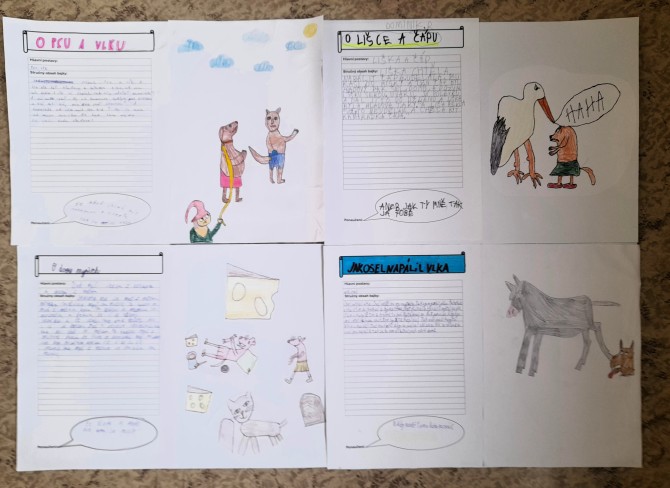 V hodinách literatury se žáci 6. A zaměřili na bajky. Po teoretickém úvodu, při kterém hledali znaky bajky podle nápovědy, se pustili do praktické části. Každý žák si zvolil jednu z Ezopových bajek. Po přečtení nejdříve našel hlavní hrdiny, napsal stručný obsah, dále musel z bajky vyvodit ponaučení a vymyslet vhodnou ilustraci. Z těchto informací vytvořil na základě pracovního listu plakát. Další úkol, který čeká na žáky, je převyprávění bajky. A potom? Spolužáci budou hádat, jaké ponaučení, či přísloví z bajky vyplývá.