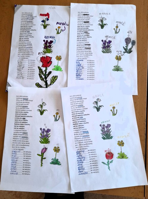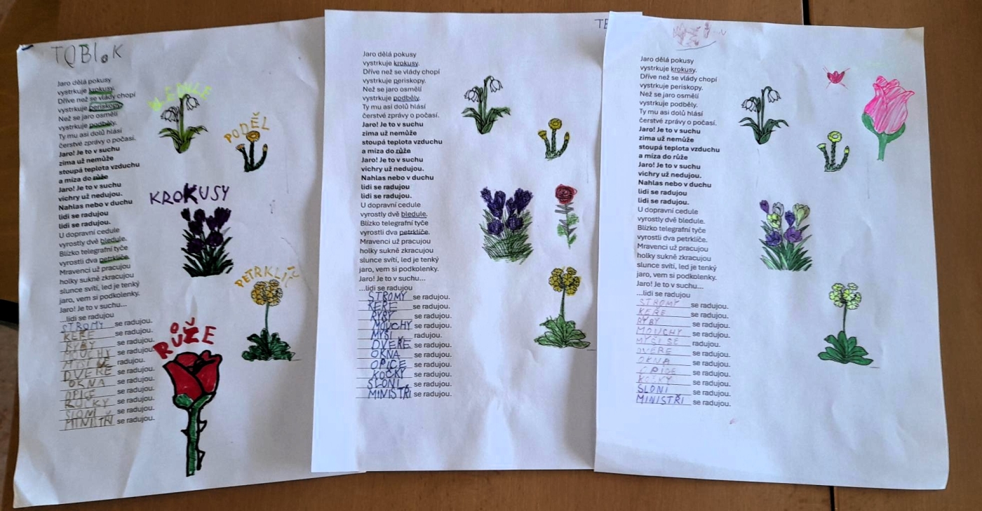 V hudební výchově se zaměřujeme nejen na zpěv, ale propojujeme různé předměty, vědomosti i schopnosti. Žáci 3. B si to vyzkoušeli na písničce Jaro dělá pokusy. Nejdříve si přečetli text a zjistili, že se v něm nacházejí jarní květiny. Úkolem bylo přiřadit slovo k obrázku květiny a správně ho vybarvit. Tak jsme si připomněli krokusy, bledule, petrklíč a podběl. V refrénu jsme objevili další květinu – růži, a tu jsme si namalovali. Když už jsme mysleli, že je vyhráno, na konci pracovního listu na nás čekal další zapeklitý úkol. Paní učitelka pustila písničku a my jsme si museli zapamatovat, kdo se na jaře raduje a přesně za sebou. Všechno jsme zvládli a písničku už téměř umíme.