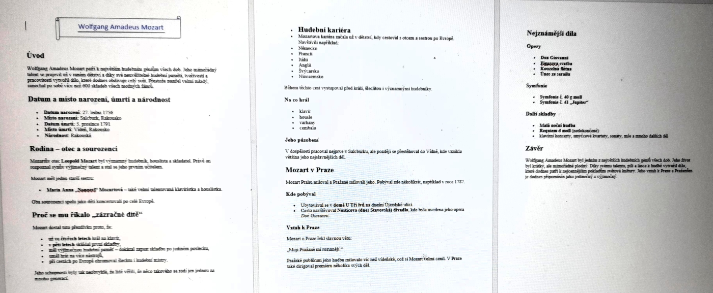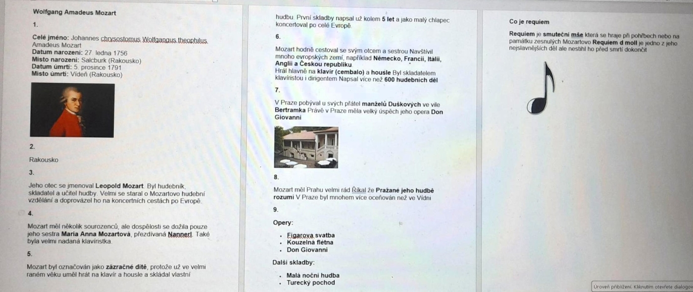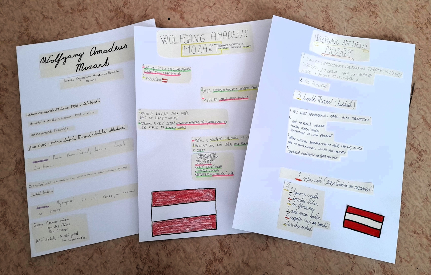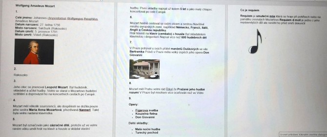 Žáci 7. ročníku si vyzkoušeli opačný postup výuky. Protože v hudební výchově probírají období klasicismu, měli si za úkol za pomocí IT najít informace o Wolfgangu Amadeu Mozartovi. K tomu měli 10 návodných otázek. Každý si vyhledal odpovědi, jedni je sepisovali na papír, druzí do Wordu. Poté si ve skupinkách zkontrolovali svoje odpovědi a dali dohromady informace o tomto hudebním skladateli. A proč opačný postup výuky? Protože teprve poté se od vyučující dozví podrobněji o životě a díle „zázračného dítěte" a samozřejmě nebudou chybět ani praktické poslechové ukázky.
