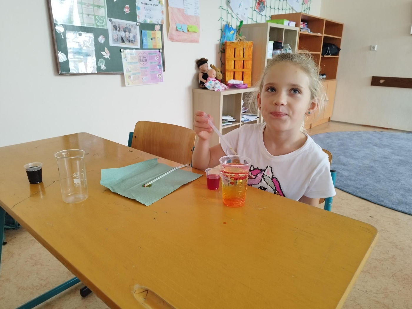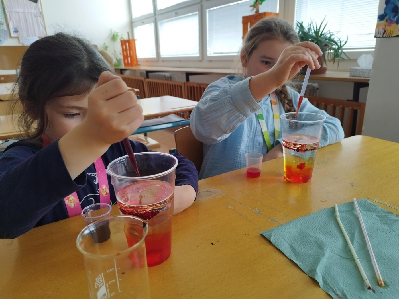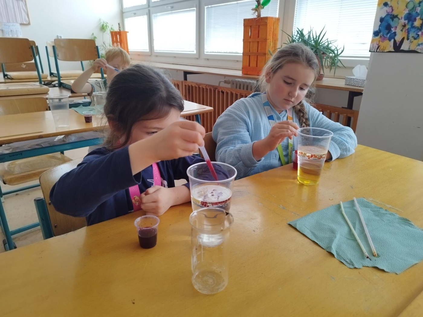 Každé setkání je plné zajímavých pokusů – děti si vyzkoušely práci s pipetkou a míchání barev, seznámily se s Newtonovým zákonem při stavbě balónkového autíčka, zjistily, co znamená pojem hustota a difúze, a naučily se poznávat různé chemické pomůcky.
