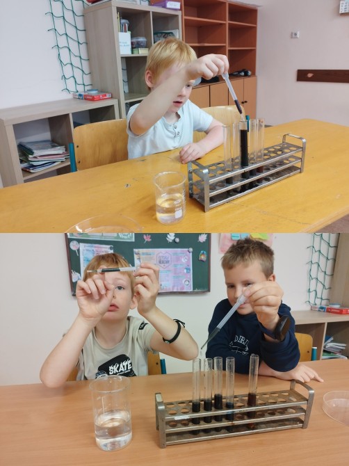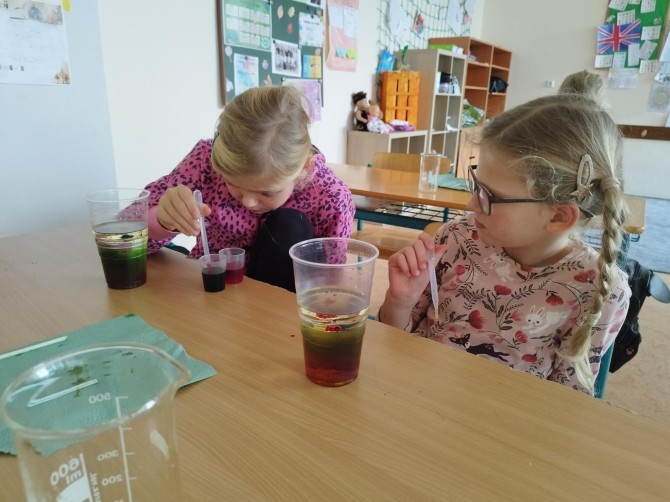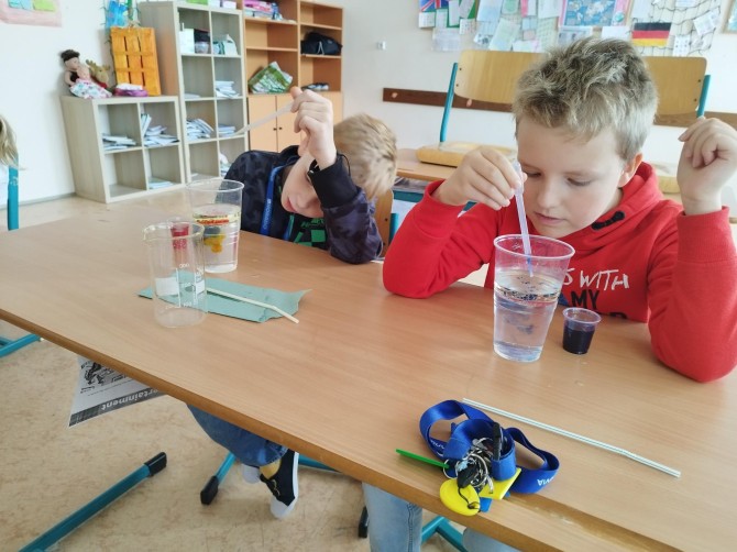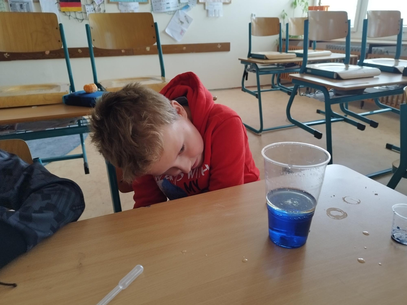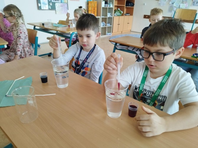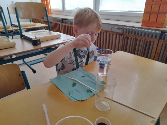 Každé setkání je plné zajímavých pokusů – děti si vyzkoušely práci s pipetkou a míchání barev, seznámily se s Newtonovým zákonem při stavbě balónkového autíčka, zjistily, co znamená pojem hustota a difúze, a naučily se poznávat různé chemické pomůcky.