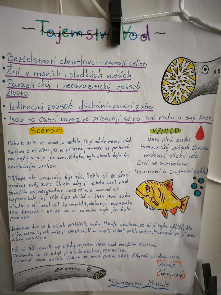 Jejich úkolem bylo vyhledat pět základních informací o této skupině živočichů, uvést alespoň jednoho konkrétního zástupce a nakonec vymyslet krátký příběh, který by mohl sloužit jako námět pro film nebo scénář. A že fantazie žákům rozhodně nechyběla!