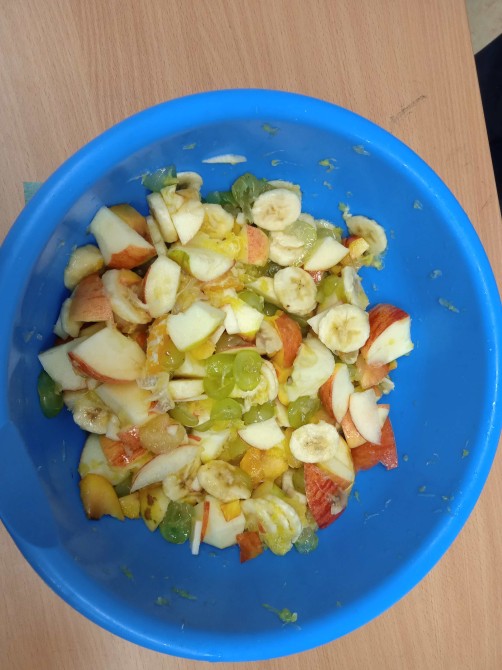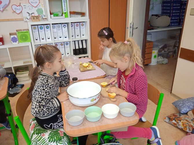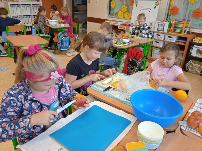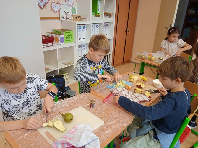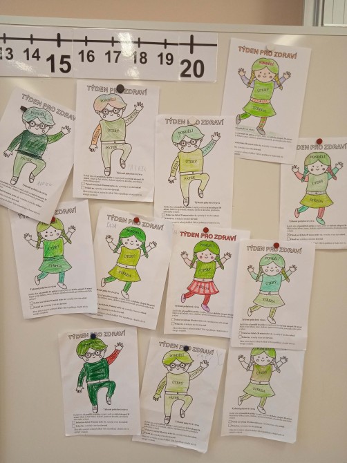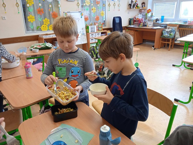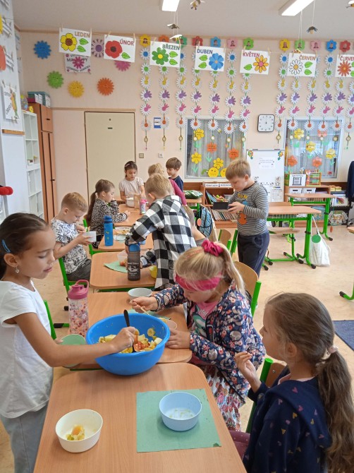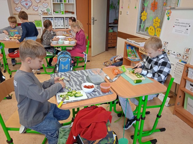 Třída 2. A, známá jako Kvítečkov, se během Týdne pro zdraví (od 6. do 10. října) proměnila v partu malých objevitelů zdravého života. Každý den sledovali, jestli se jim podařilo hýbat alespoň 30 minut – a podle toho si vykreslovali vlastní postavičku. V prvouce se ponořili do světa vitamínů, ovoce a zeleniny, a ve čtvrtek 9. října si sami připravili barevné saláty, které voněly zdravím i radostí. A protože zdravé jídlo chutná nejlépe ve společnosti, proměnila se třída v hostinu plnou barev, vůní a radosti – saláty se ochutnávaly, chválily a mizely rychlostí blesku!