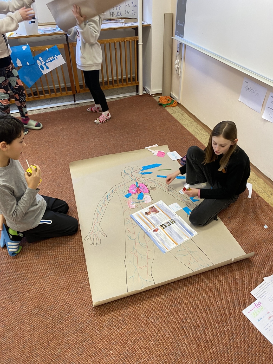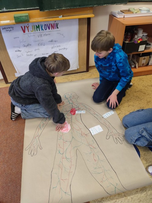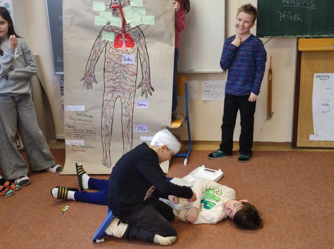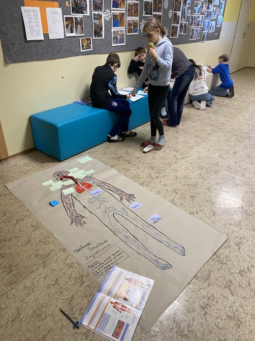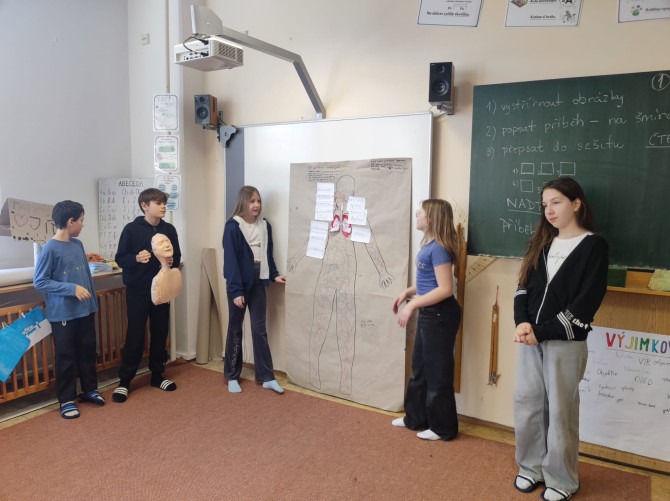 Děti zkoumaly lidské tělo, tvořily pracovní listy a zapisovaly poznatky do sešitů. Výsledkem byla kreativní plakátová práce, kde nechyběly orgány, zajímavosti ani příklady první pomoci.