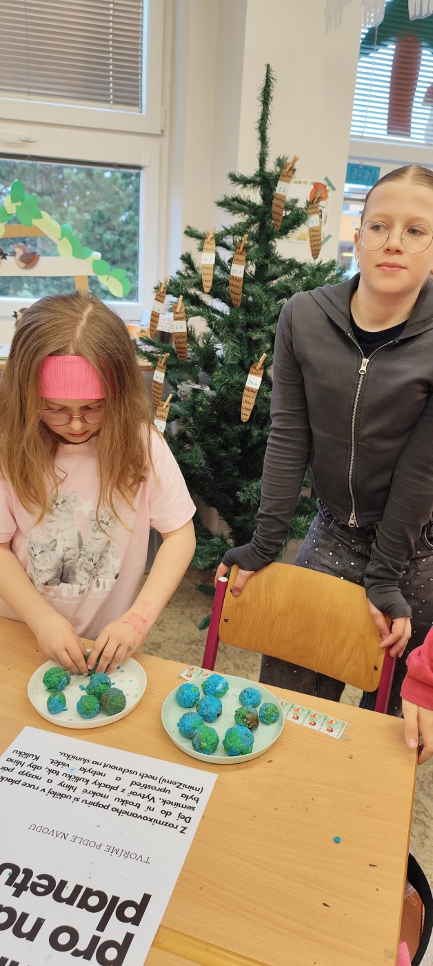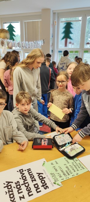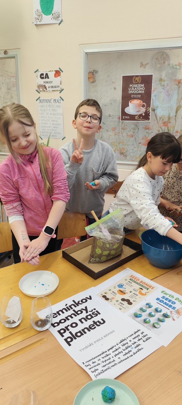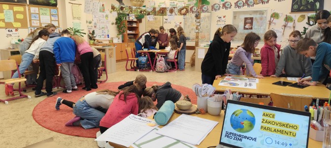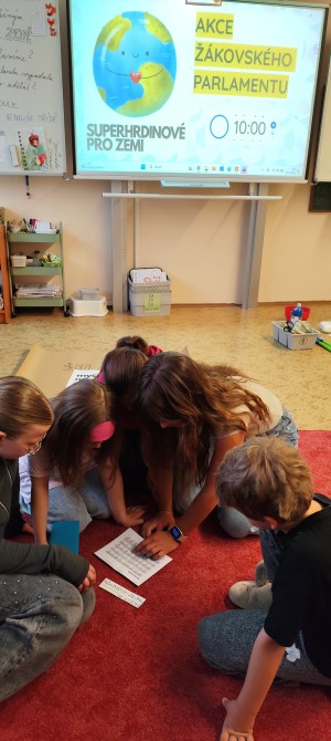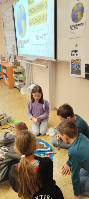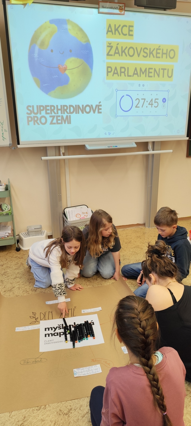 Pod vedením Žákovského parlamentu vznikla akce, která propojila kreativitu, spolupráci i odpovědnost k životnímu prostředí. Oslavili jsme Den Země. Starší žáci utvořili s ostatními pět týmů a stali se tak průvodci a mentory pro mladší spolužáky. Společně tak bourali hranice mezi ročníky a dokazovali, že spolupráce je jednou z nejsilnějších „superschopností". Po rozklíčování šifer se každému týmu otevřely dveře k dalším misím. Tvořila se myšlenková mapa k tomuto tématu, nechyběla ani moderní technologie a úniková hra s tablety, zvuková tlačítka s příběhem o naší planetě, třídil se odpad, vyhledávaly se živé a neživé přírodniny v našem atriu, vznikla megaZeměkoule (o kterou se teď budeme muset starat, aby chia semínka vzkvétala, jako naše Země). Nelze opomenout i miniZeměkoule, které členové parlamentu vyráběli formou kašírování (uvnitř každé najdete semínka kytek v hlíně, obalené papírem), která po vyschnutí společně plánujeme vysázet v atriu.