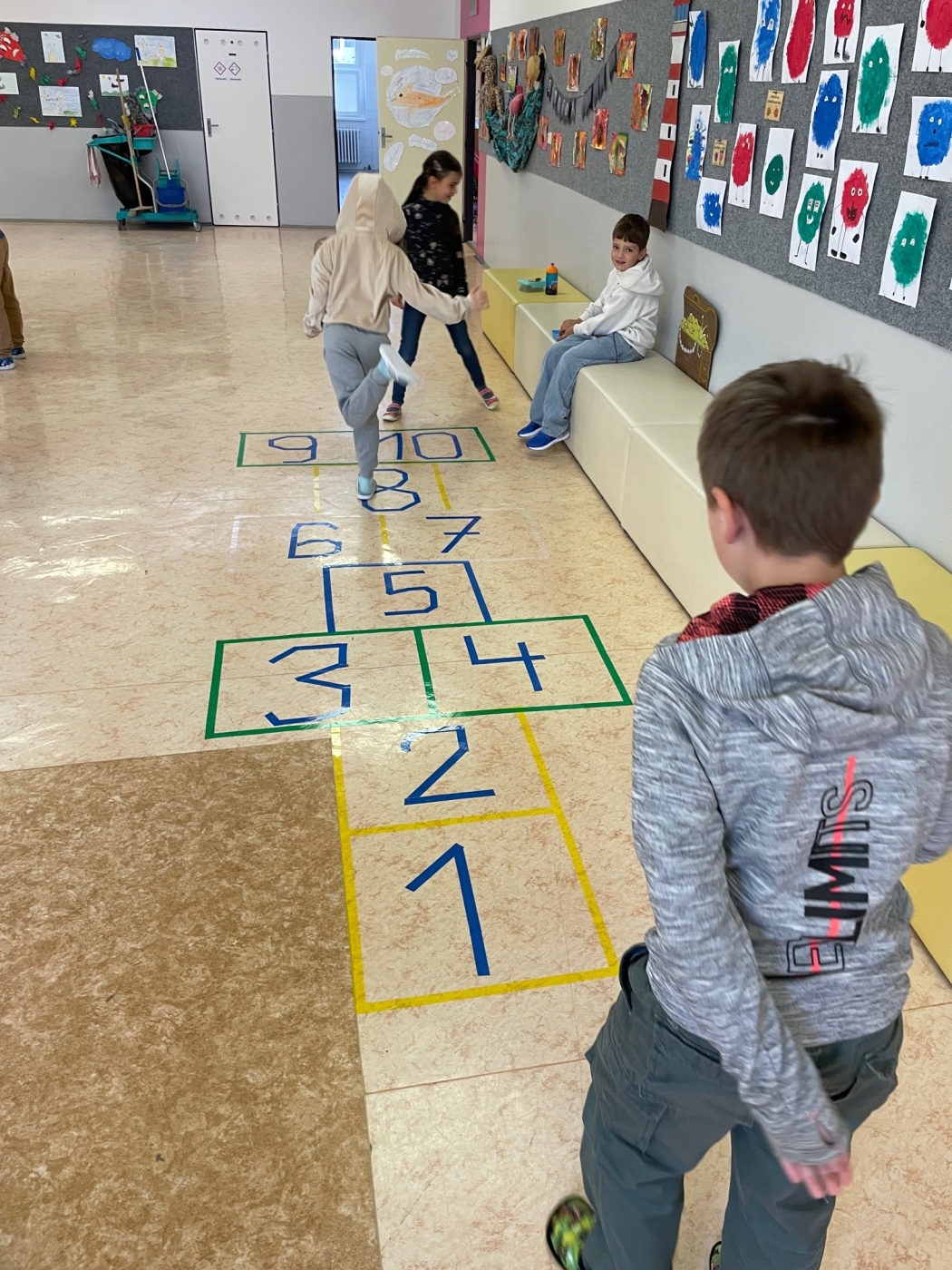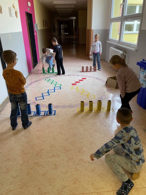 Jak trávíme přestávky, když je venku nevlídno? Třeba můžeme skákat panáka nebo si zahrát obří Člobrdo. Za výrobu moc děkujeme paní asistentce Peti.