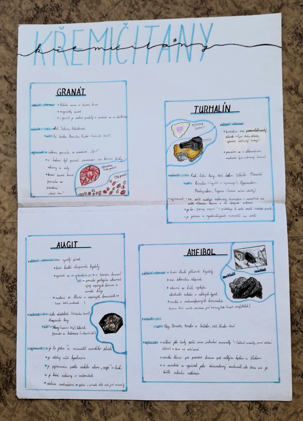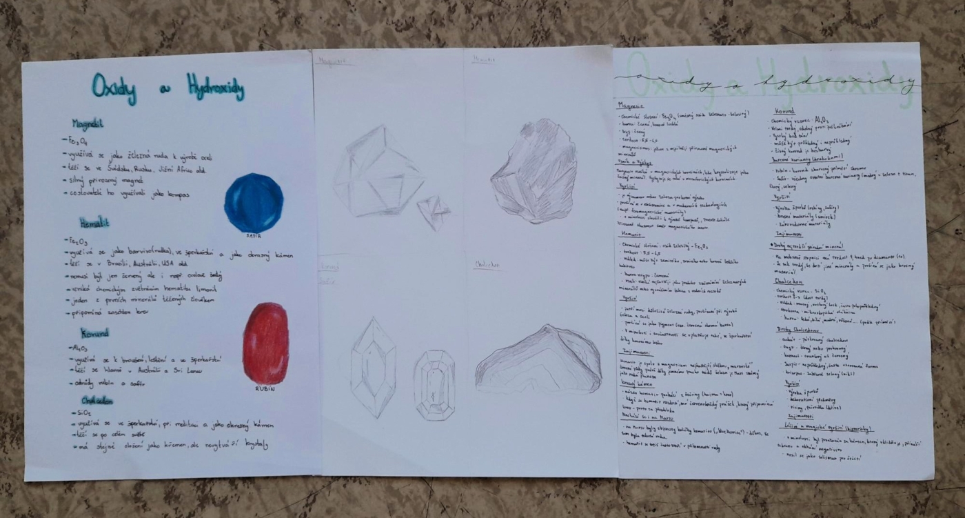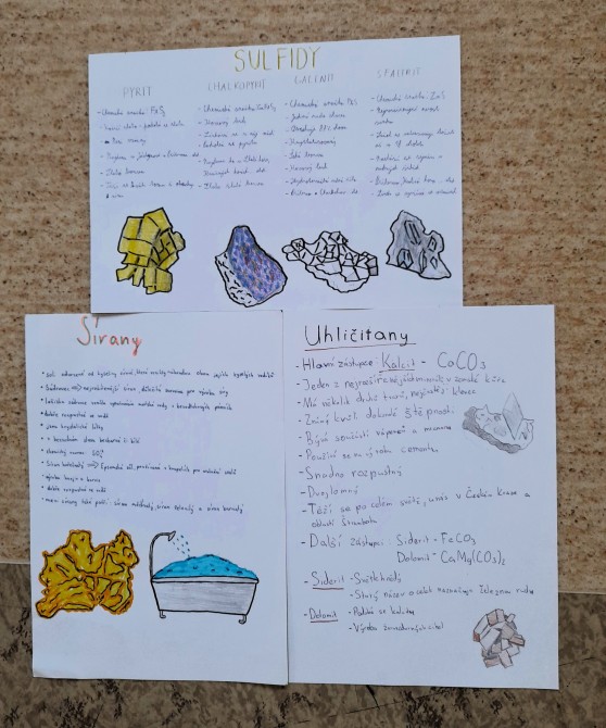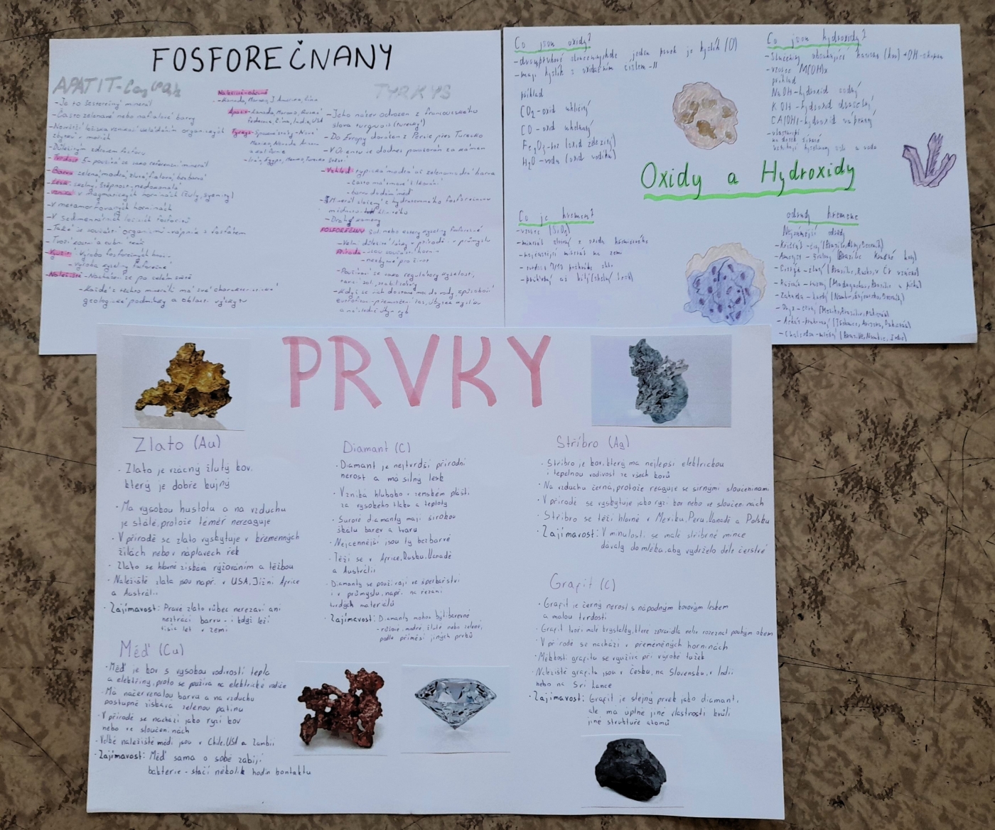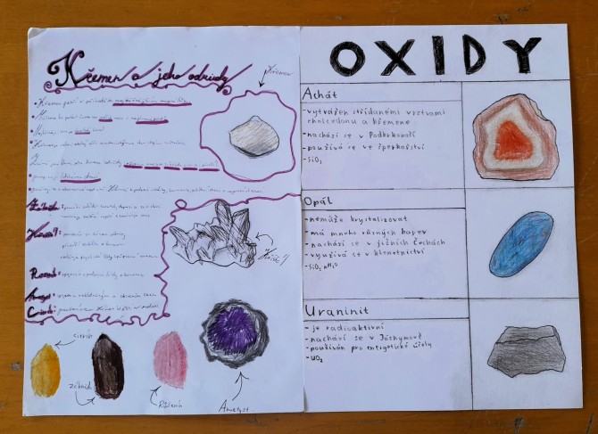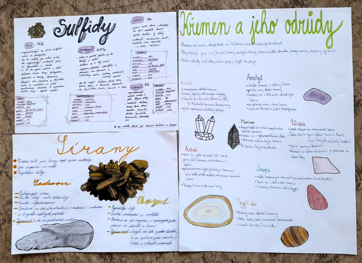 Žáci 9. tříd mají za sebou základní znalosti o vlastnostech minerálů, jako třeba tvrdosti, barvě, rozpustnosti, hustotě atd. Nyní přišly na řadu nejdůležitější minerály. Nejdříve jsem si je rozdělili a vysvětlili, proč zrovna patří mezi prvky, sulfidy, halogenidy, oxidy a hydroxidy, že existují také sírany, fosforečnany, křemičitany a uhličitany. Vybrali jsme ty nejznámější a nejužitečnější a připravili si o nich referáty. Zaskočilo nás, kolik barevných variant má křemen, k čemu je potřeba měď. Zjistili jsme, co vše za minerály objevíme na špercích, co se využívá v lázeňství, nebo elektronice. Na závěr jsme si promítli dokument o tom, že některé minerály jsou na pohled velmi přitažlivé, ale velmi jedovaté a tím pádem pro zdraví nebezpečné. Na 1. místě je u nás praktické využití a naše zdraví.