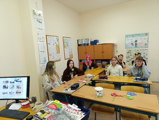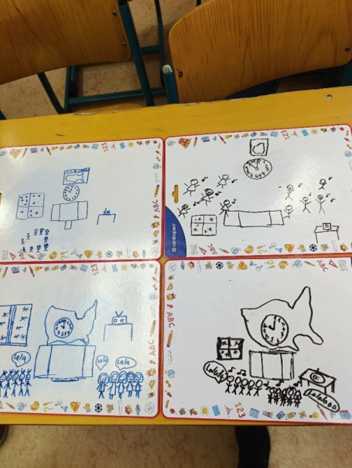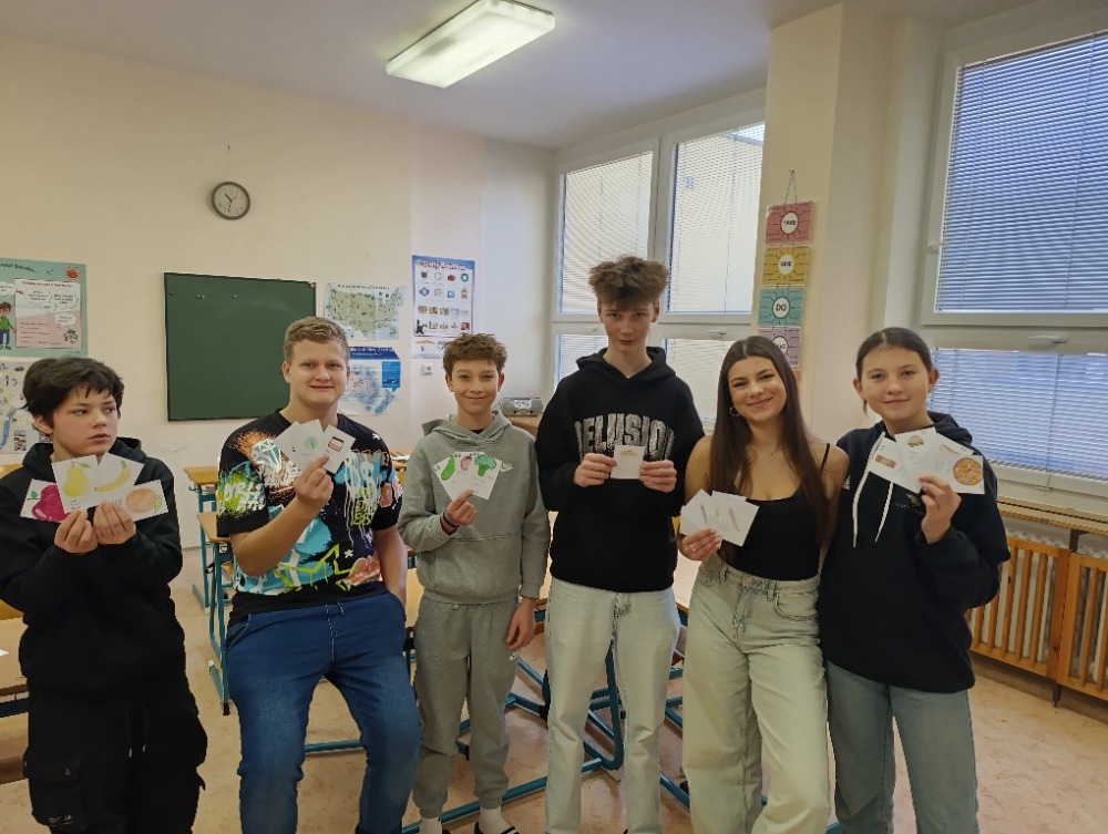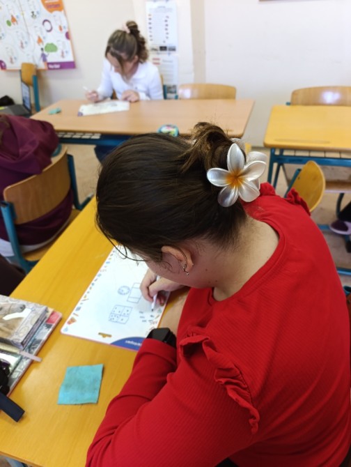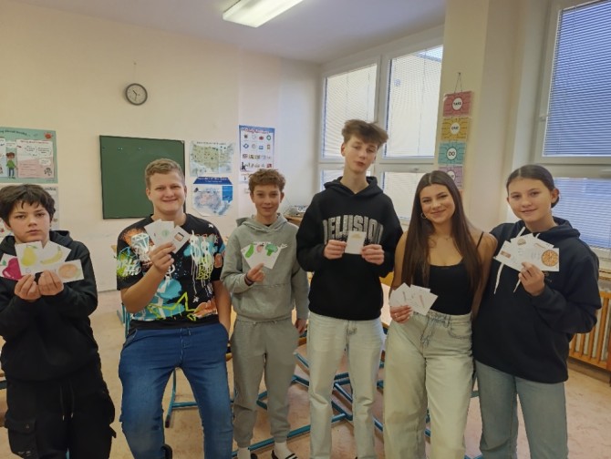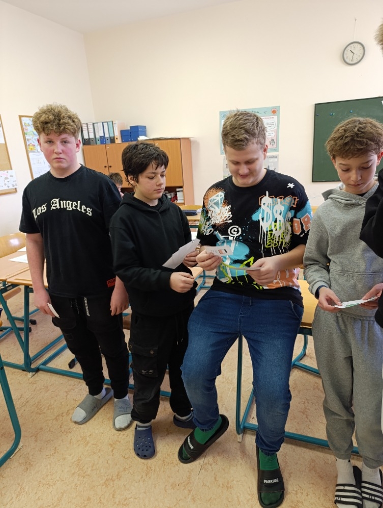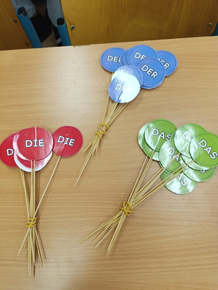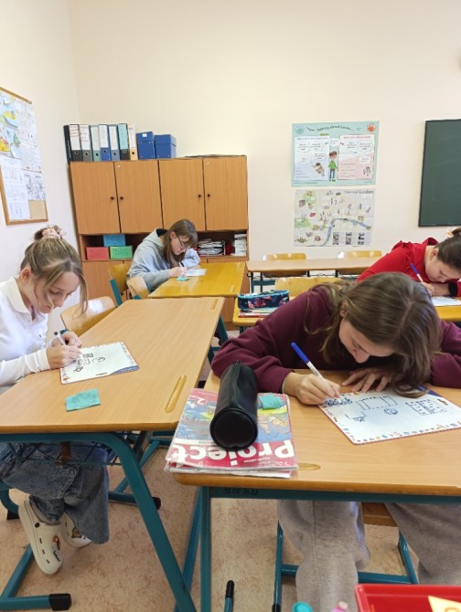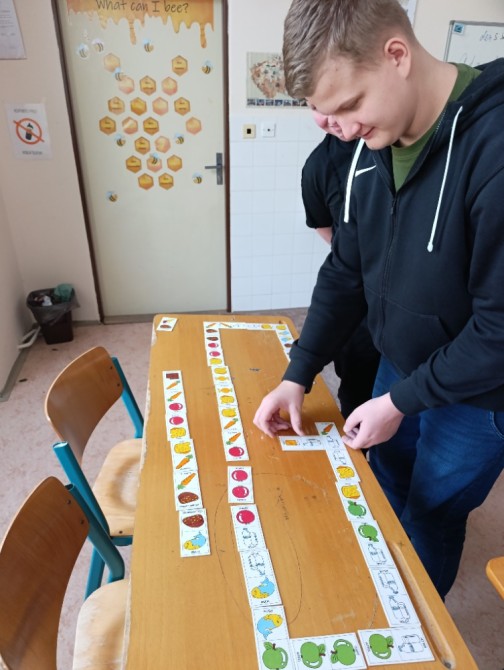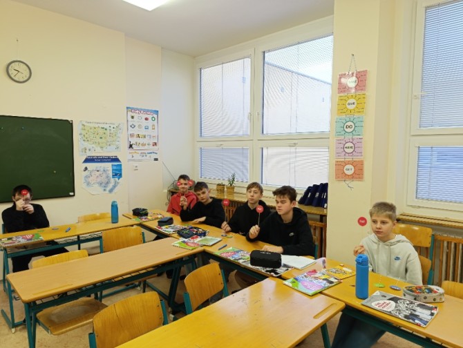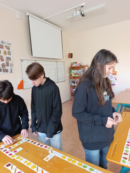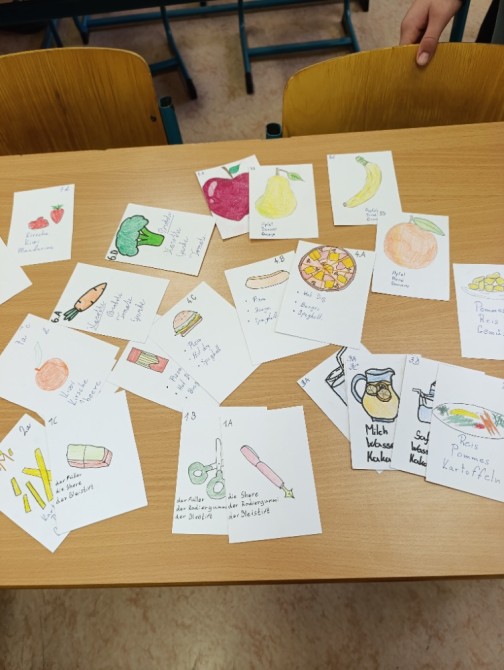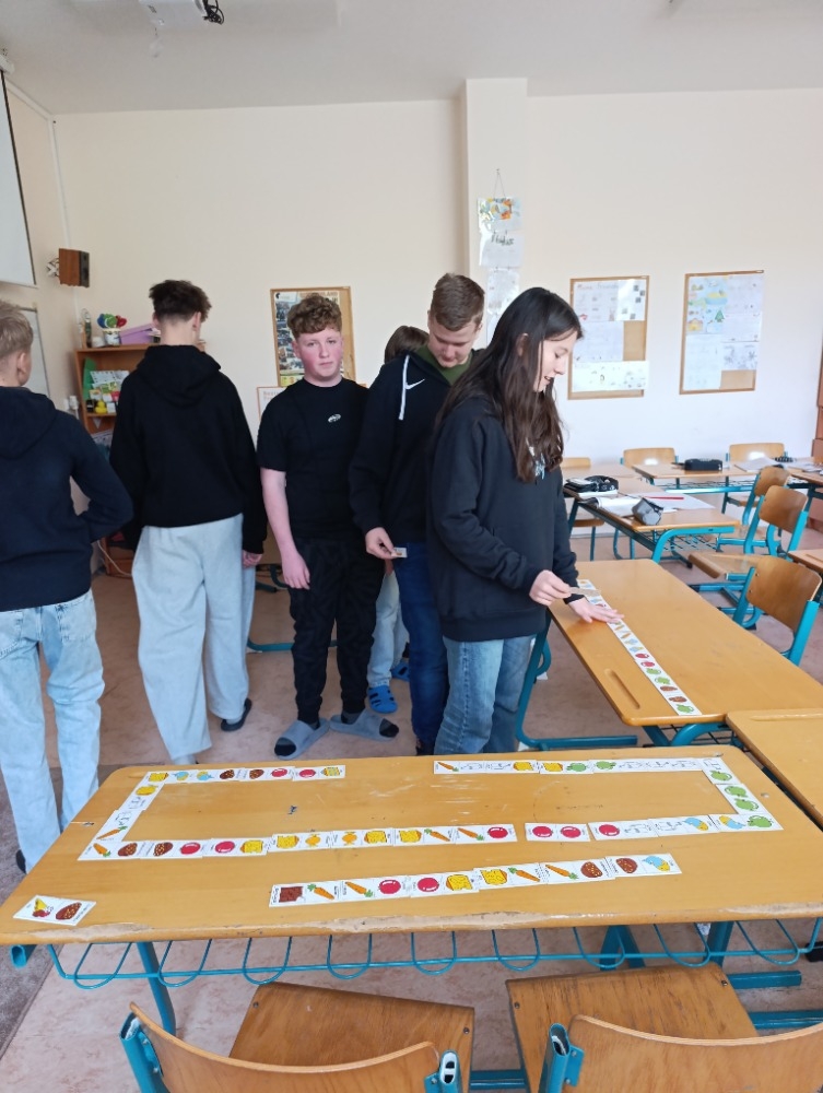 Diktát v němčině, žádný problém. Naši sedmáci probírají předložky a jak dobře jim rozumí, dokázali při kreslícím diktátu. Výsledný obrázek byl velmi shodný, bravo. Osmákům se daří zapamatovat názvy pokrmů a dokonce si vyrobili vlastní kvarteta na procvičování slovní zásoby a gramatiky. Domina a členy v hlavě přiřazují hravě.