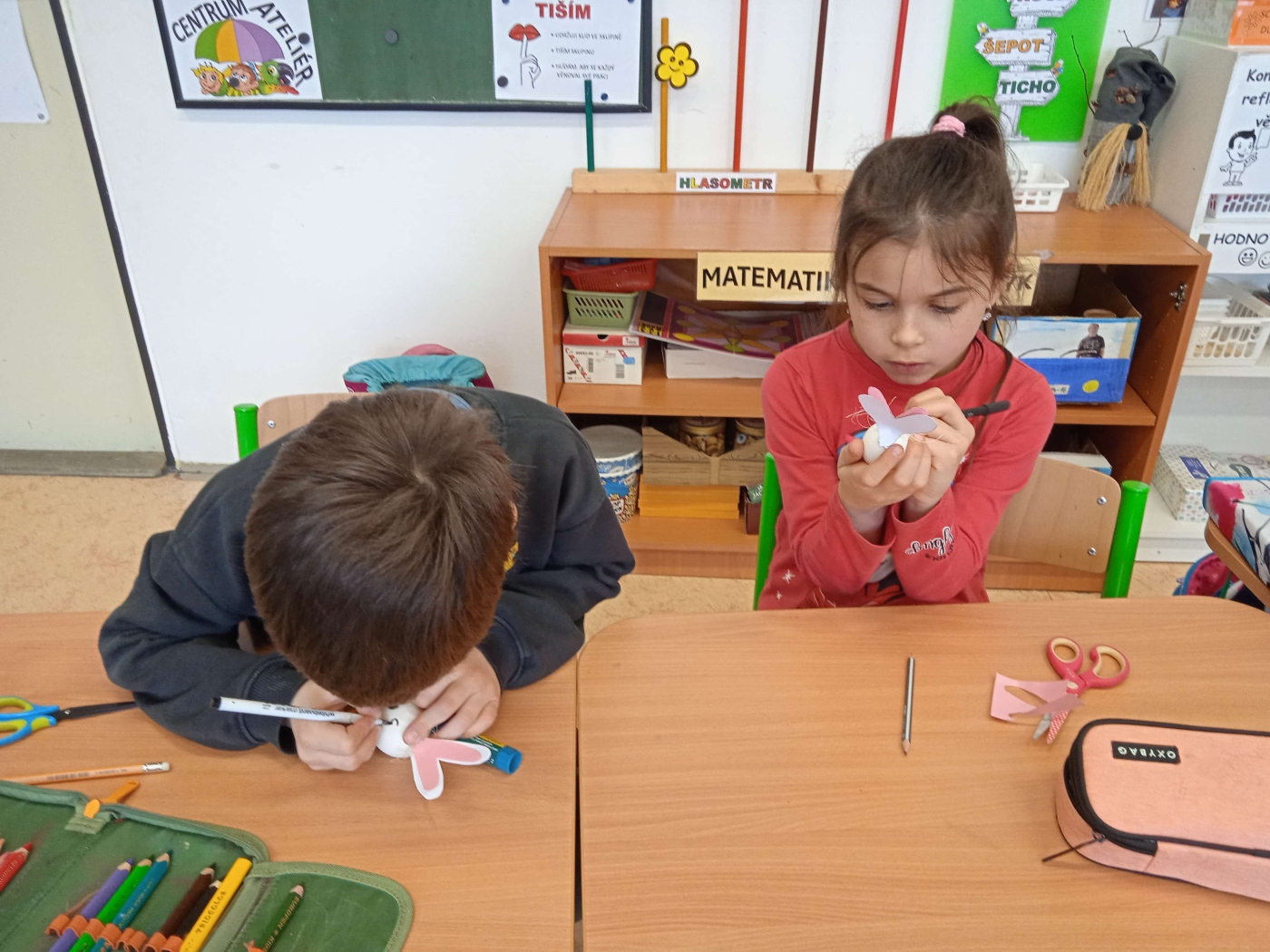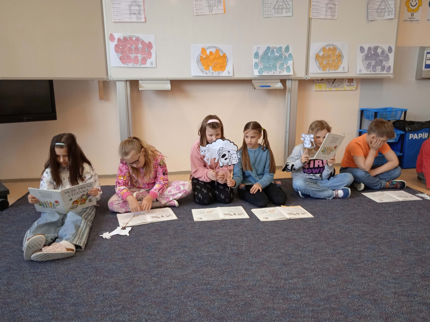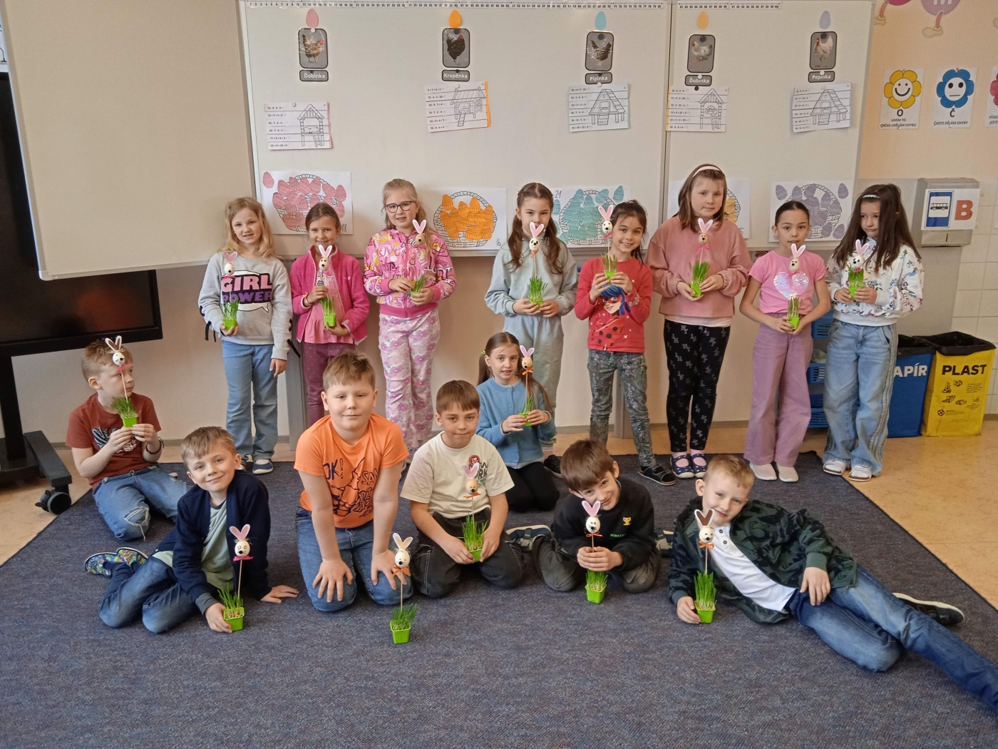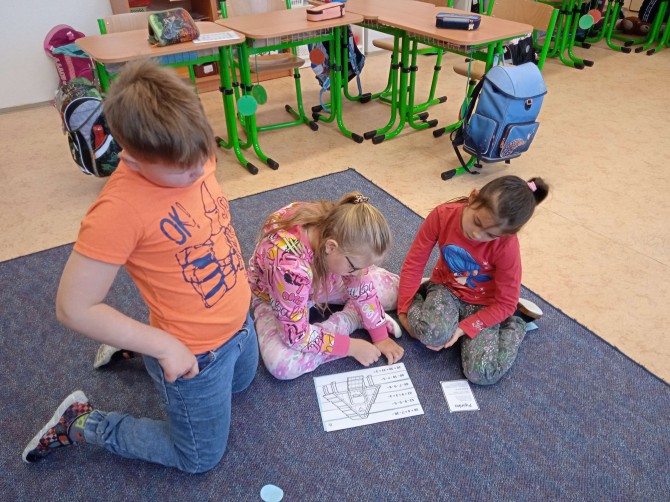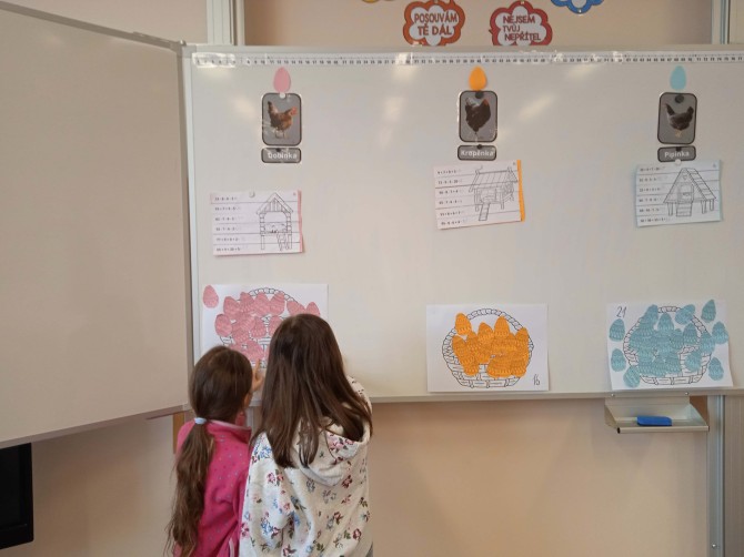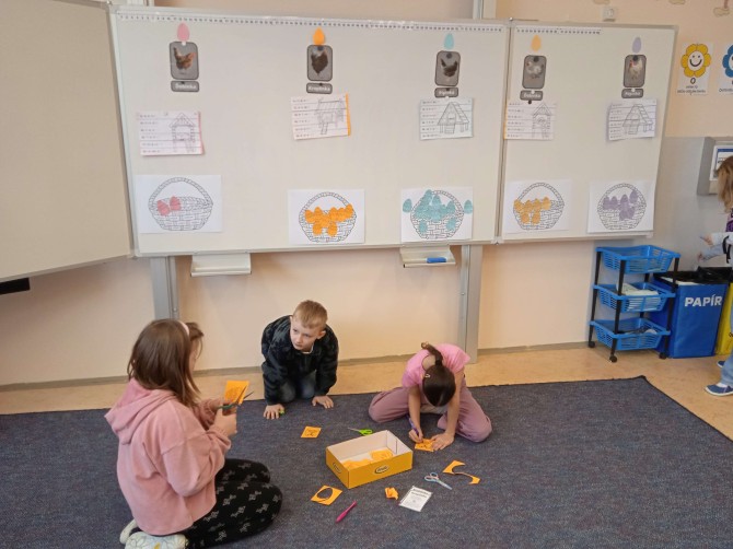 Poslední školní den před velikonočními prázdninami neprobíhal v lavicích jako obvykle. Žáci 2. A se totiž ponořili do tematického vyučování, které propojilo matematiku, dramatickou výchovu i kreativní tvoření. Celý program odstartoval netradiční matematikou v týmech. Každá skupina si vylosovala svou slepičku a plnila úkoly, které jim připravila. Úspěšní řešitelé museli nejprve postavit stabilní kurník a následně se pustit do precizního počítání velikonočních kraslic. Logické uvažování a týmová spolupráce byly klíčem k úspěchu. V rámci dramatické výchovy se děti seznámily s příběhem „O slepičce Pepičce". Čtením to však zdaleka neskončilo. Žáci si připravili papírové loutky, se kterými celý příběh následně odehráli. Loutkové divadlo sklidilo velký úspěch a ukázalo herecký talent mnoha žáků.