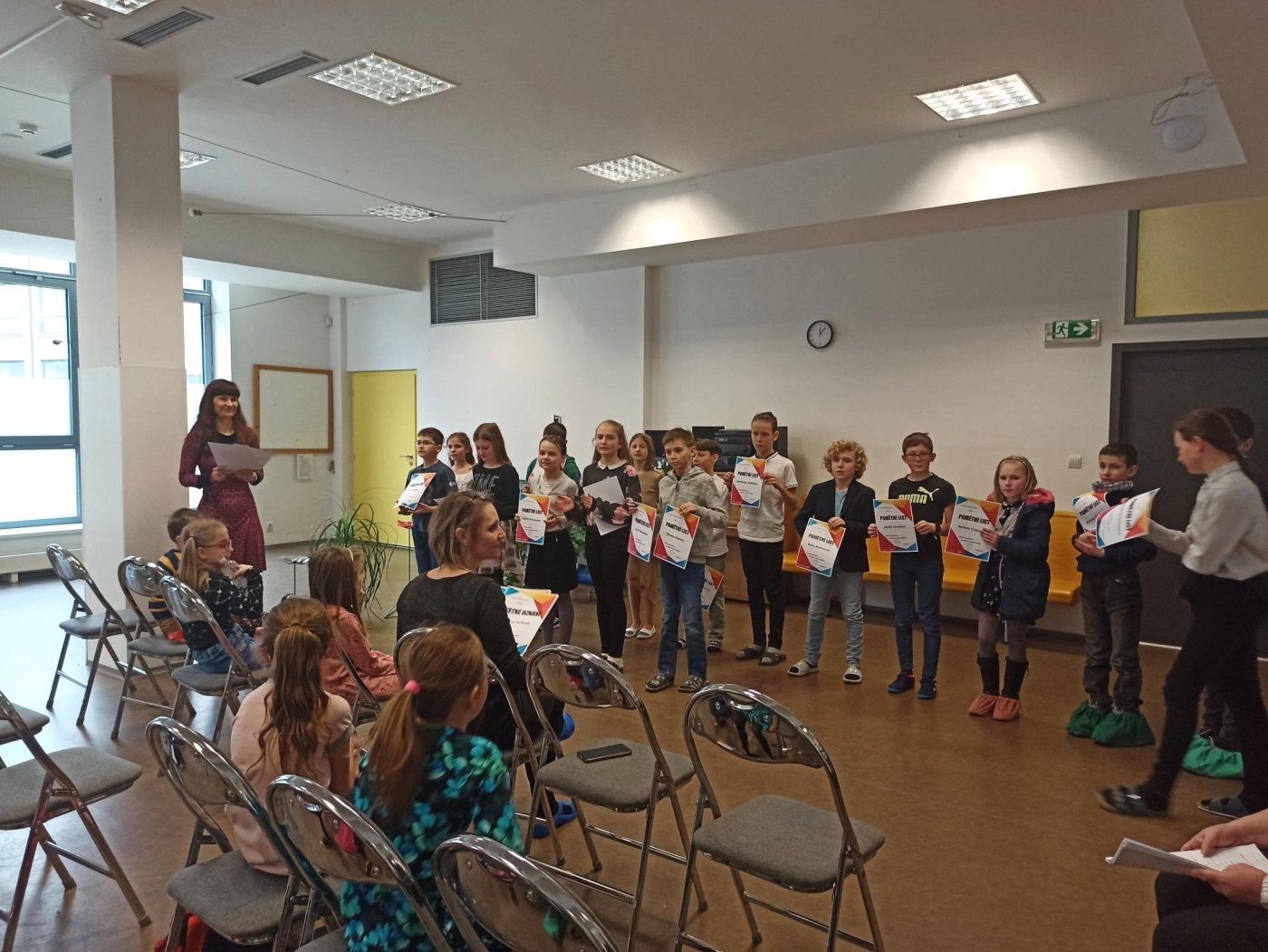 V pondělí 13. 3. se v Domě dětí a mládeže Třebíč v Borovině konalo okresní kolo recitační soutěže, kterého se účastnili také mladší žáci ze ZŠ Na Kopcích. Všichni soutěžící byli velice pochváleni porotou za pečlivou přípravu a velkou odvahu vystoupit před početným publikem. Postup do krajského kola sice naši recitátoři Barborka Široká, Katka Zbranková, Jirka Malach a Pavlínka Picmausová nevybojovali, ale předvedli opravdu skvělé výkony, za něž byli oceněni pamětním listem a Pavlína dokonce i čestným uznáním. Děkujeme jim všem za skvělou reprezentaci naší školy.