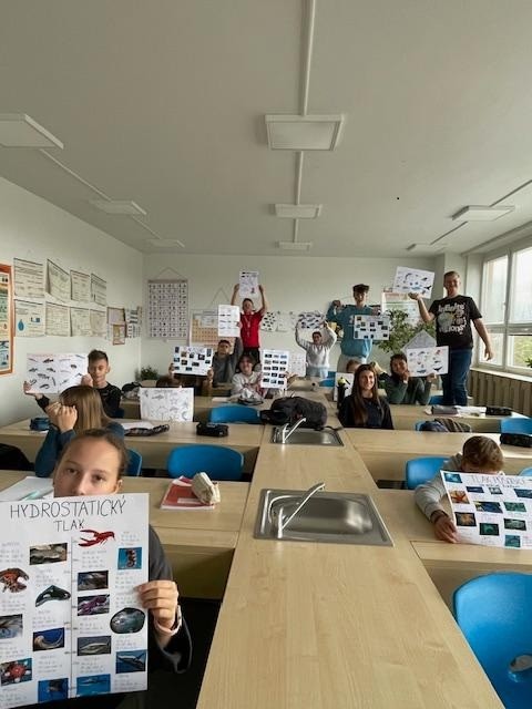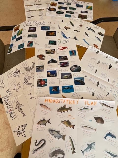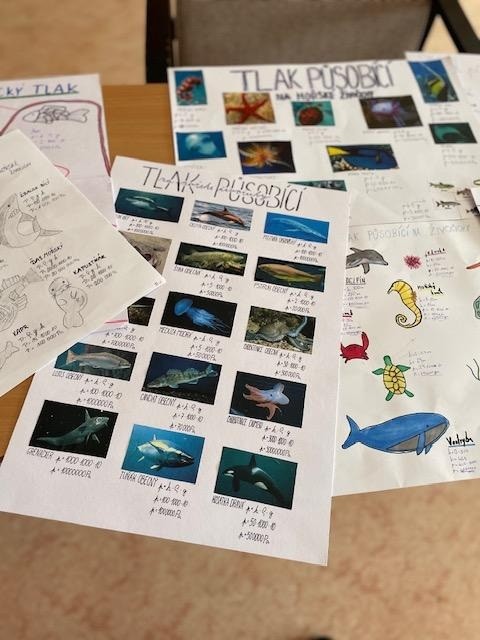 Ve fyzice jsme počítali, jak velký hydrostatický tlak působí na živočichy žijící v různých hloubkách. Někteří si vytiskli obrázky, jiní malovali ručně různé ryby a živočichy. V každém případě vznikly hezké, pestré projekty. Důkladně jsme si procvičili a stále opakovali, na jakých veličinách hydrostatický tlak závisí. Naučili jsme se to všichni. Hustotu mořské vody jsme zaokrouhlovali. Při hledání živočichů jsme se také dozvěděli spoustu zajímavostí z hlubin. Například, že v roce 2022 byl objeven nový druh chobotnice, v hloubce skoro 7 000 metrů. Je úžasné, že měkké tělo chobotnice dokáže odolat tak obrovskému tlaku.