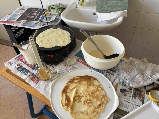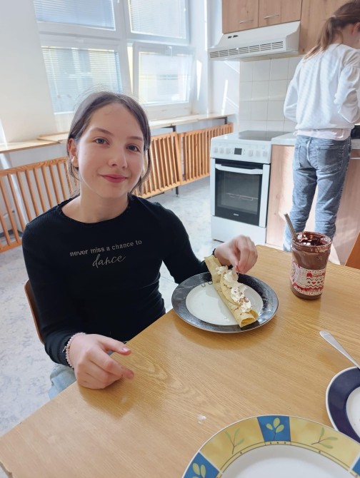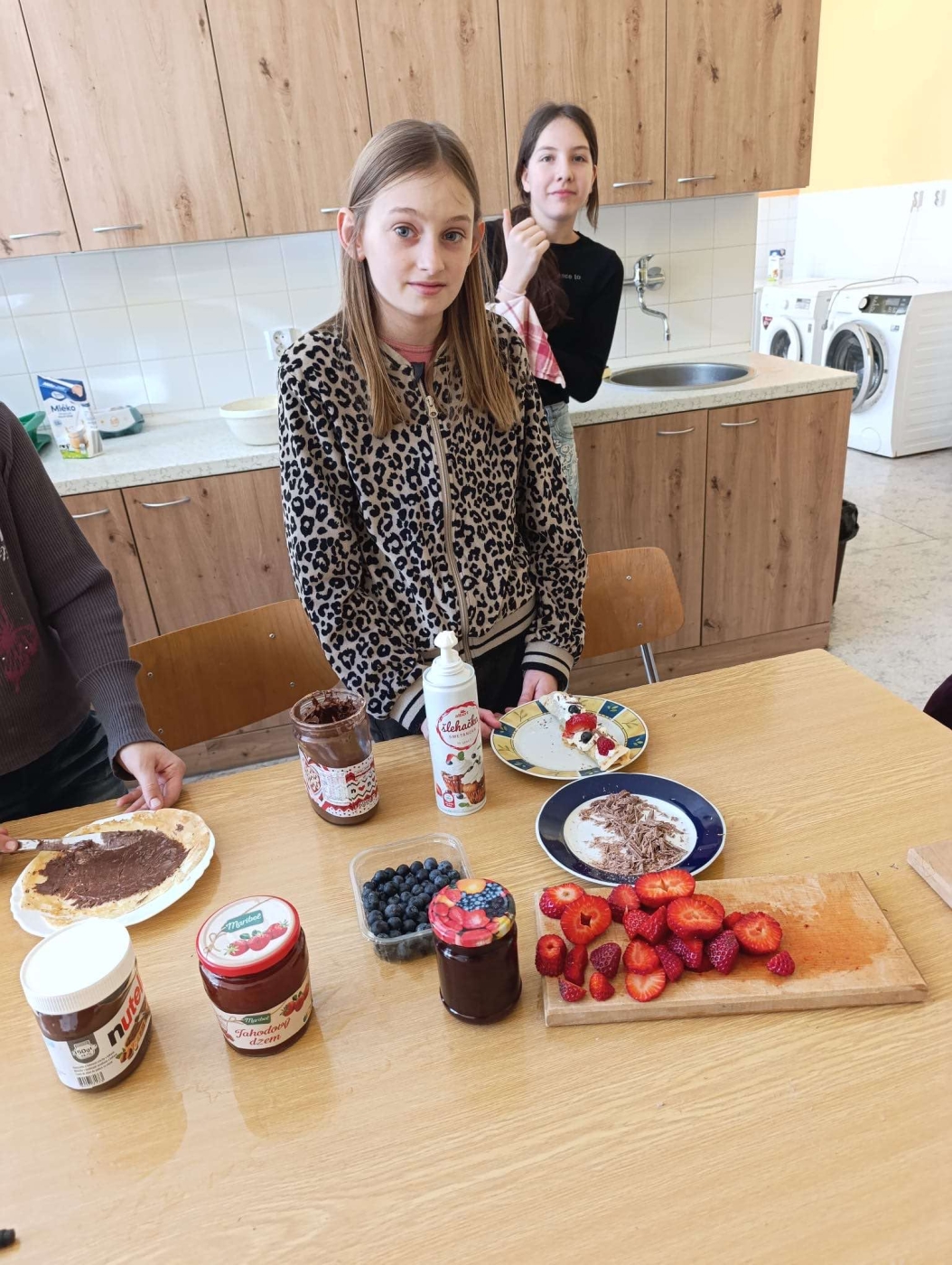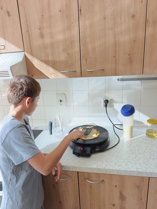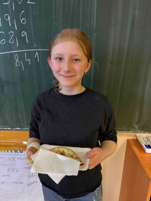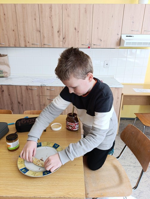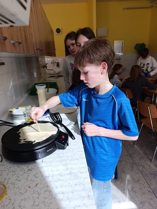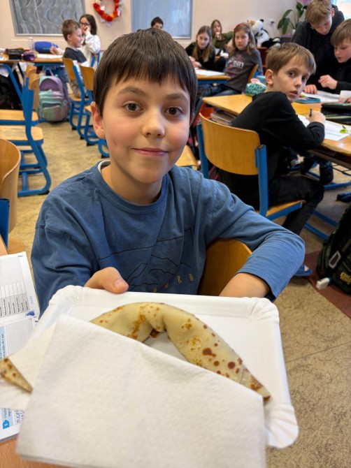 Žáci pátého ročníků prožili hodinu angličtiny seznámením se svátkem Pancake Day, který slaví lidé v anglosaských zemích. Informace nasávali doslova všemi smysly, když se dozvídali potřebné reálie a studovali recept na palačinky, který nezůstal pouze na papíře. Hodina angličtiny provoněla celou školu vůní oblíbeného dezertu s různými druhy náplní. A možná si ani neuvědomili, že si rozšířili slovní zásobu o názvy ingrediencí a kuchyňského náčiní, dokonce právě probíraná gramatika slova WOULD potřebná pro prosby a nabídky našla svoje uplatnění. „Would you like pancake? Yummy, yummy!“