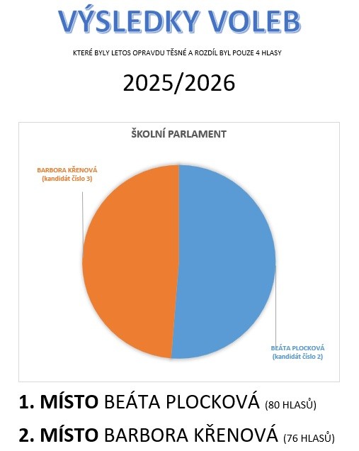 Na začátku školního roku proběhly po první společné schůzce žákovského parlamentu VOLBY. Ty byly velice těsné a o pouhé čtyři body zvítězila Beáta Plocková, která se tak stává předsedkyní našeho parlamentu. Barbora Křenová se tímto stává místopředsedkyní a věříme, že společně budou tvořit skvělý tým. GRATULUJEME!
