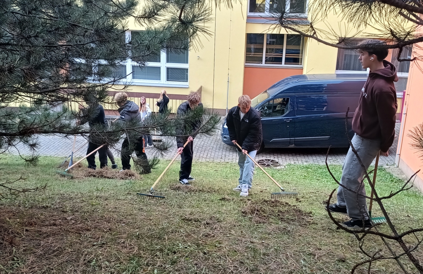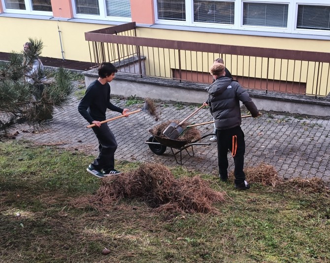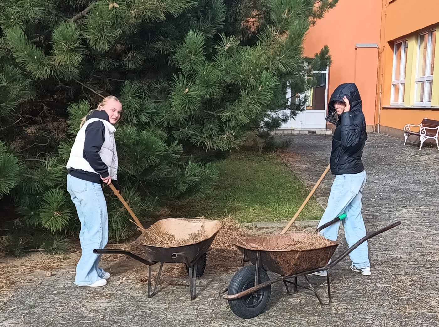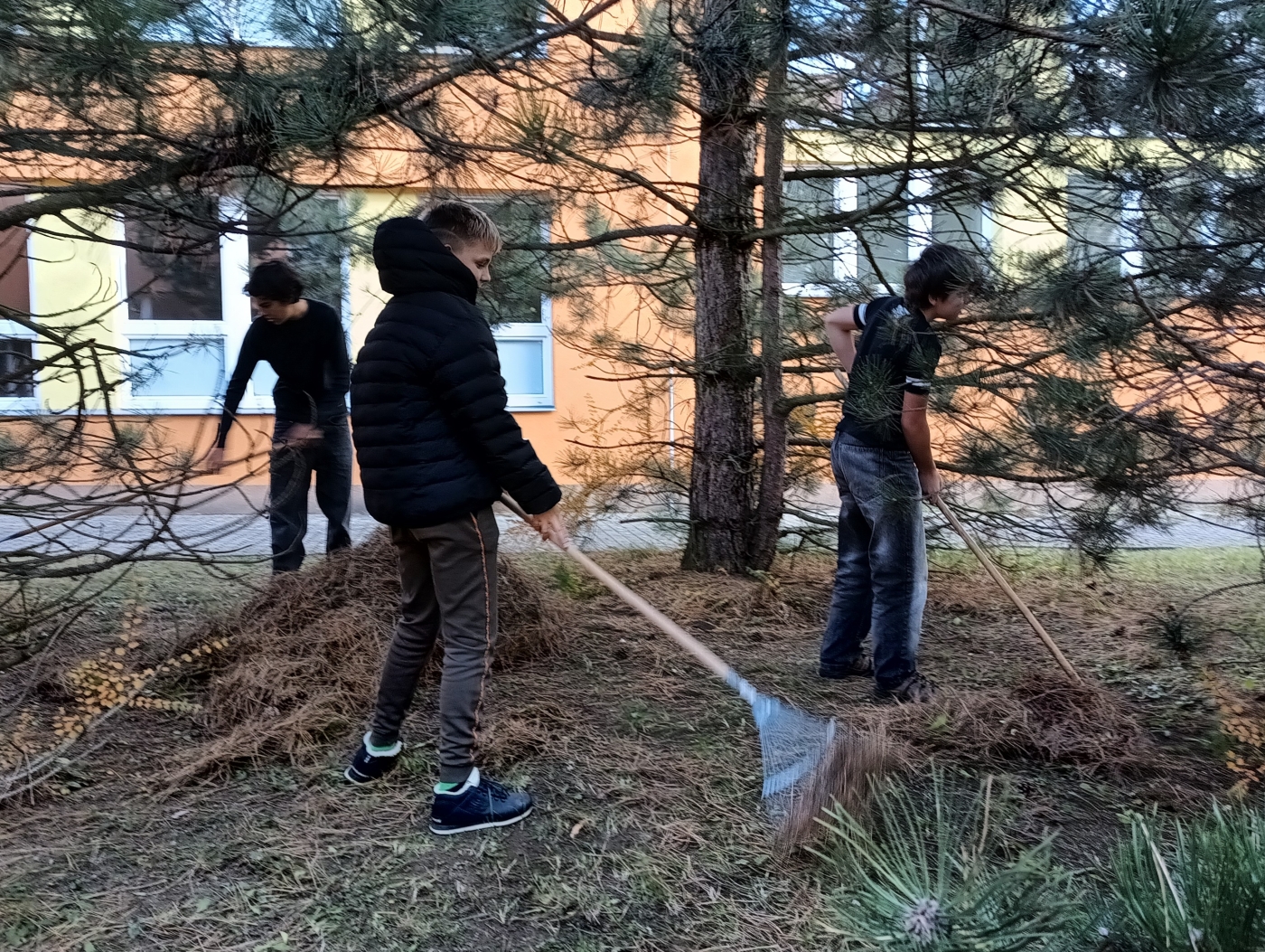 V rámci pracovních činností se žáci aktivně podílejí na přípravě školního pozemku na zimní období. Odklízejí spadané listí a jehličí, čímž nejen pomáhají udržovat okolí školy čisté, ale zároveň se učí péči o přírodu a zodpovědnosti za společný prostor.