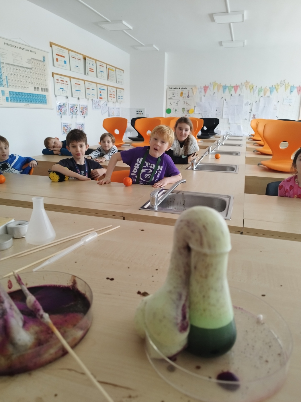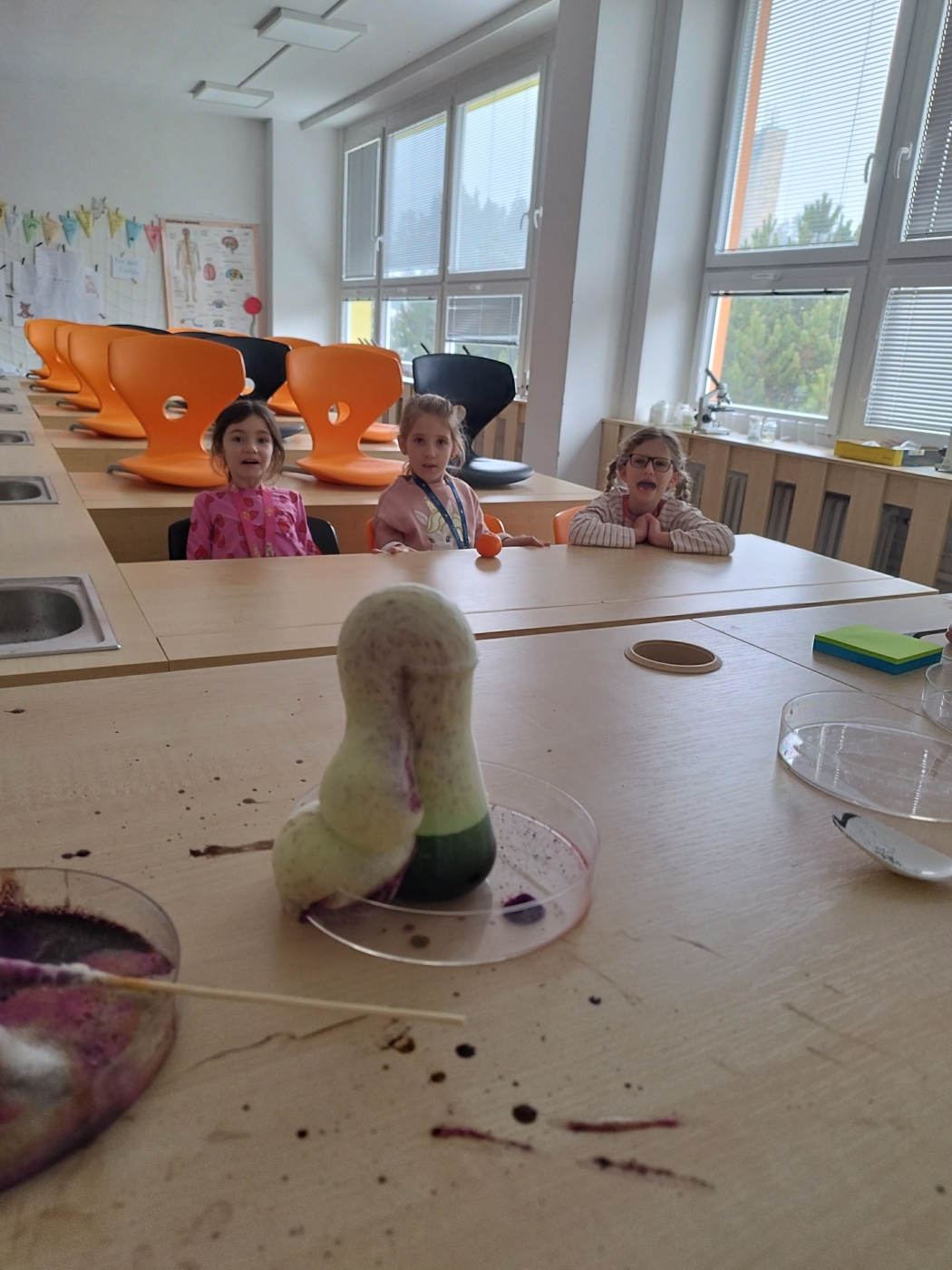 Velký úspěch sklidil také pokus „jarová sopka", při kterém jsme si ukázali chemickou reakci plnou bublin a pěny. Nejenže pokus vypadal efektně, ale zároveň děti naučil, že i obyčejné věci z domácnosti mohou skrývat vědecké kouzlo.