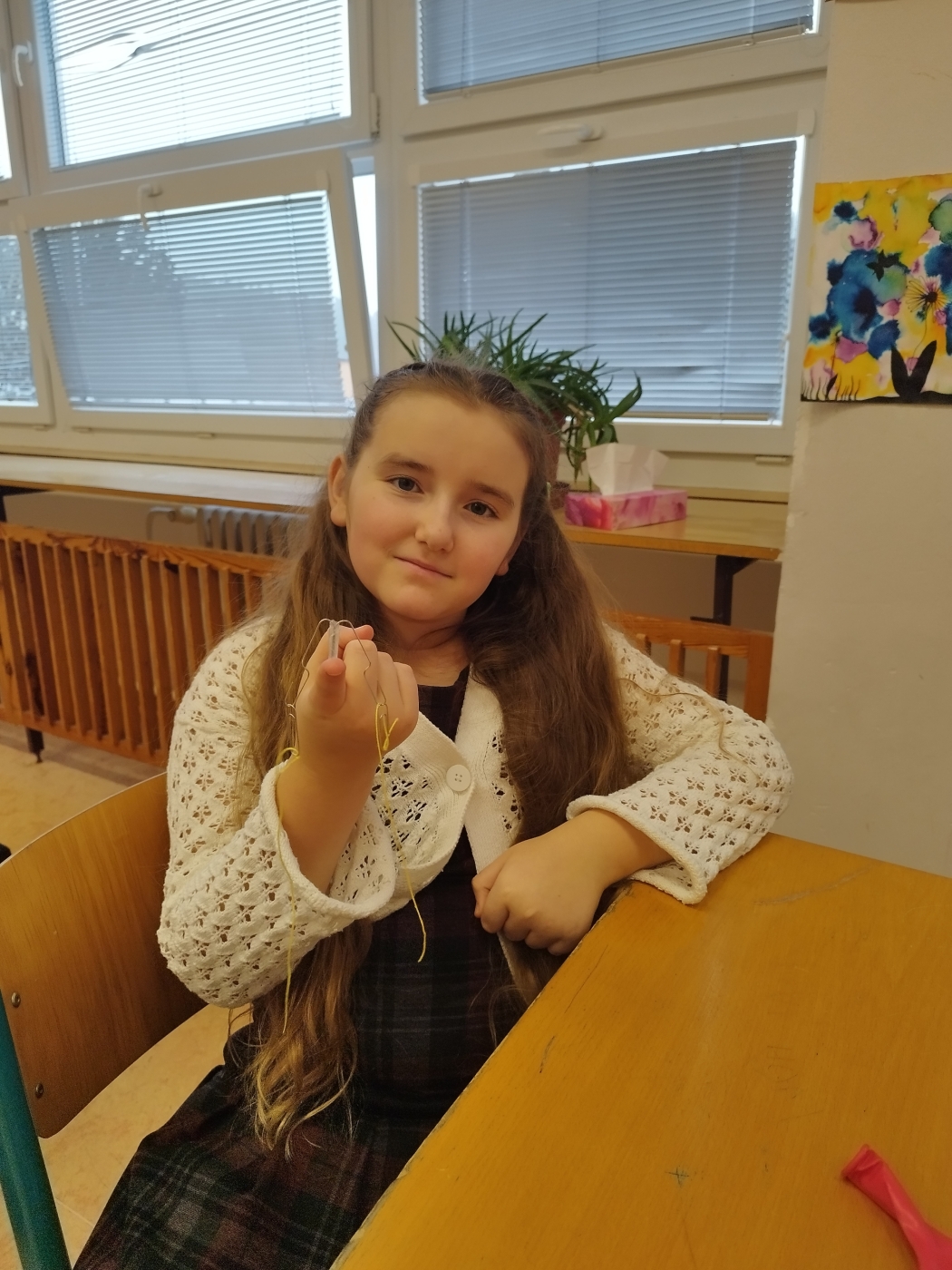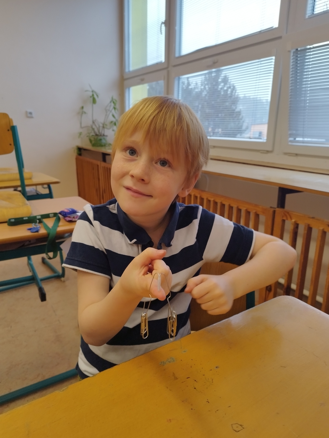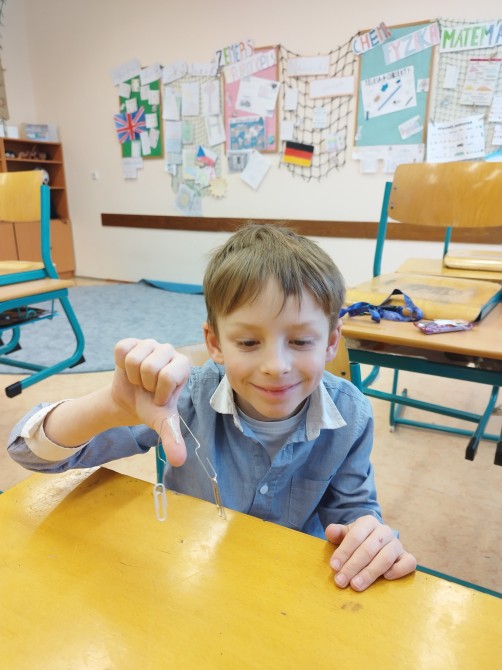 Na závěr nás čekal zdánlivě jednoduchý, ale velmi zajímavý pokus. Z kancelářských sponek jsme si vyrobili váhu a pomocí balónků jsme se pokusili zvážit vzduch. Děti tak zjistily, že i když vzduch nevidíme, má svou hmotnost.