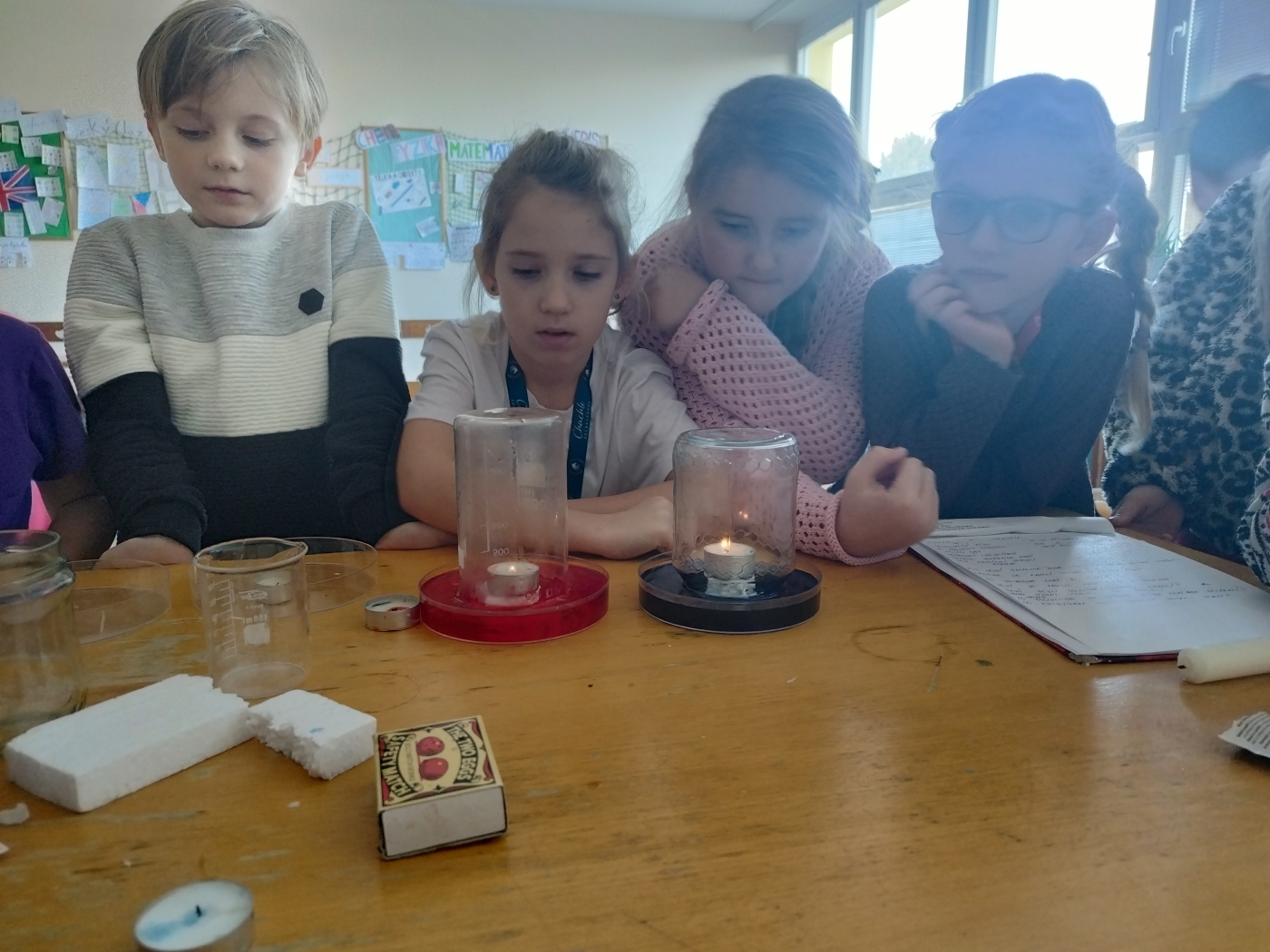 Na začátku jsme se zaměřili na oheň a kyslík. Zkoumali jsme, proč oheň ke svému hoření kyslík potřebuje a jaký je rozdíl mezi kyslíkem a vzduchem, který běžně dýcháme. Děti pozorovaly jednoduchý pokus, při kterém bylo vidět, že bez přístupu kyslíku plamen zhasne, a společně jsme si povídali o tom, proč k tomu dochází a co z toho můžeme vyvodit.
