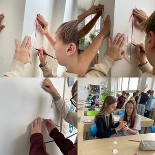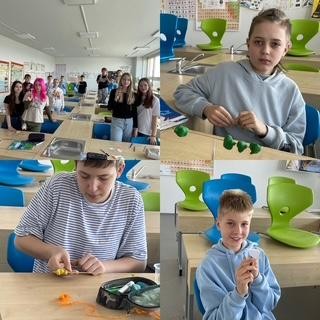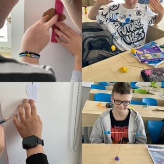 Sedmáci se v hodině fyziky pustili do zkoumání těžiště. Dozvěděli se, že je to bod, kde působí gravitační síla a jeho poloha rozhoduje o tom, jak snadno se těleso převrhne. Čím níž je těžiště, tím je těleso stabilnější. Nejprve si z plastelíny vytvořili kuličky: jednu malou a jednu větší. Každou umístili na opačný konec špejle a hledali bod, ve kterém nastává rovnováha. Hledali těžiště. Sami zjistili, že těžiště je vždy blíž k těžší kuličce. Bylo to jednoduché, ale názorné. Potom si vystřihli nepravidelný tvar – „šišoid". Několikrát ho zavěsili na nit, závěs tužkou prodloužili, v průsečíku přímek bylo těžiště. Děti měly velkou radost, když jejich „šišoid" podepřený v těžišti zůstal v klidu a nespadl.
