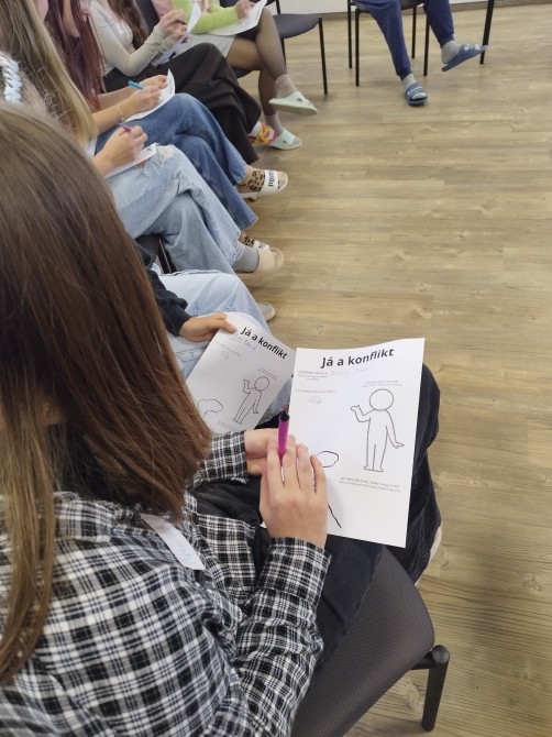 Součástí programu bylo také vysvětlení pojmů eskalace a deeskalace. Děti si na toto téma vyzkoušely ve skupinkách krátké scénky, ve kterých hledaly způsoby, jak lze konfliktní situace řešit klidněji a bez zbytečného vyhrocení. Měly tak možnost uvědomit si, jak na ně působí konflikty a jak důležité je volit vhodná slova.