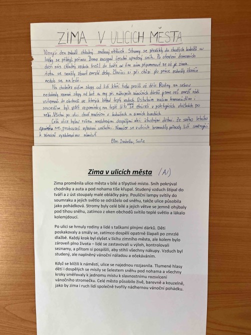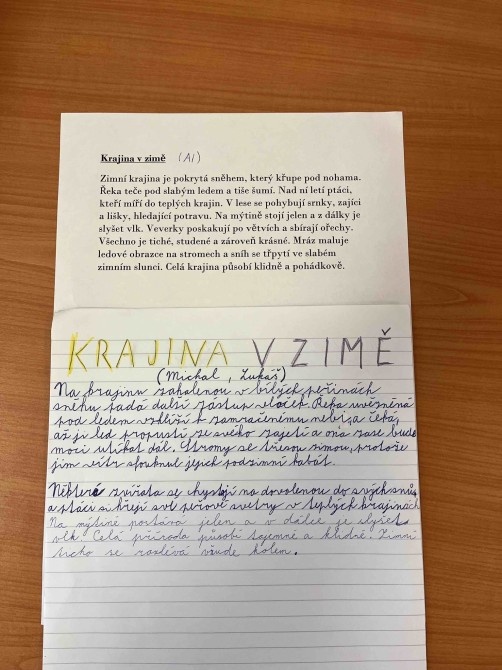 V hodinách českého jazyka došlo k novodobému literárnímu souboji, kde se proti sobě postavili žáci osmé třídy a "neviditelný" soupeř – umělá inteligence. Slohovým útvarem, který měli všichni za úkol vytvořit, bylo líčení, subjektivně zabarvený popis, do kterého autoři promítají své nálady a pocity.