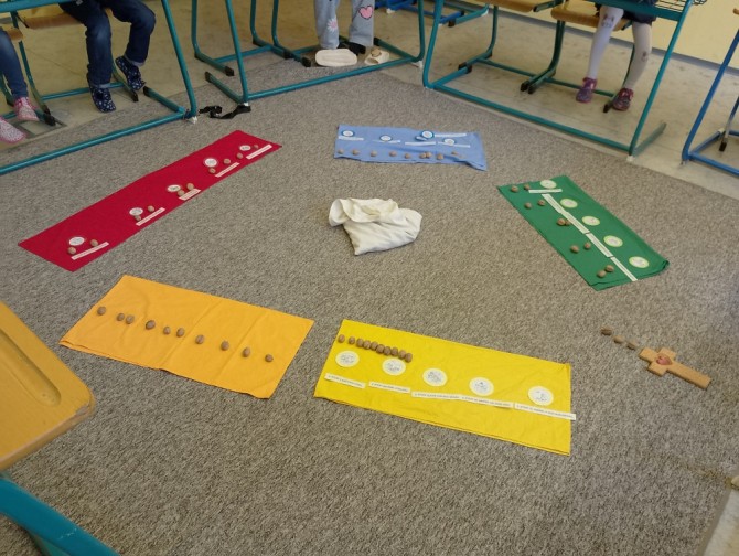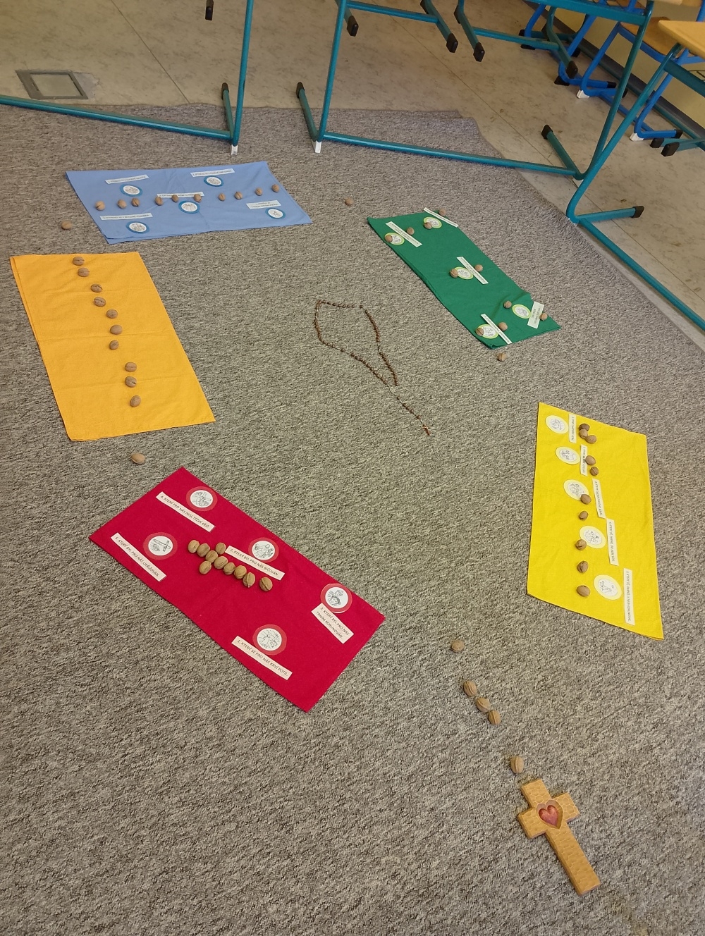 Podzimní náboženství nám přineslo spoustu nových věcí. Hledali jsme korálky růžence, které jsme pak skládali dohromady. Skládali jsme růženec z kaštanů. Také jsme si ukázali, že bible je jako knihovna plná knih. Zopakovali jsme si vybavení kostela. Modlili jsme se pomocí obrázků. Také jsme si ukázali na globusu, kde leží země Izrael a že z něho se rozšířilo Světlo do celého světa, které celý svět objímá. Kdo je tím Světlem? Můžeme ho spatřit i dnes? Lépe jsme se poznali, zpívali jsme si a také jsme zažili spolu spoustu zábavy...