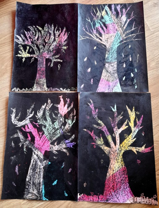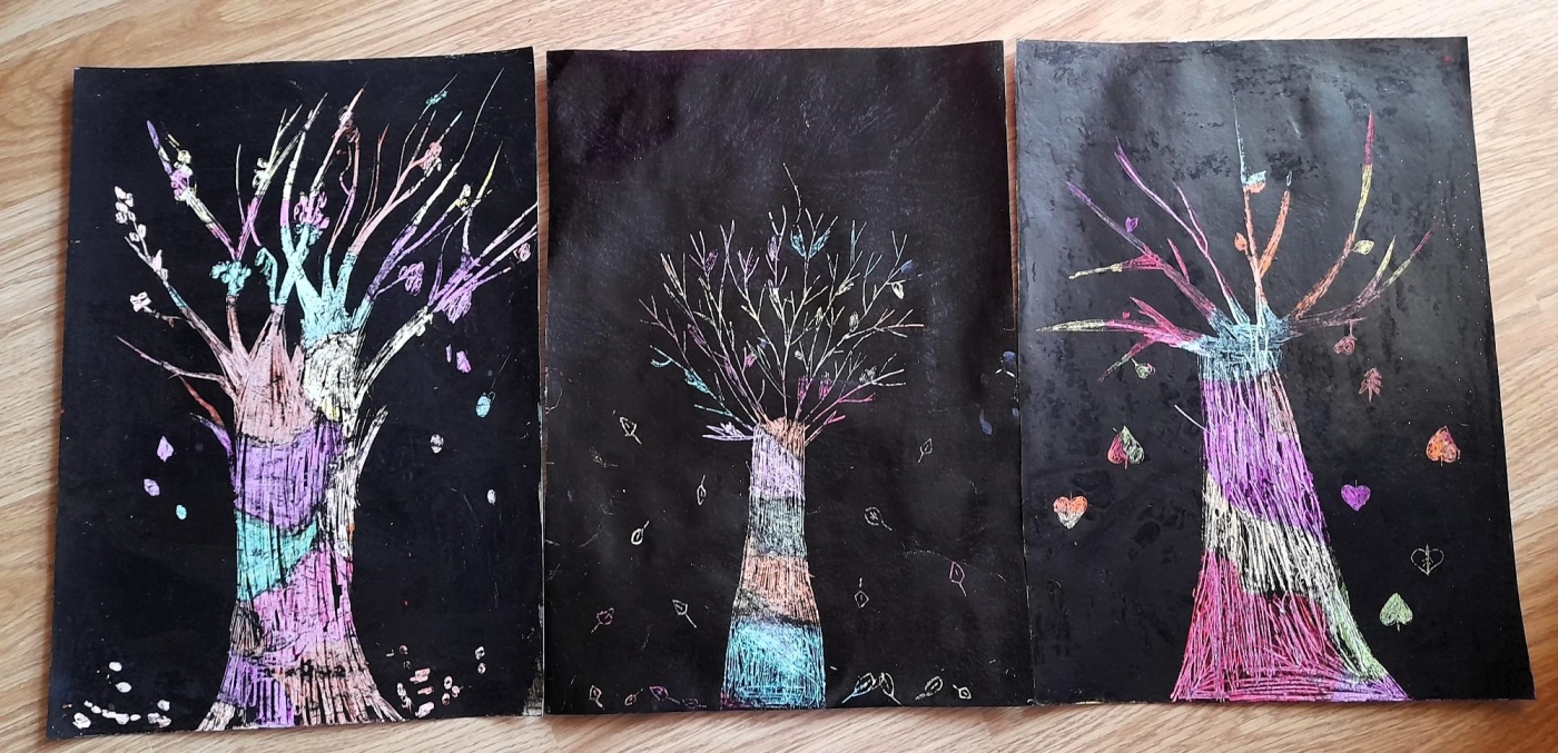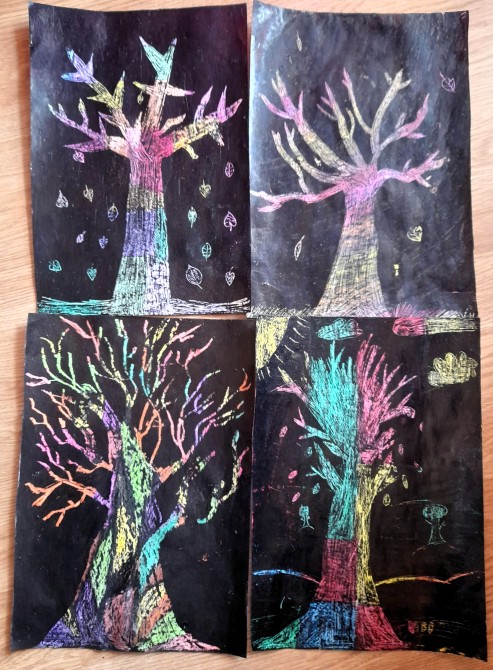 Žáci 6. A završili podzimní téma ve výtvarné výchově vyškrabávanou technikou. Nejdříve silná vrstva voskovek, potom černá tuš, která vše zakryla. A nyní již něco ostrého – špejle, nůžky, špendlík. Vyškrabali jsme si podzimní stromy, padající i spadané listí. Teď už změníme téma, přijde totiž zima.