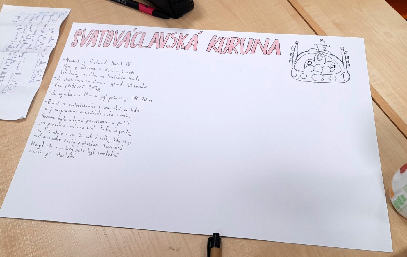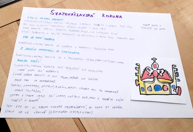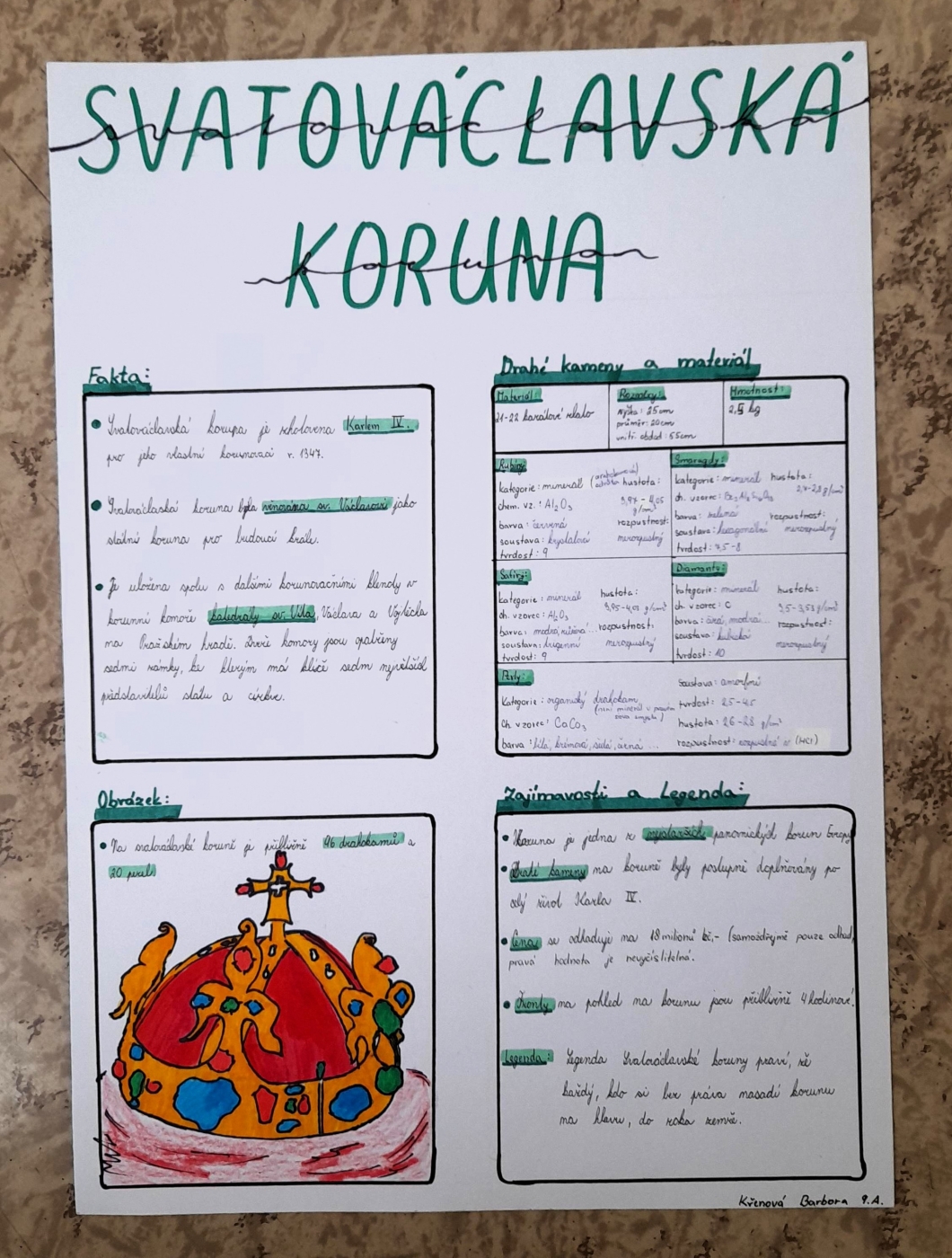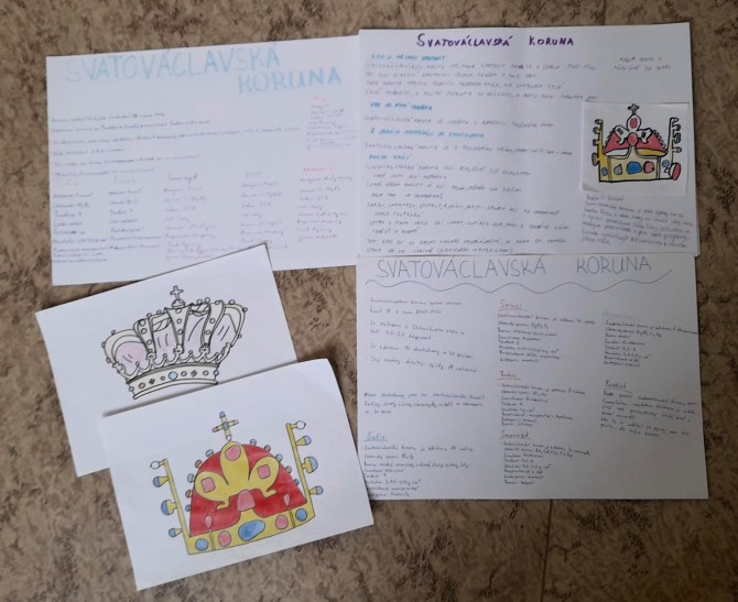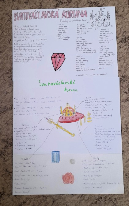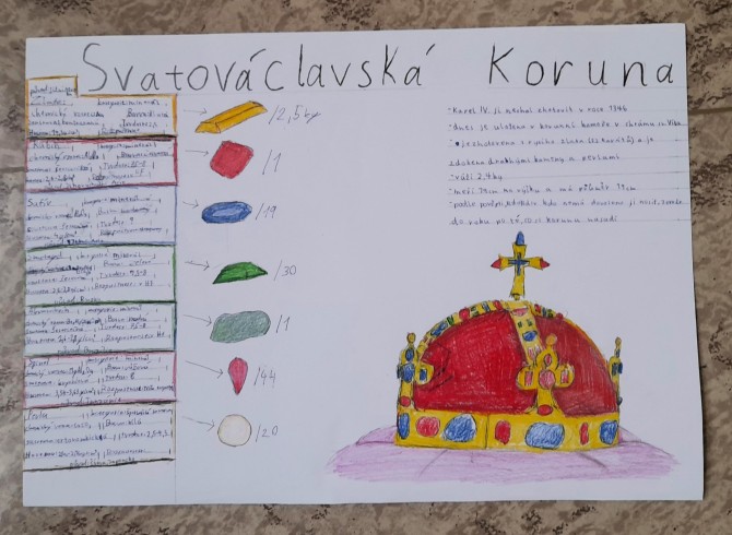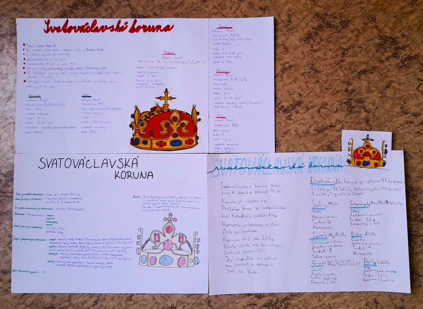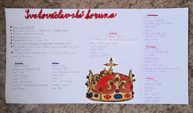 Žáky 9. ročníku čekalo na začátku přírodopisného vzdělávání téma minerály a horniny. Po učivu, jaký je mezi nimi rozdíl, jak vznikají a co u nich lze určit, nastalo projektové vyučování. A kde se nachází velké množství minerálů, přesněji řečeno drahokamů? Na svatováclavské koruně. Nejdříve bylo potřeba si zopakovat, kdo ji nechal zhotovit a při jaké příležitosti, tedy trošku historie. Potom už začala přírodopisná část – materiál, z jakého je zhotovena, které drahokamy zde najdeme, v jakém počtu a jejich popis. Zopakovali jsme si tak chemické vzorce, stupnici tvrdosti, zjistili barvu, hustotu a jejich rozpustnost v různých látkách. Postupně jsme se také seznamovali s různými názvy soustav – klencová, krychlová.... Nemohly chybět ani zajímavosti, třeba kolik taková koruna váží, jaké jsou její rozměry a kolik perel se zde nachází. Připojili jsme ještě český jazyk a pověst o svatováclavské koruně a výchovu k občanství, protože bychom měli vědět, kde je koruna s ostatními korunovačními klenoty uschována a kdo má klíče od dané místnosti.