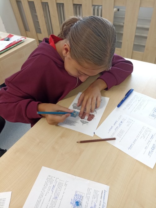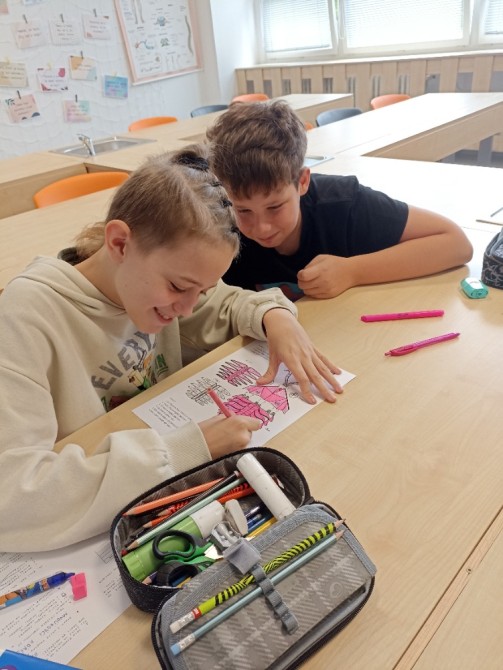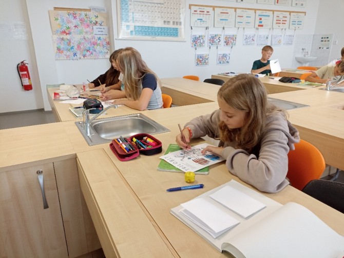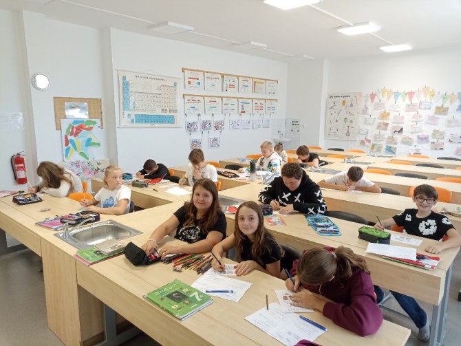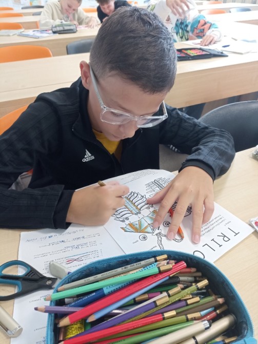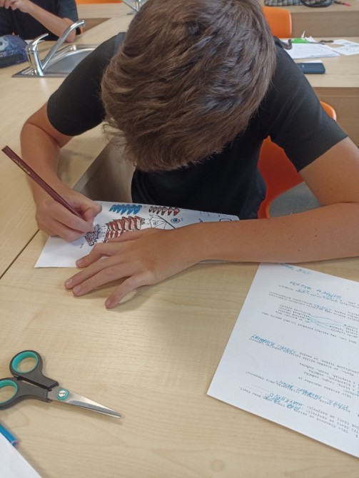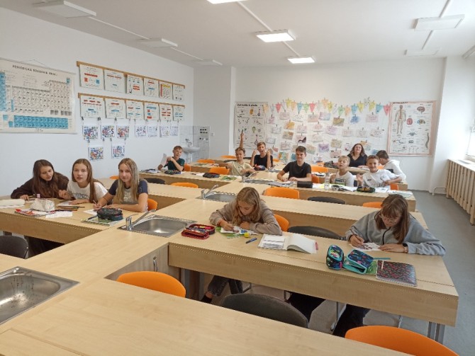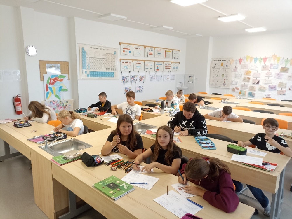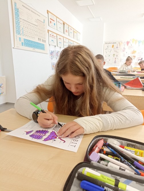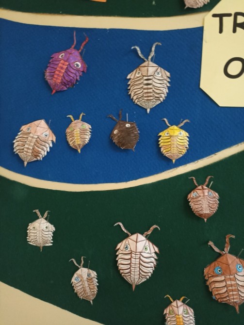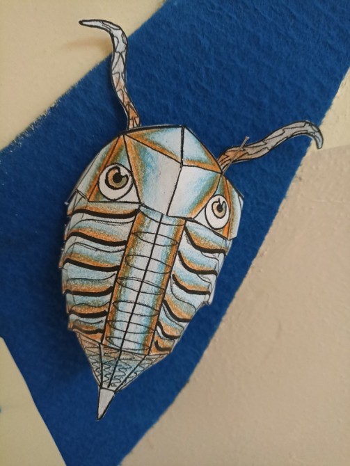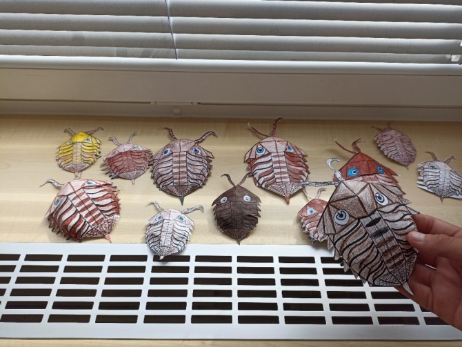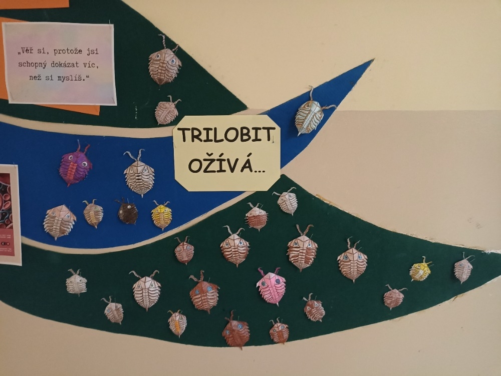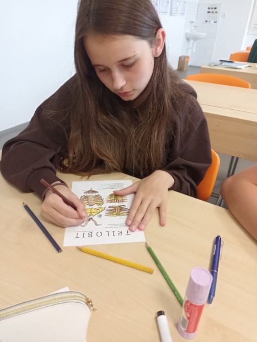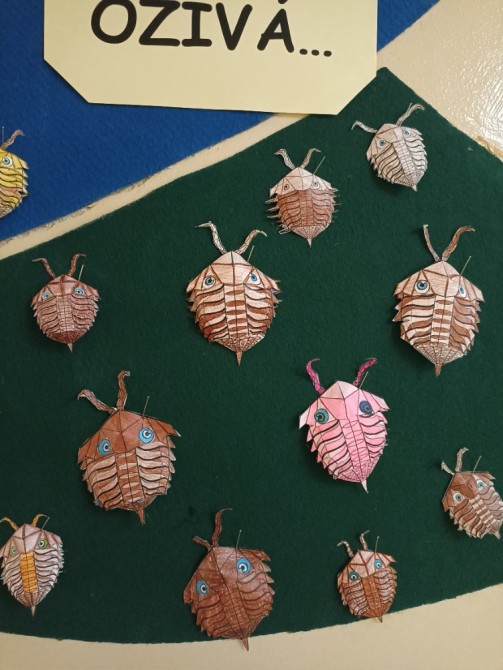V hodině přírodopisu jsme se při opakování učiva se sedmáky dostali k tématu členovci. Abychom si přiblížili, jak vypadal vyhynulý trilobit, žáci si ho mohli sami „oživit". Každý dostal natištěný list s obrázkem trilobita, který si nejprve vymaloval, poté vystřihl a nakonec slepil. Díky tomu si mohli všimnout, že tělo trilobita se skládá ze tří částí. Žáky aktivita bavila a pomohla jim lépe si představit stavbu tohoto pravěkého zástupce členovců.