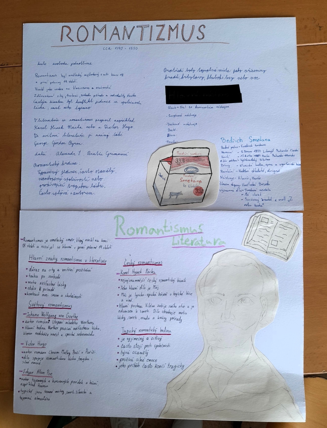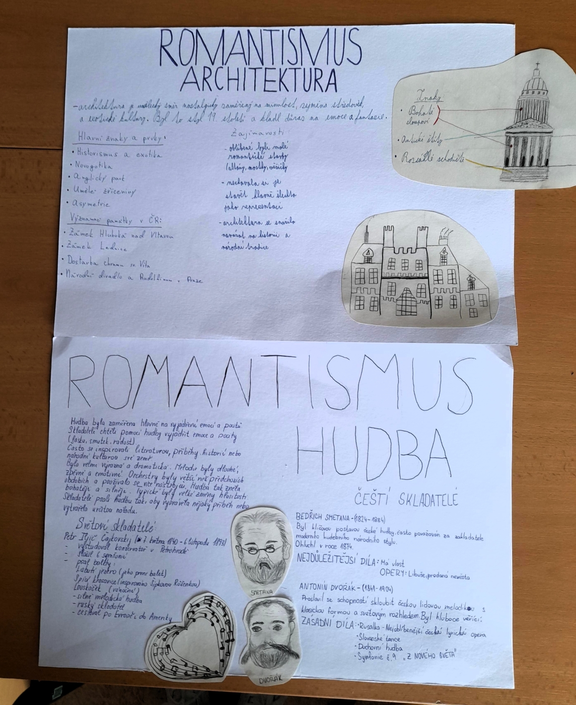 V hodinách hudební výchovy jsme se v 2. pololetí v 8. třídě začali zabývat obdobím romantismu. Abychom lépe pochopili souvislosti, bylo třeba si některé věci zopakovat, např. romantickou literaturu, ale také se něco nového dozvědět. Každá skupinka si vytáhla téma, které za pomocí informací z internetu zpracovala. Vznikly plakáty doplněné obrázky. V další hodině každá skupina svoje téma odprezentuje, my se dozvíme obecně o romantismu, co se psalo, co se stavělo a malovalo, jak chodili lidé oblékaní a už zbývá se vrhnout podrobněji na hudbu tohoto období.
