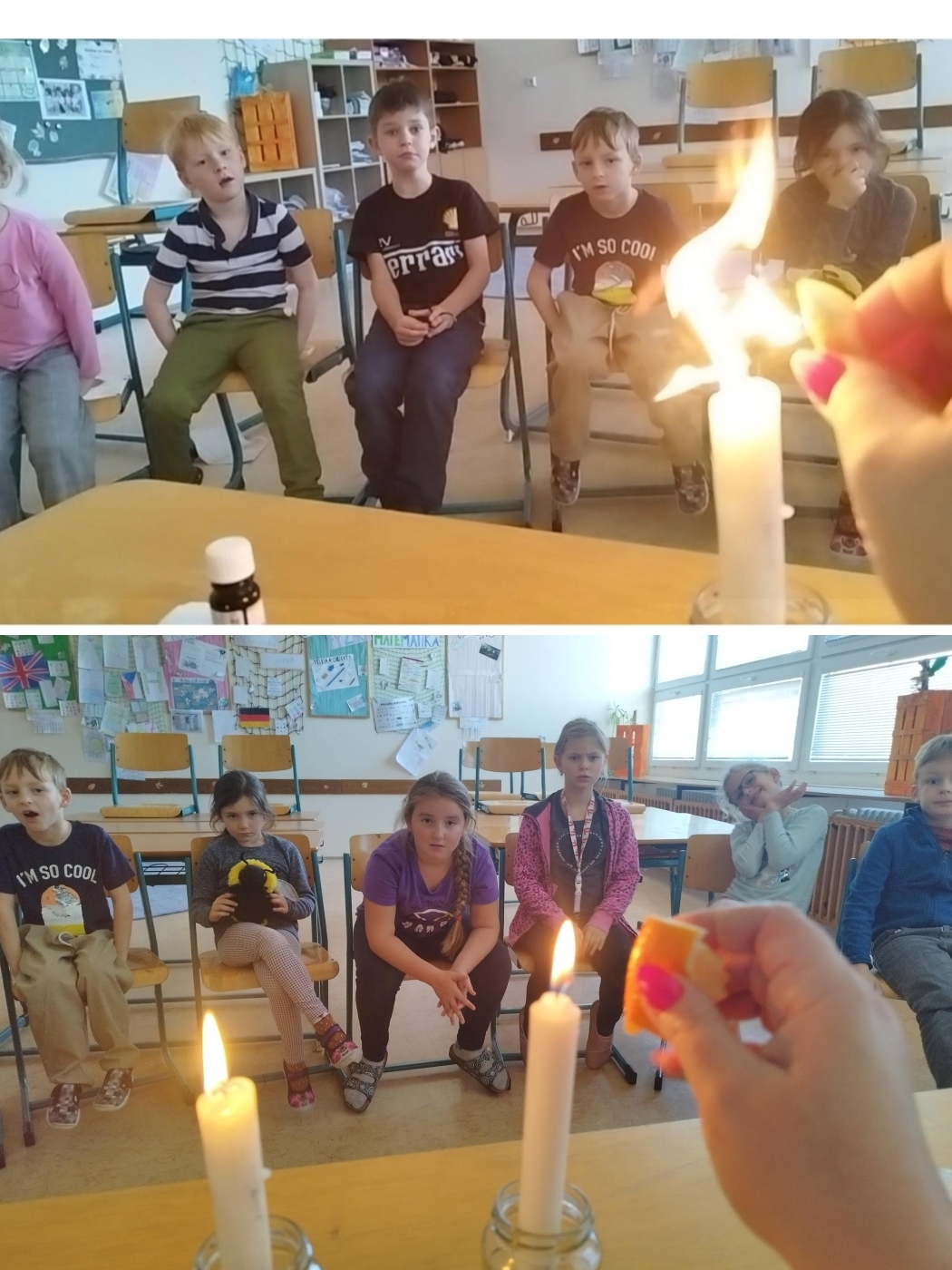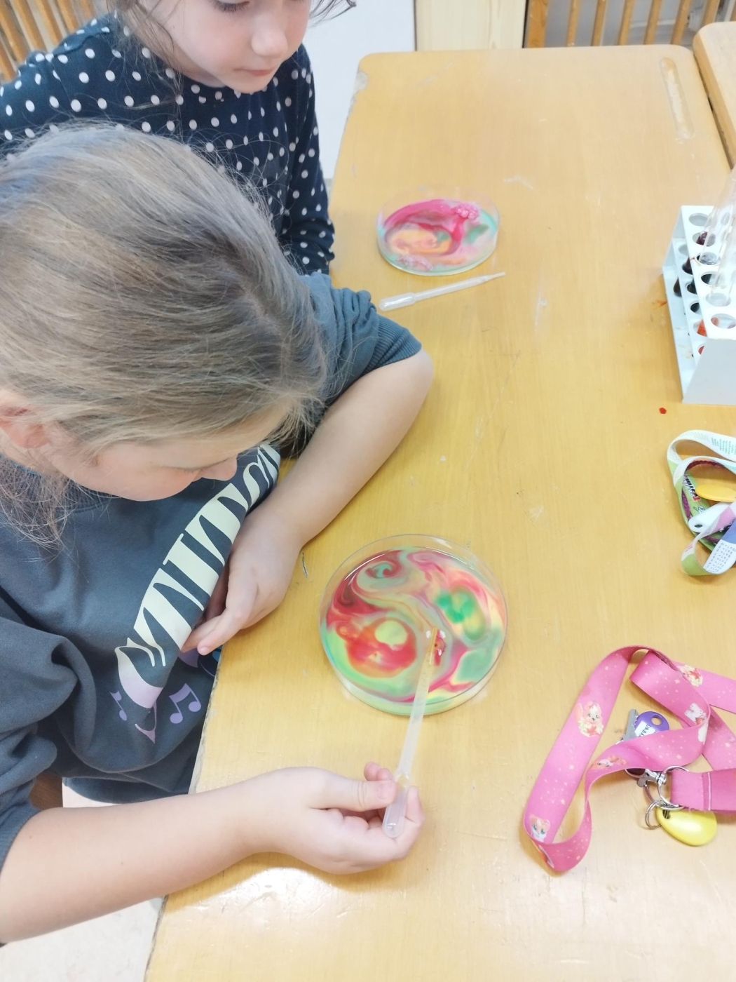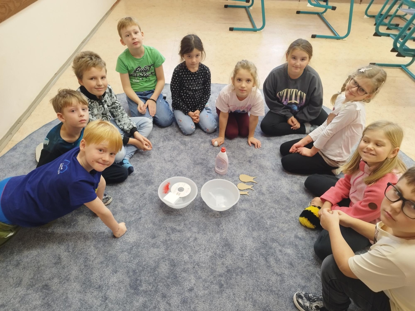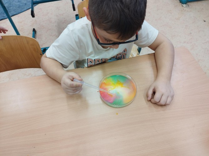 Společně jsme objevovali limonen, látku ukrytou v citrusových slupkách, a sledovali jsme, jak dokáže rozpouštět tuky. Zkoumali jsme povrchové napětí, díky kterému se některé předměty dokážou „udržet" na hladině vody, a vytvořili jsme si i barevnou mléčnou duhu, která děti doslova okouzlila.