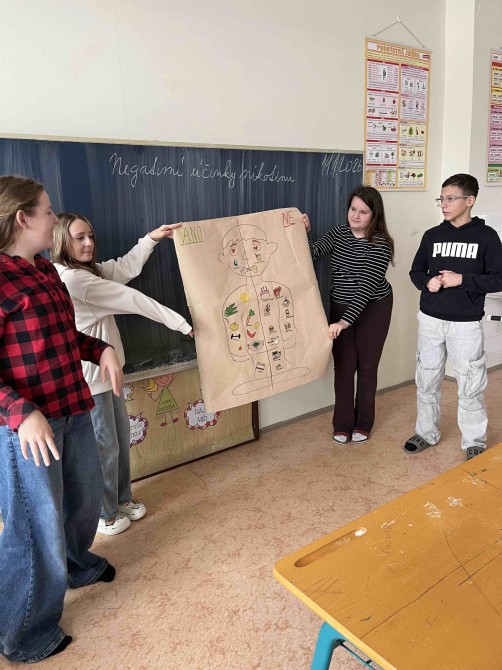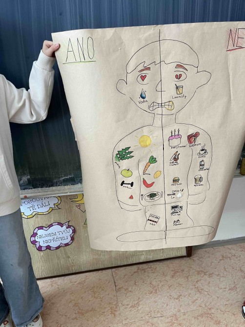V několika hodinách Výchovy ke zdraví se naši sedmáci zamysleli nad tím, co si představují pod pojmem zdravý životní styl. V první části tohoto projektu skupinky žáků diskutovaly nad tím, co vše podle nich spadá do zdravého životního stylu. Potom své znalostí, vědomosti a postřehy sedmáci využili k sestavení pěti základních oblastí, na které se blíže zaměřili. A to vyvážená strava, pohyb a aktivita, duševní hygiena, sociální zdraví a prevence rizik. Poslední částí projektu bylo vytvoření kreativního plakátu, kde jedna postava kombinuje dva světy, a to zdravou a nezdravou část života.